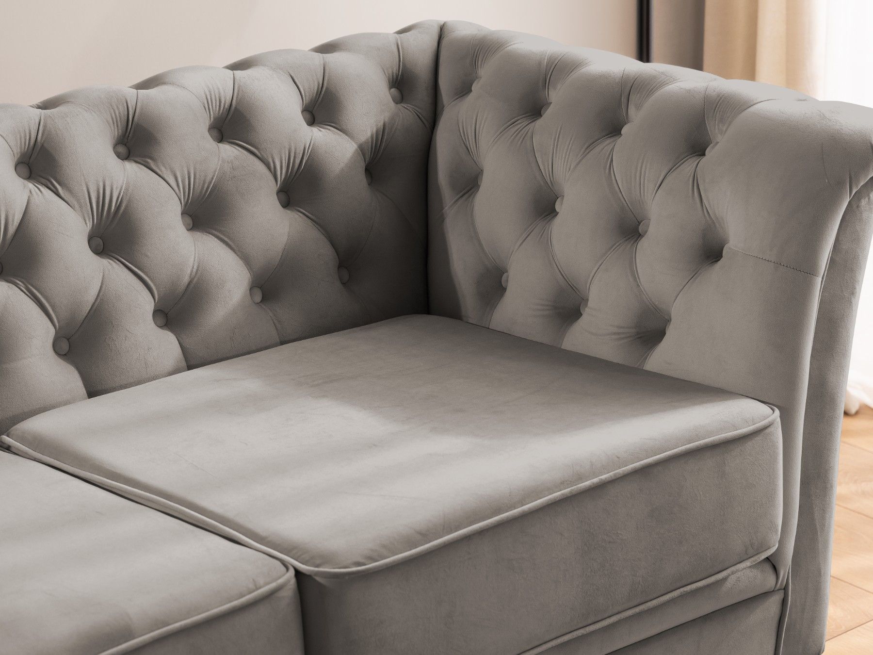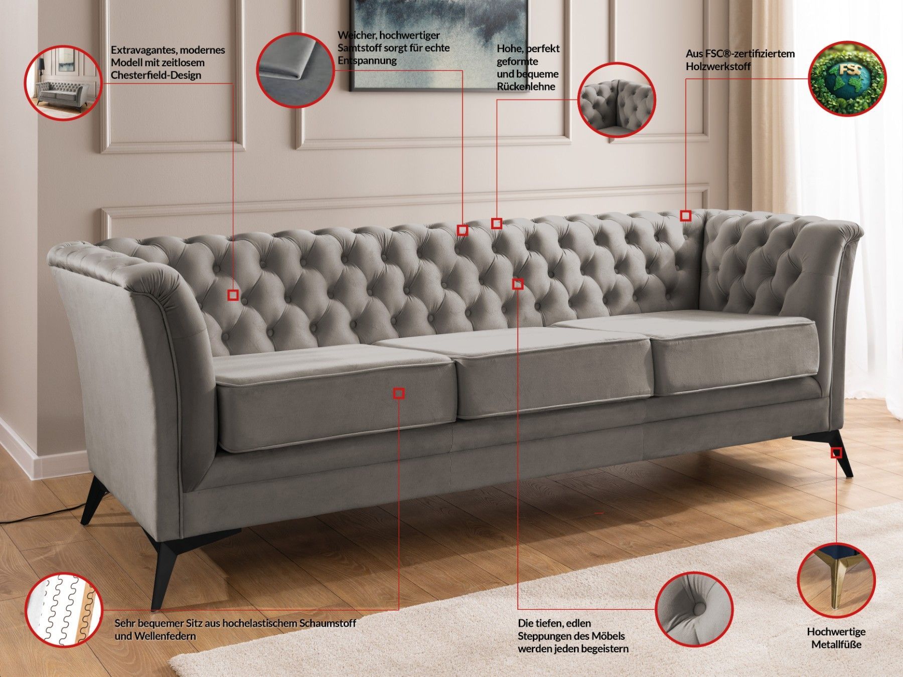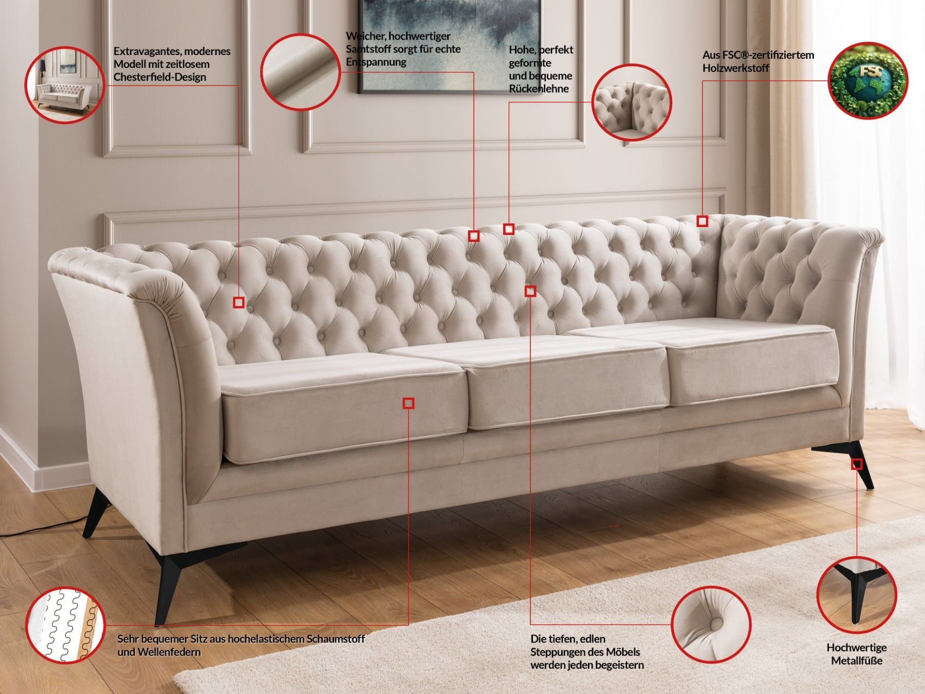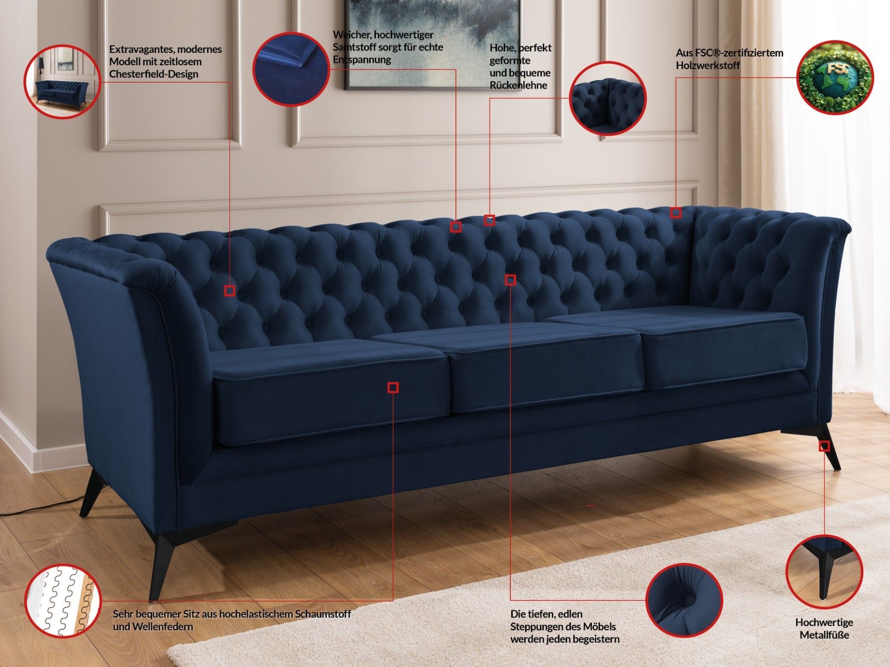 Whitby - Chesterfield Luxus 3-Sitzer Sofa aus Samt mit schwarzen Füßen