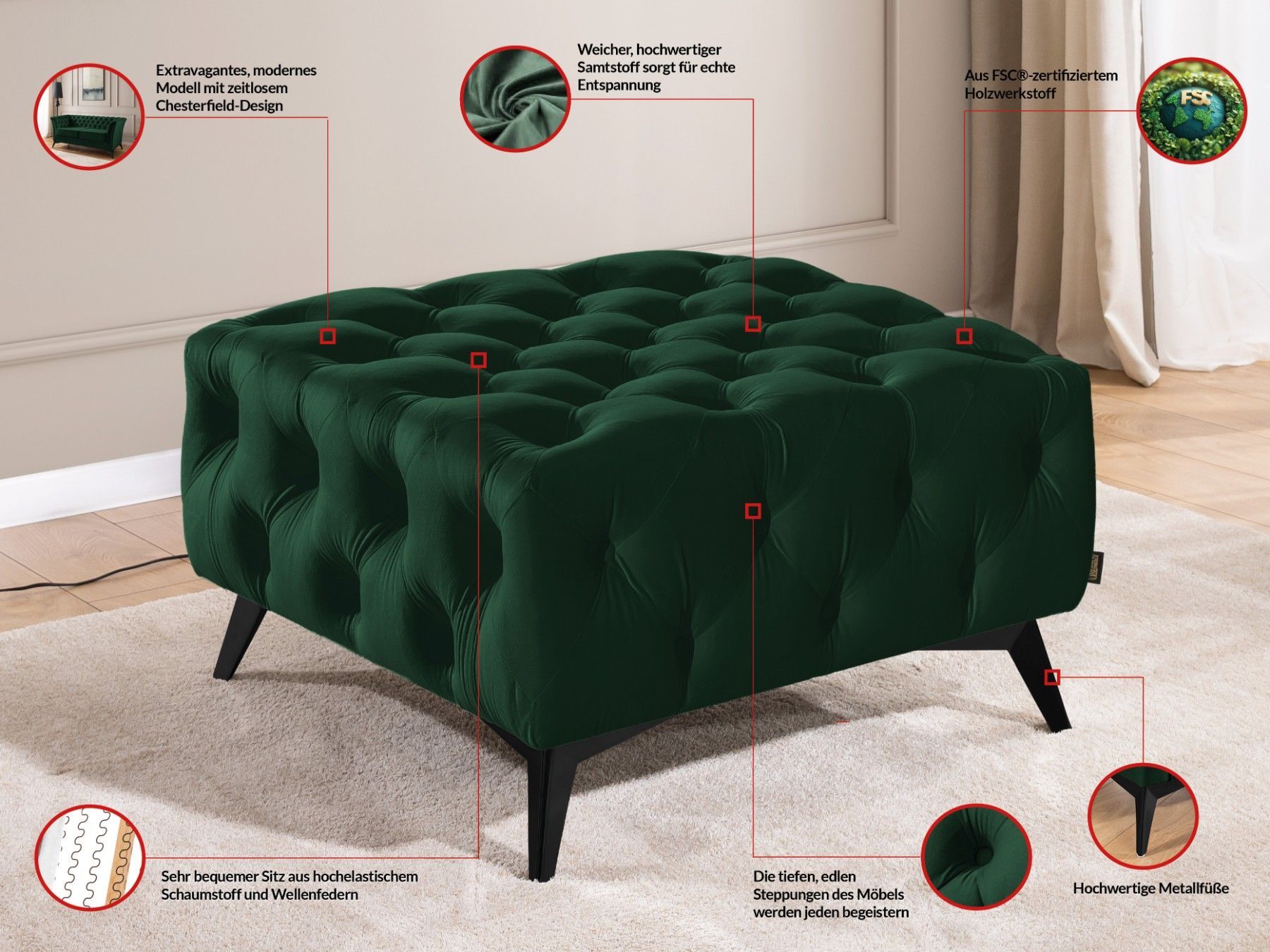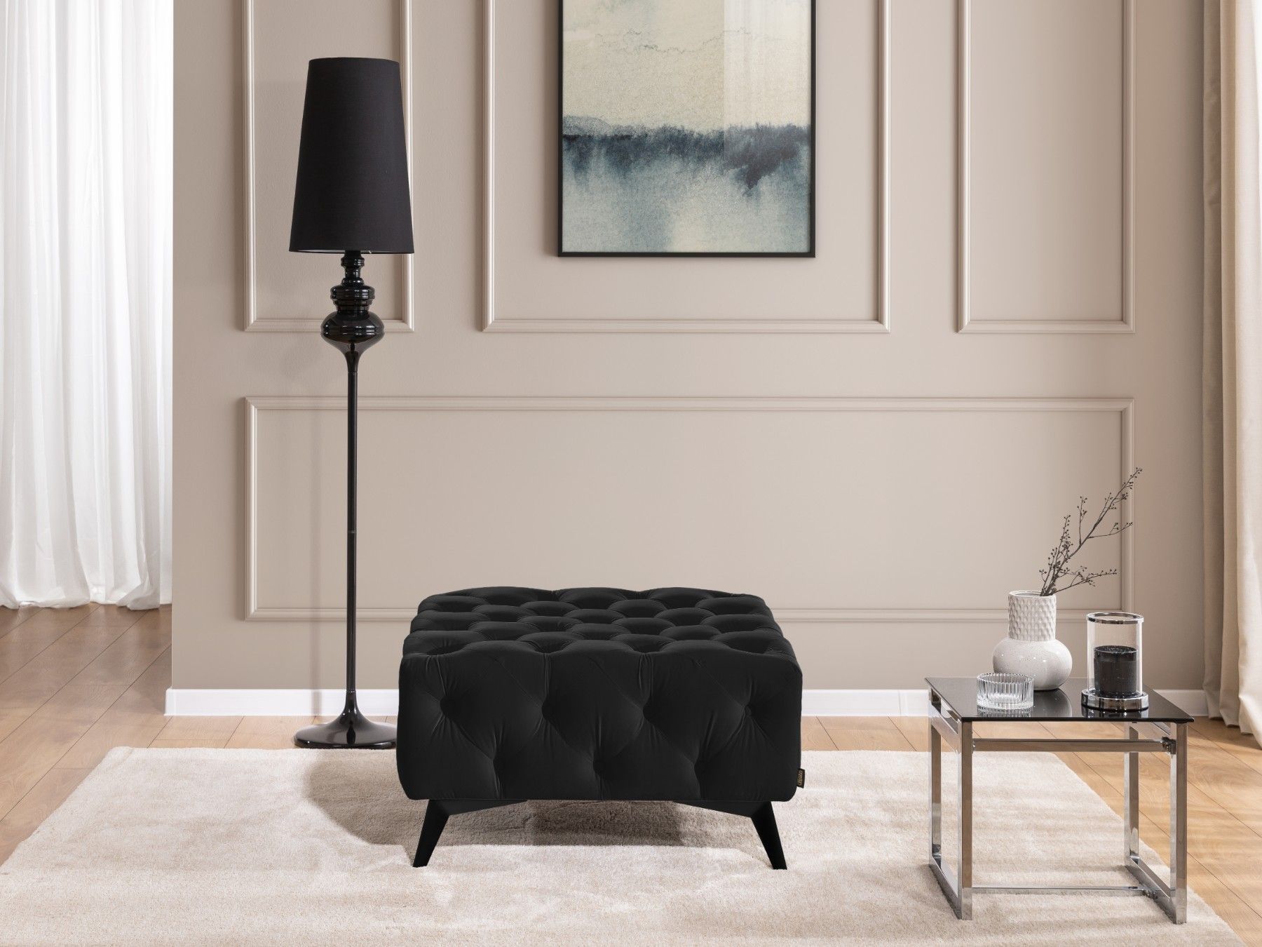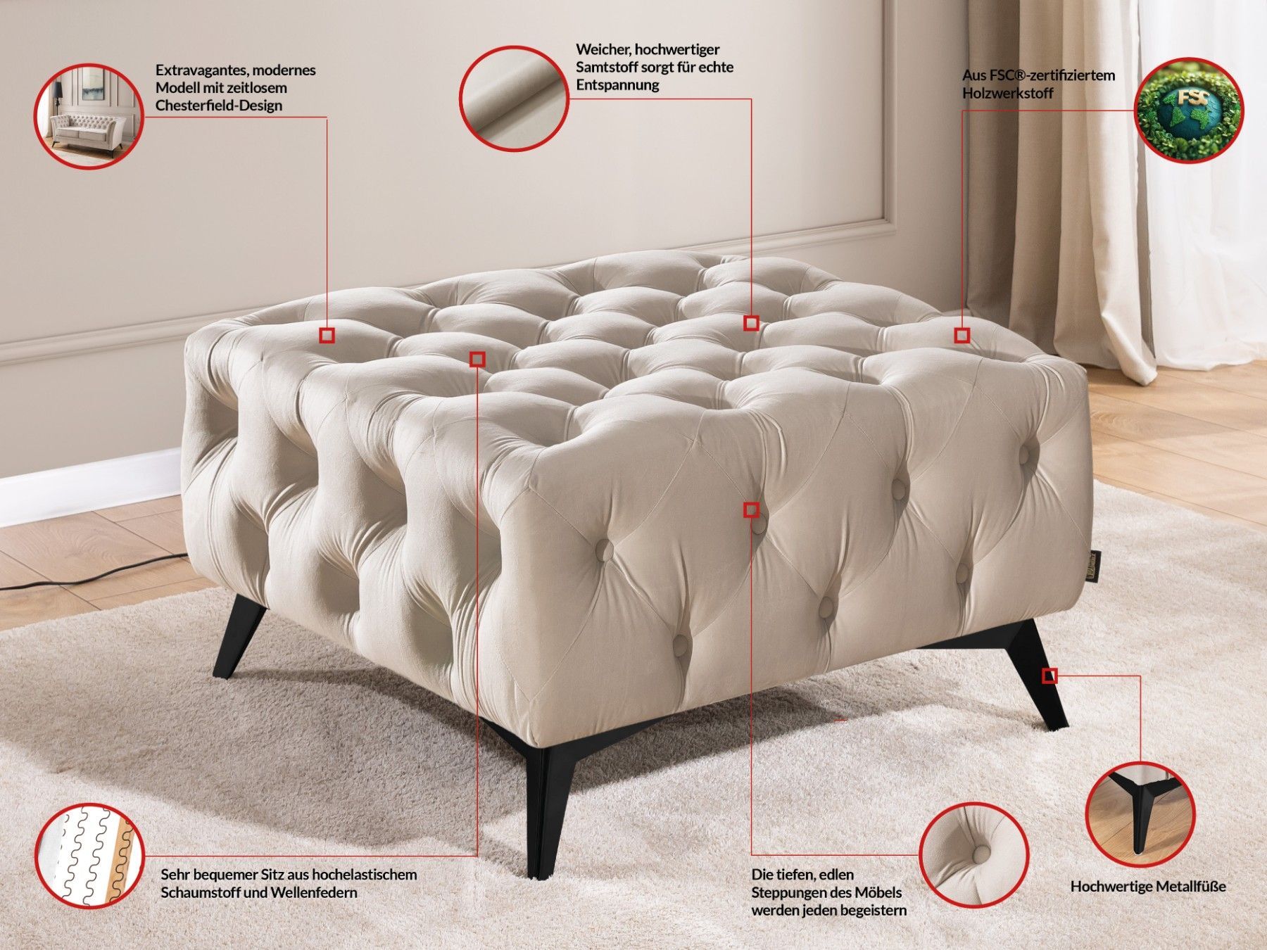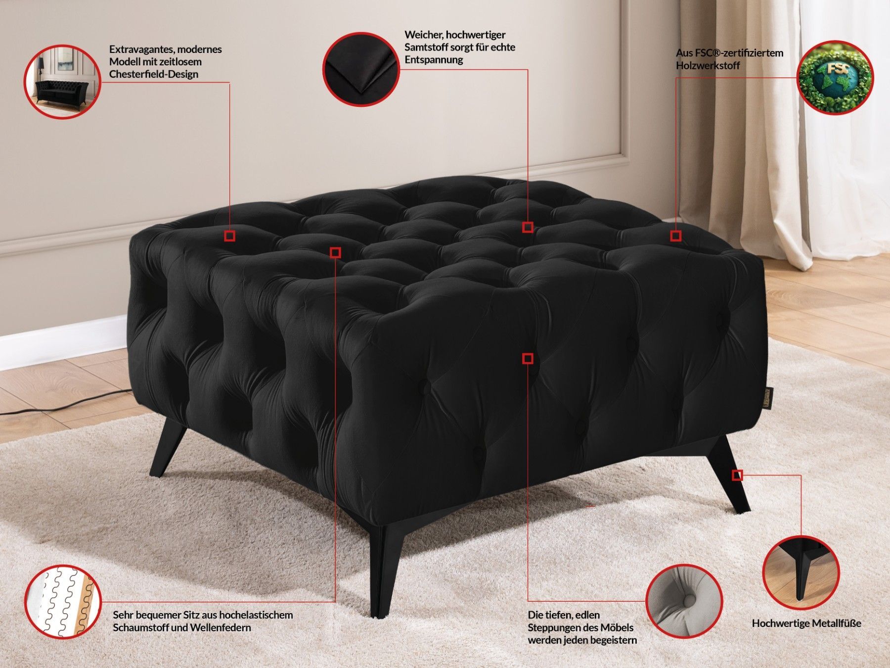 Whitby - Chesterfield Luxus Fußhocker aus Samt mit schwarzen Füßen