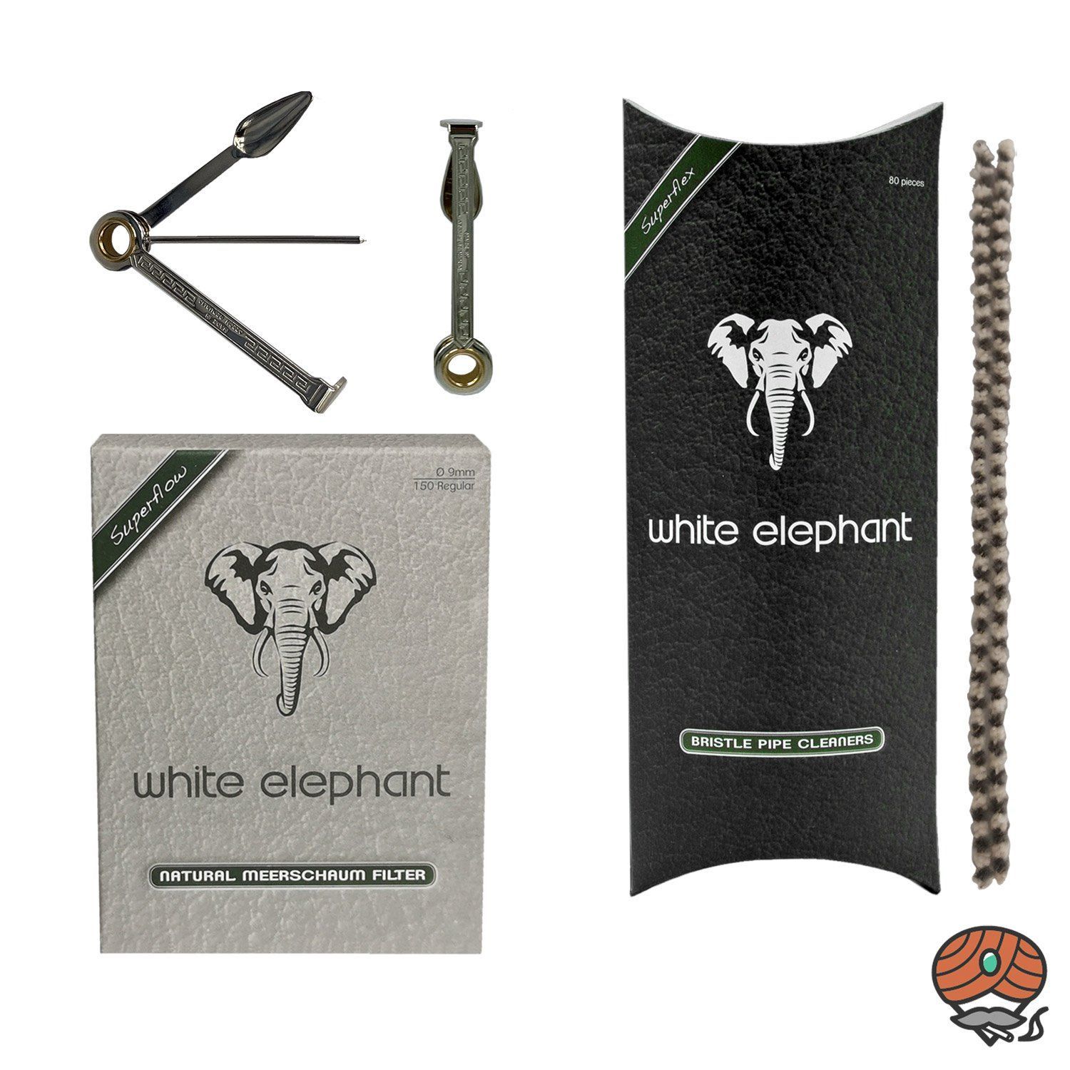 White Elephant Natural Meerschaum Filter + White Elephant Bristle Pipe Cleaners Pfeifenreiniger + Pfeifenbesteck Filter und Pfeifenreiniger für moderne Pfeifenraucher - ‘Made in Germany‘. Inhalt: 1 Packung White Elephant Natural Meerschaum à 150 Filter 1 Packung White Elephant Bristle Pipe Cleaners