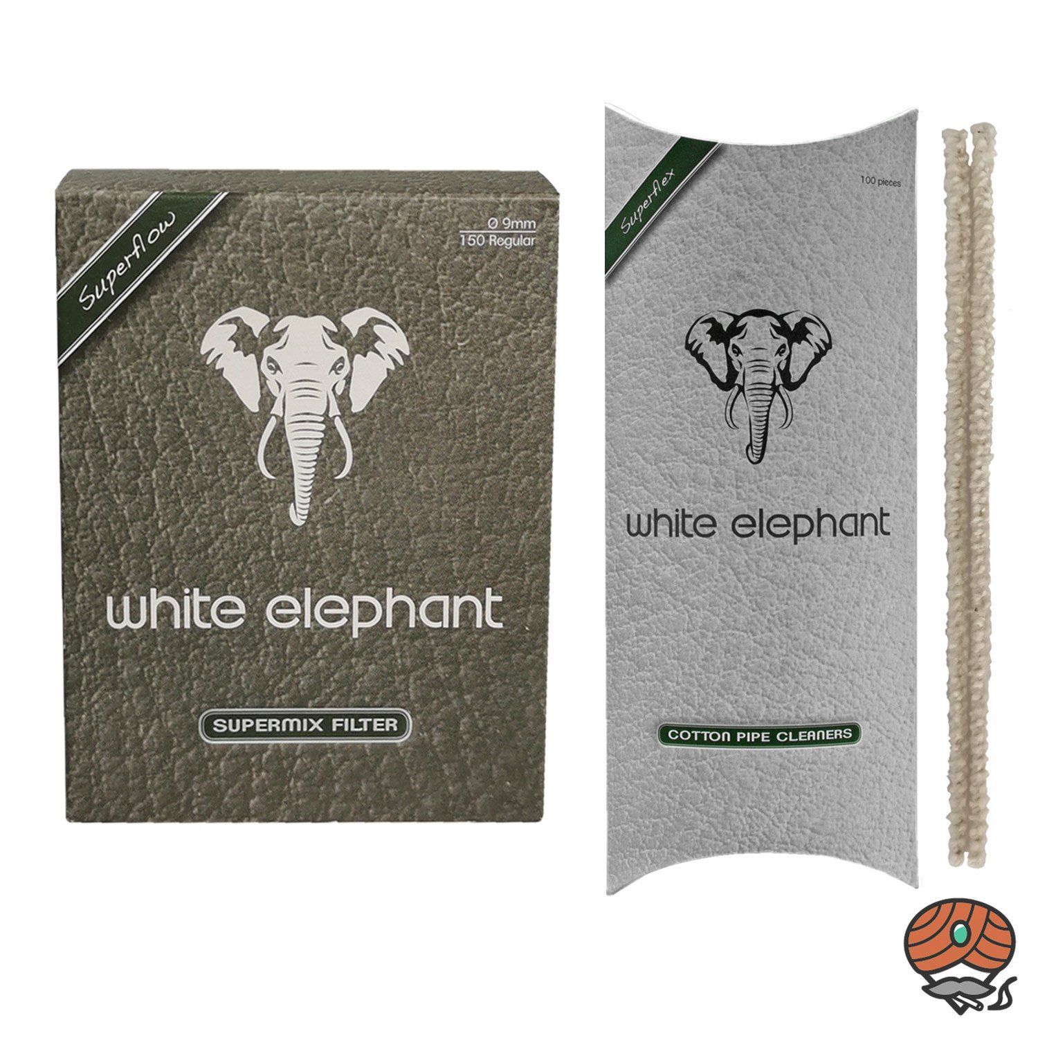 White Elephant Supermix Filter + White Elephant Cotton Pipe Cleaners Pfeifenreiniger Filter und Pfeifenreiniger für moderne Pfeifenraucher - ‘Made in Germany‘. Inhalt: 1 Packung White Elephant Supermix à 150 Filter 1 Packung White Elephant Cotton Pipe Cleaners Pfeifenreiniger à 100 Stück Supermix Fi