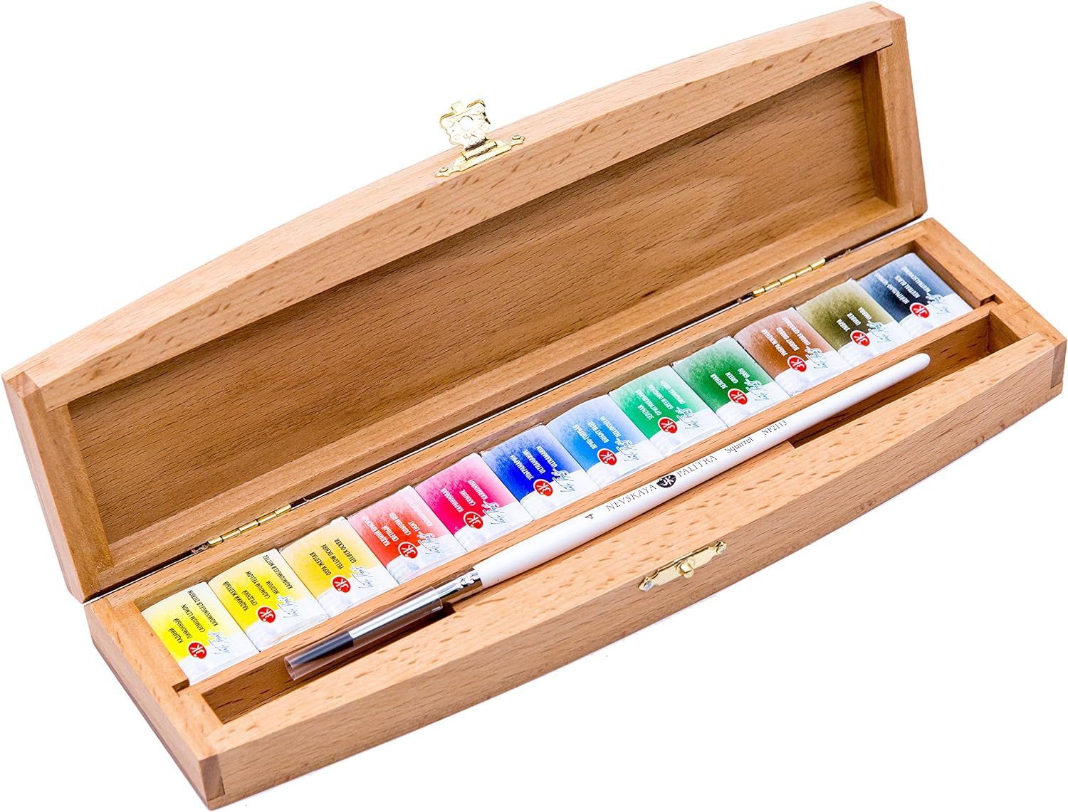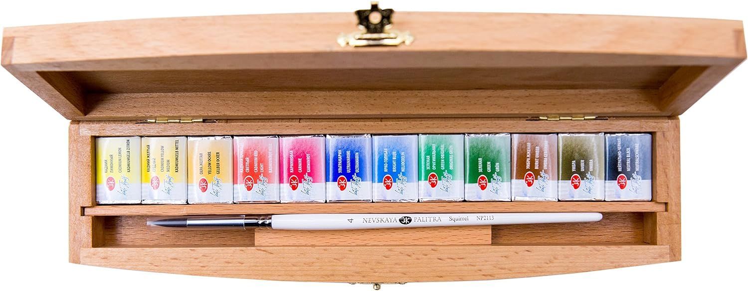 White Nights 12 ganze Näpfe Aquarellfarb-Set+ Kolinskiy Aquarellpinsel im Holzkasten