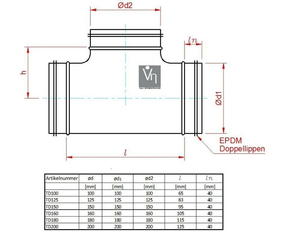 Wickelfalzrohr T-Stück NW150 Lüftungs Rohr Lippendichtung Gummilippe TD150