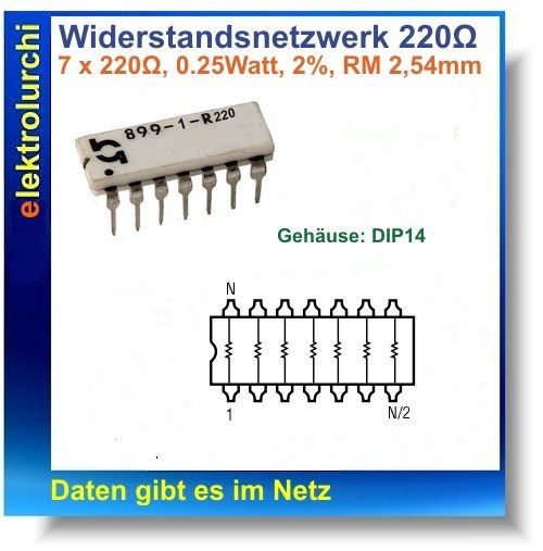 Sie bieten hier auf folgende Artikel NEU 1 Stück Widerstandsnetzwerk 7x 220 Ohm DIP14 2% 0,25W RM 2.54 899-1-R220 Beckmann Widerstandswert: 220 Ohm Anzahl Widerstände: 7 (alle Pins separat herausgeführt) Gehäuse: DIL 14 Gehäuseausführung: Keramik Dickfilmwiderstände Hersteller: Beckmann Hersteller A