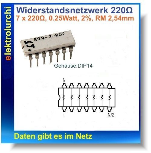 Sie bieten hier auf folgende Artikel NEU 1 Stück Widerstandsnetzwerk 7x 220 Ohm DIP14 2% 0,25W RM 2.54 899-3-R220 Beckmann Widerstandswert: 220 Ohm Anzahl Widerstände: 7 (alle Pins separat herausgeführt) Gehäuse: DIL 17 Gehäuseausführung: Keramik Dickfilmwiderstände Hersteller: Beckmann Hersteller A