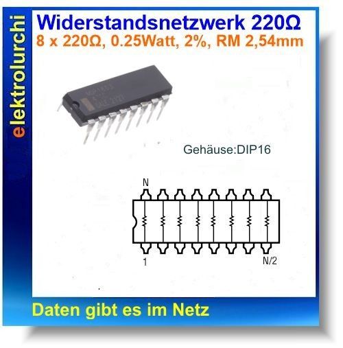 Sie bieten hier auf folgende Artikel NEU 1 Stück Widerstandsnetzwerk 8x 220 Ohm DIP16 2% 0,25W RM 2.54 Dale MDP 1603-221 Widerstandswert: 220 Ohm Anzahl Widerstände: 8 (alle Pins separat herausgeführt) Gehäuse: DIL 16 Gehäuseausführung: Plastic Hersteller: Dale Vishay Hersteller Artikel-Nr.: MDP 160