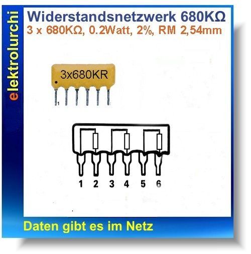 Widerstandsnetzwerk, Array 3x 680K Ohm, 6Pin, 2%, 0,2Watt, RM 2,54, 5St.