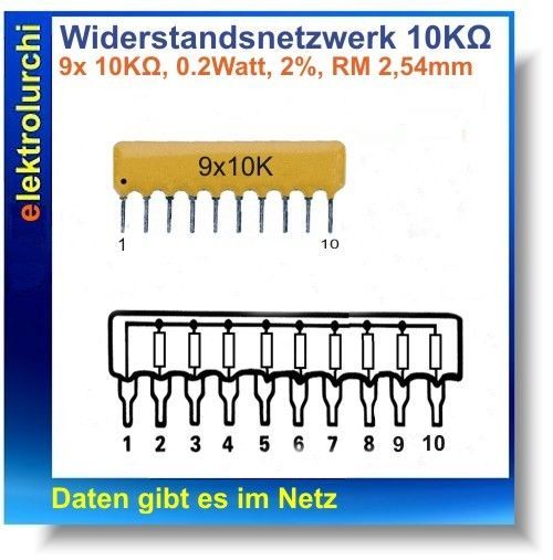 Widerstandsnetzwerk, Array 9x 10K Ohm, 10 Pin, 2%, 0,2Watt, RM 2,54, 5St.