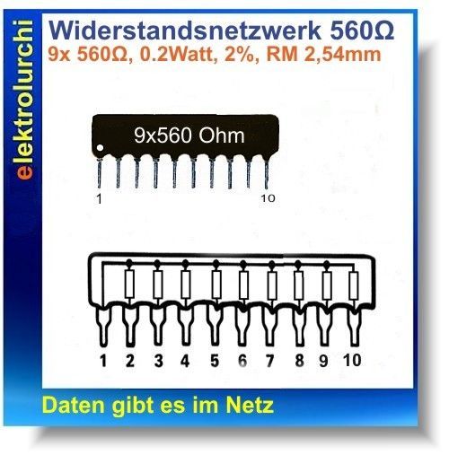Widerstandsnetzwerk, Array 9x 560 Ohm, 10Pin, 2%, 0,2Watt, RM 2,54, 5St.
