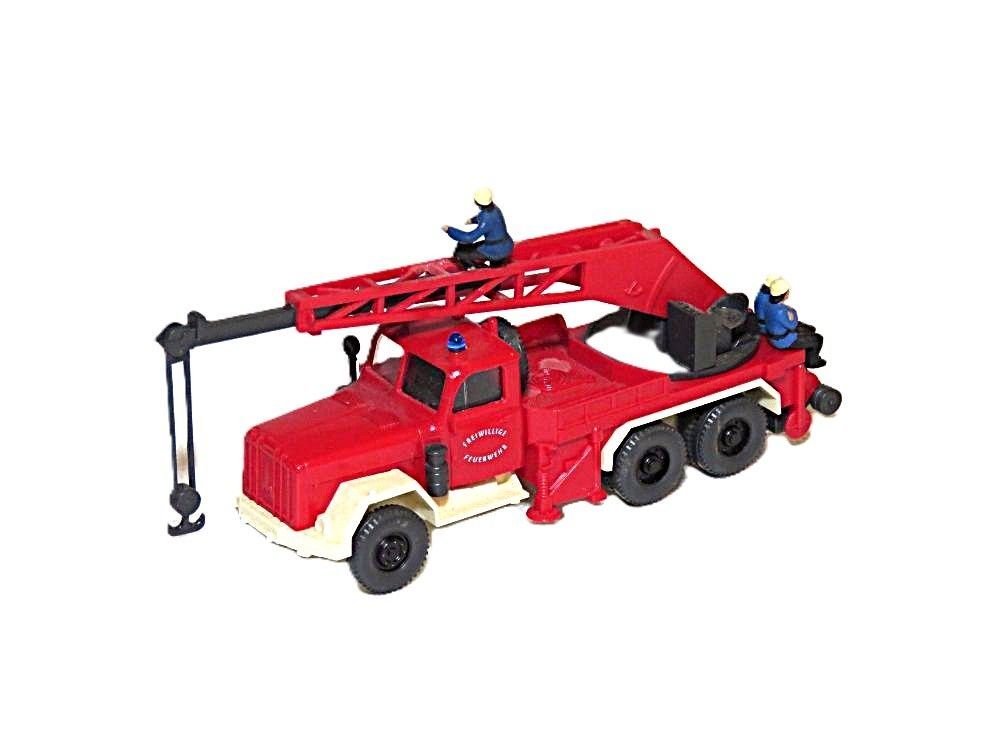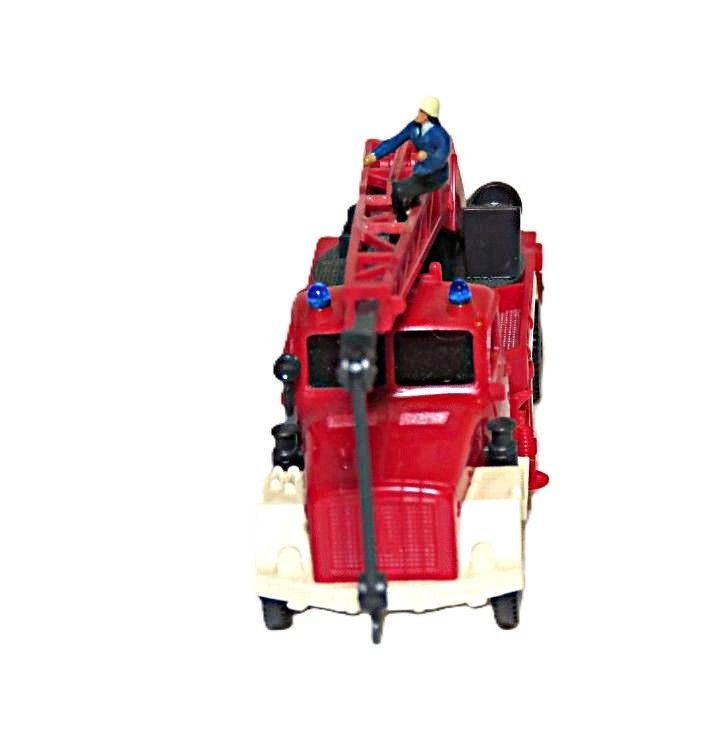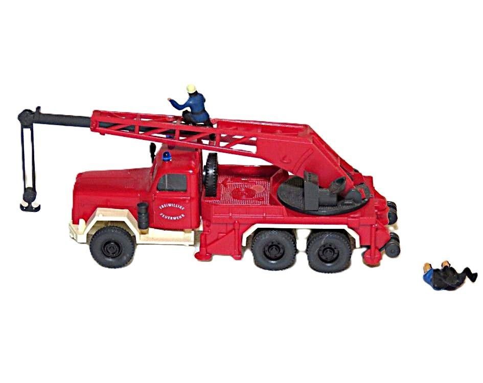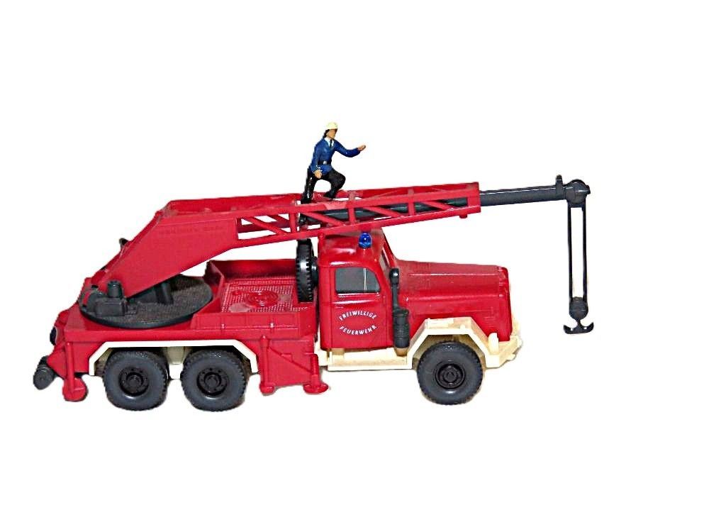 Hersteller: Wiking Artikel: Kranwagen KW 15 Feuerwehr mit Figur Fahrzeugmarke: Magirus Deutz Uranus Farbe: Rot Fahrzeugtyp: Einsatzfahrzeug Zubehör: 3 Feuerwehrmänner Türbeschriftung : Feuerwehr Maßstab: 1:87 Originalverpackung: Nein Anmerkung: Auf der Drehleiter ist ein Feuerwehrmann festgeklebt. A