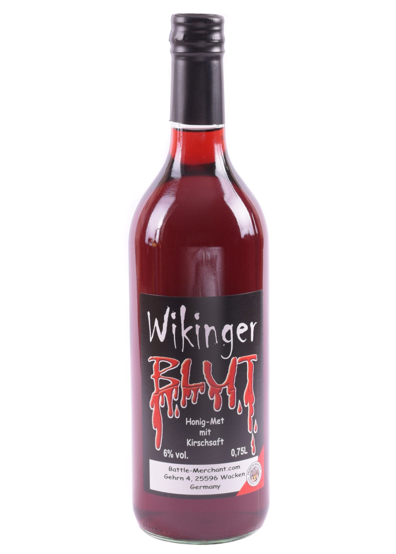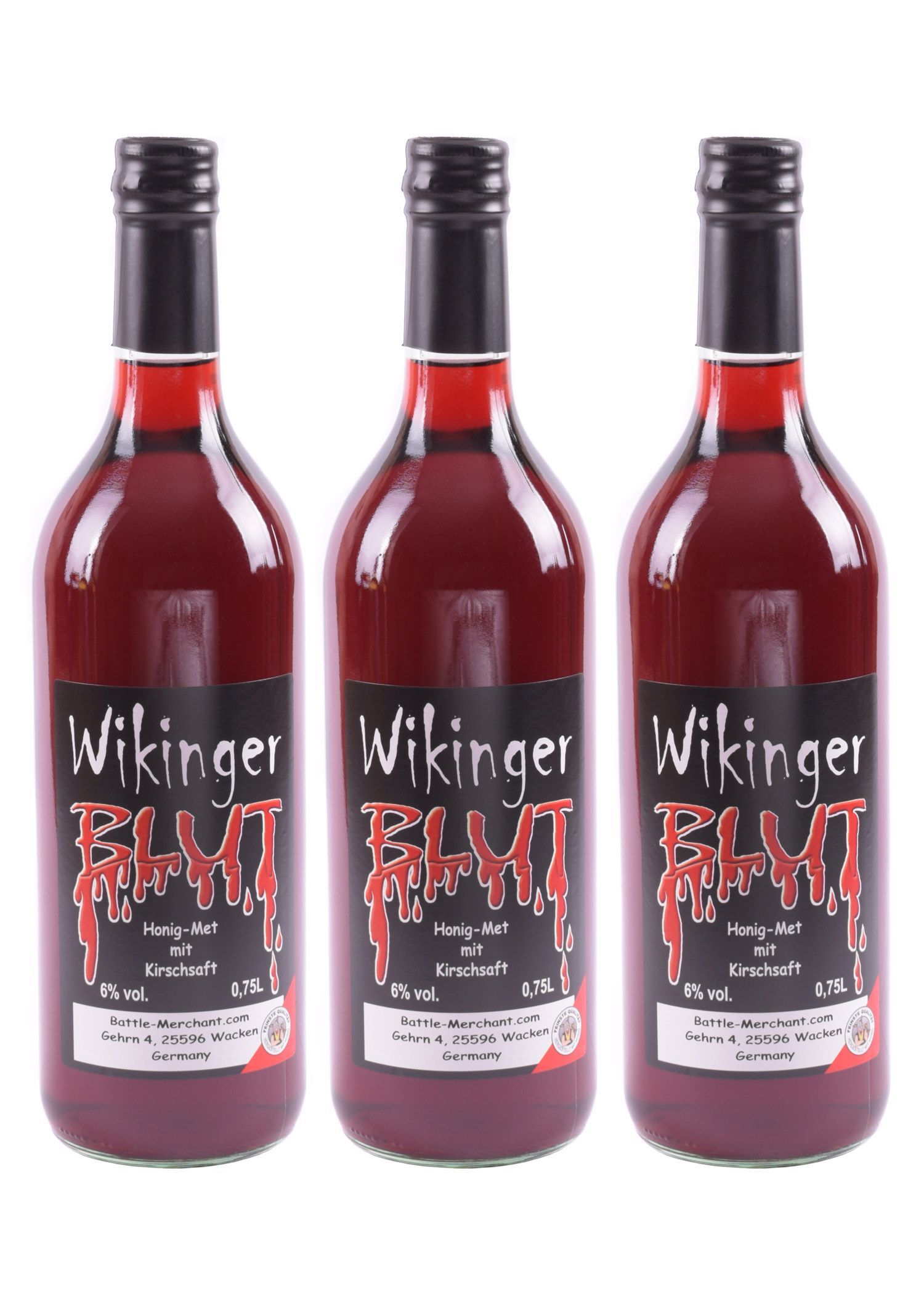 Wikingerblut, Met mit Kirschsaft, 6% Vol. Details: - Zutaten: Wasser, Kirschsaft, Honig, Hefe - Flasche à 0,75 l pro Flasche oder Kanister mit 10 Liter Inhalt - Alkoholgehalt: 6% Vol. - Abgefüllt für Battle Merchant Wacken GmbH & Co. KG, Gehrn 4, 25596 Wacken - Lieferung erfolgt im stabil