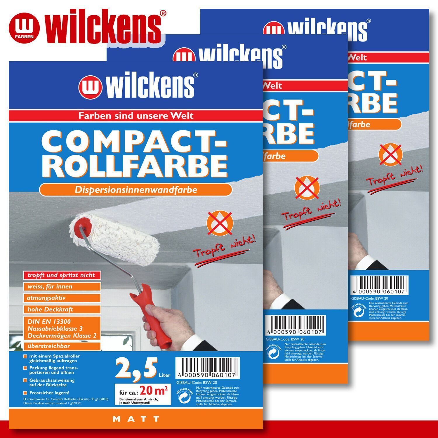 Wilckens Wilckens 3 x 2,5 l Compact Rollfarbe Weiß Dispersionsfarbe Wandfarbe Innen