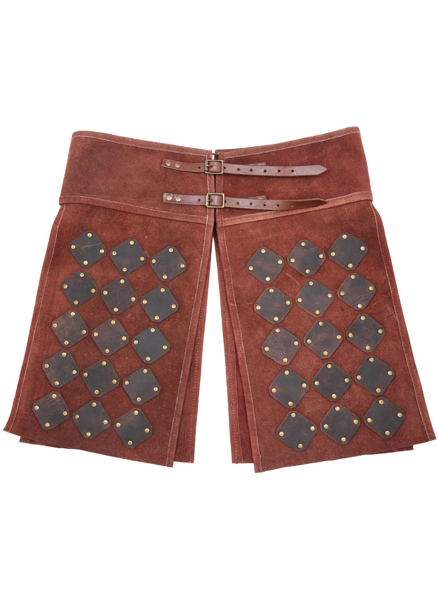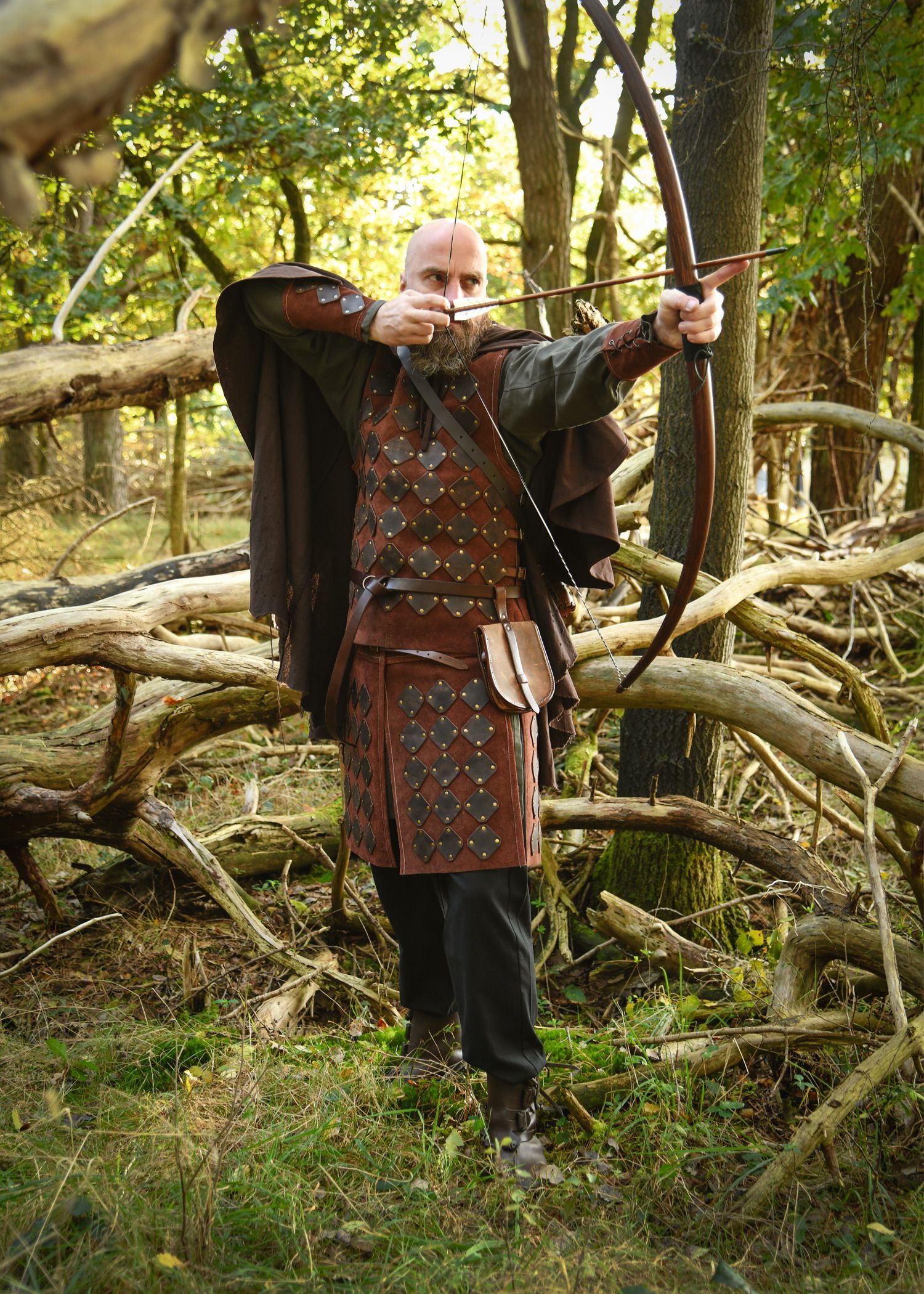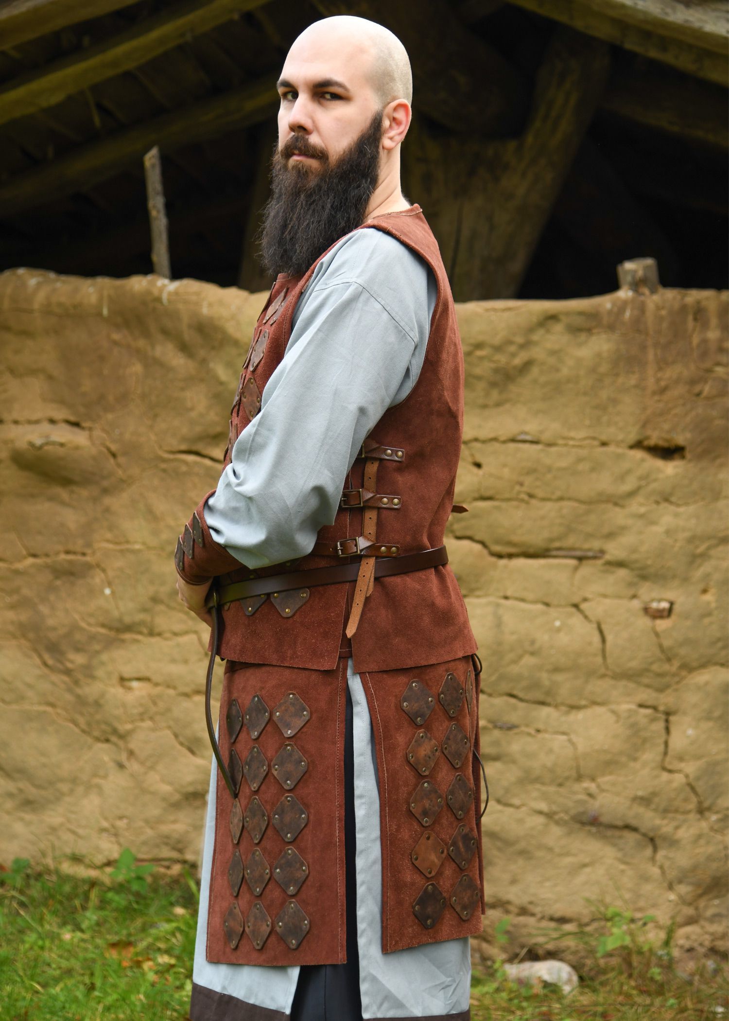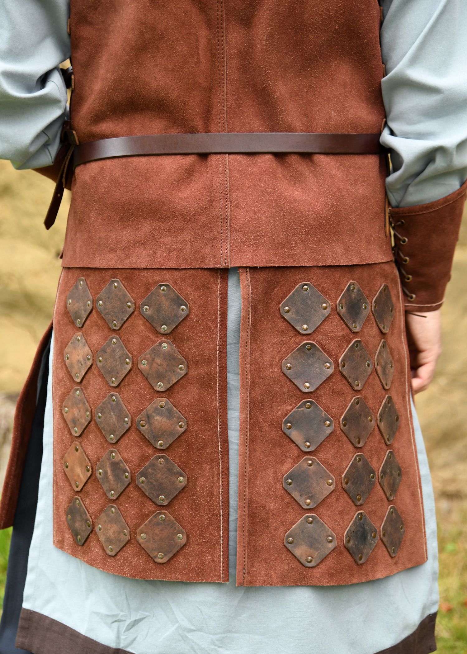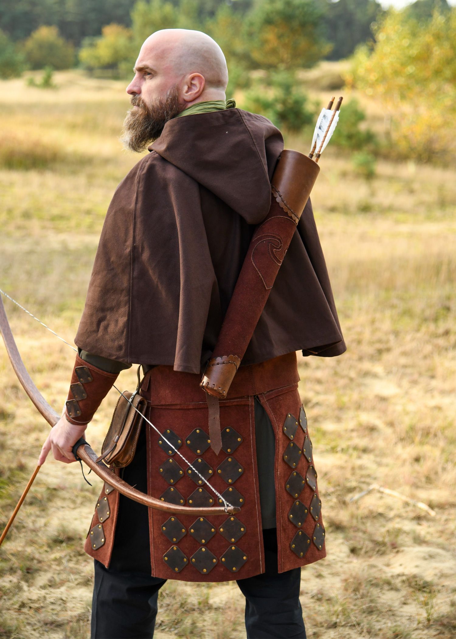 Wildleder Rock, Rüstung Vidar, braun Der erfahrene Waldläufer lebt tief verborgen in den Wäldern und ist ein Meister im Bogenschießen und Fährtenlesen. In braunes Leder und grüne Kleidung gehüllt, schleicht der Bogenschütze lautlos im Schutz der Bäume durch die Wälder. Als Hüter des Waldes kennt er