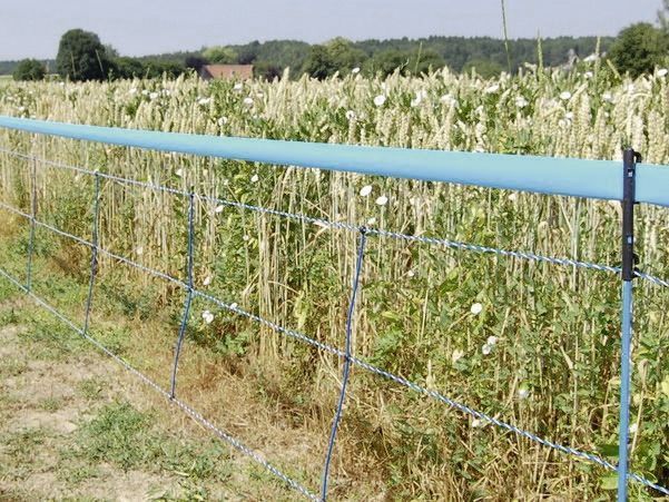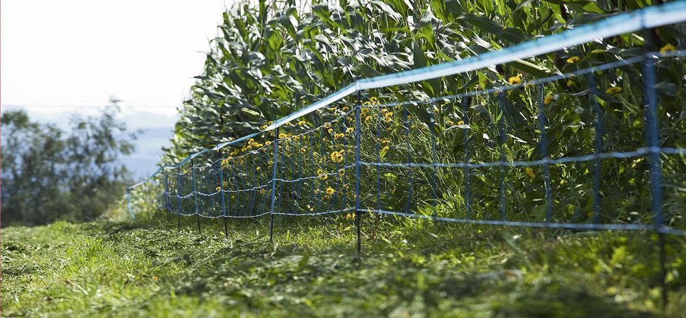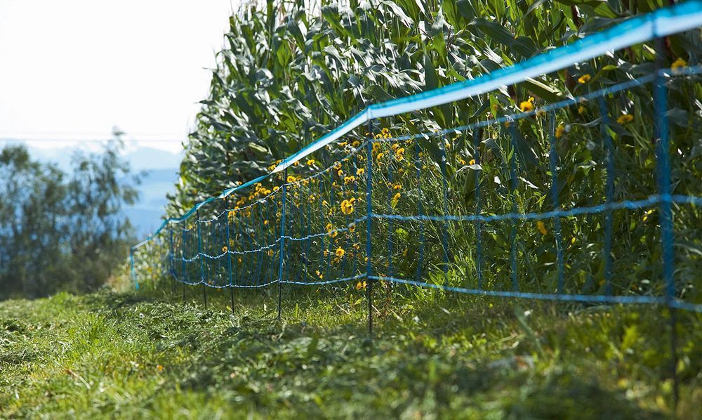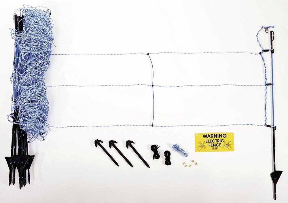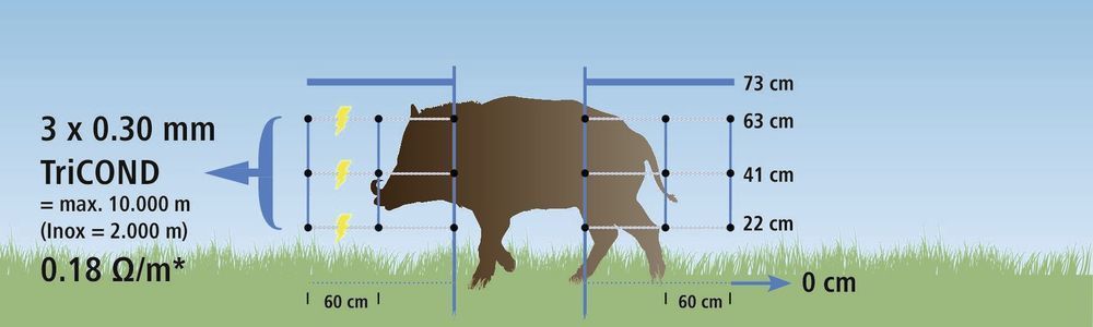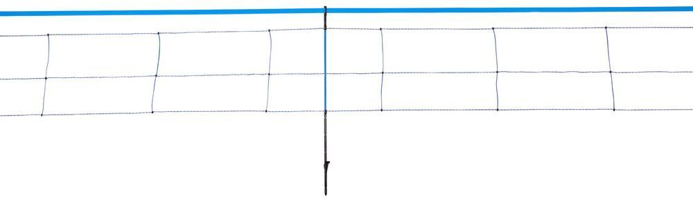 WildNet Die unkomplizierte Lösung zur Wildabwehr!   • Länge 50 m • 3 x TriCOND-Reihen weiß/blau mit jew. 3 x 0,30 mm TriCOND-Drähten bieten optimale Leitfähigkeit (max. 10.000 m Zaunlänge) • 12 x blaue Fiberglaspfähle • Pfahl 75 cm über Grund • Pfahl gesamt 90 cm • ca. 4,5 m Pfahlabstand • 60 cm Abstand Vertikalstreben blau • Bodenabstände 3 x stromführende Litzen: unten 22 cm, Mitte 41 cm, oben 63 cm • inkl. Zubehör: Verbinderhülsen (Art. Nr. 27321), 3 x Bodenanker (Art. Nr. 27322) mit schwarzer Nylonschnur zum Abspannen, Reparaturschild und Warnschild (Art. Nr. 446513) • blaues 40 mm Flatterband ist separates Zubehör (250 m), Art. Nr. 27216   • AKO Expertentipp: Platzieren Sie das Signal Light am Ende Ihrer Zaunanlage. Auf einen Blick können Sie somit feststellen, ob am Ende Ihres Zaunes und damit auf Ihrer kompletten Anlage die Mindesthütespannung von 2.500 V fließt.   TriCOND = 5 x höhere Leitfähigkeit als Edelstahlleiter   Vorteile WildNet: • schneller Auf- und Abbau im Vergleich zu herkömmlichen E-Zäunen • Bodenabstand (besser zum Ausmähen und deutlich weniger Ableitungen, d.h. mehr Leistung am Zaun) • Möglichkeit blaues 40 mm Plastik-Flatterband (250 m, Art. Nr. 27216) einzuziehen zur besseren optischen Unterstützung • Netze lassen sich einfach miteinander verbinden. Verbindungsteil ist im Netz integriert. Separate Verbinder sind nicht notwendig   Empfehlung! Für eine optimale Absicherung ihres Zaunes empfehlen wir: Mobil Power AN 5500 (Art. Nr. 372550), 12 Volt Spezial Nassakku (Art. Nr. 44223), 5 x Batteriesäureflasche (Art. Nr. 442161), WildNet (Art. nr. 27215), Signalband (Art. Nr. 27216), 3 x Spezial-Erdstab (Art. Nr. 44619 ) und Metall-Akkukasten (Art. Nr. 44656).
