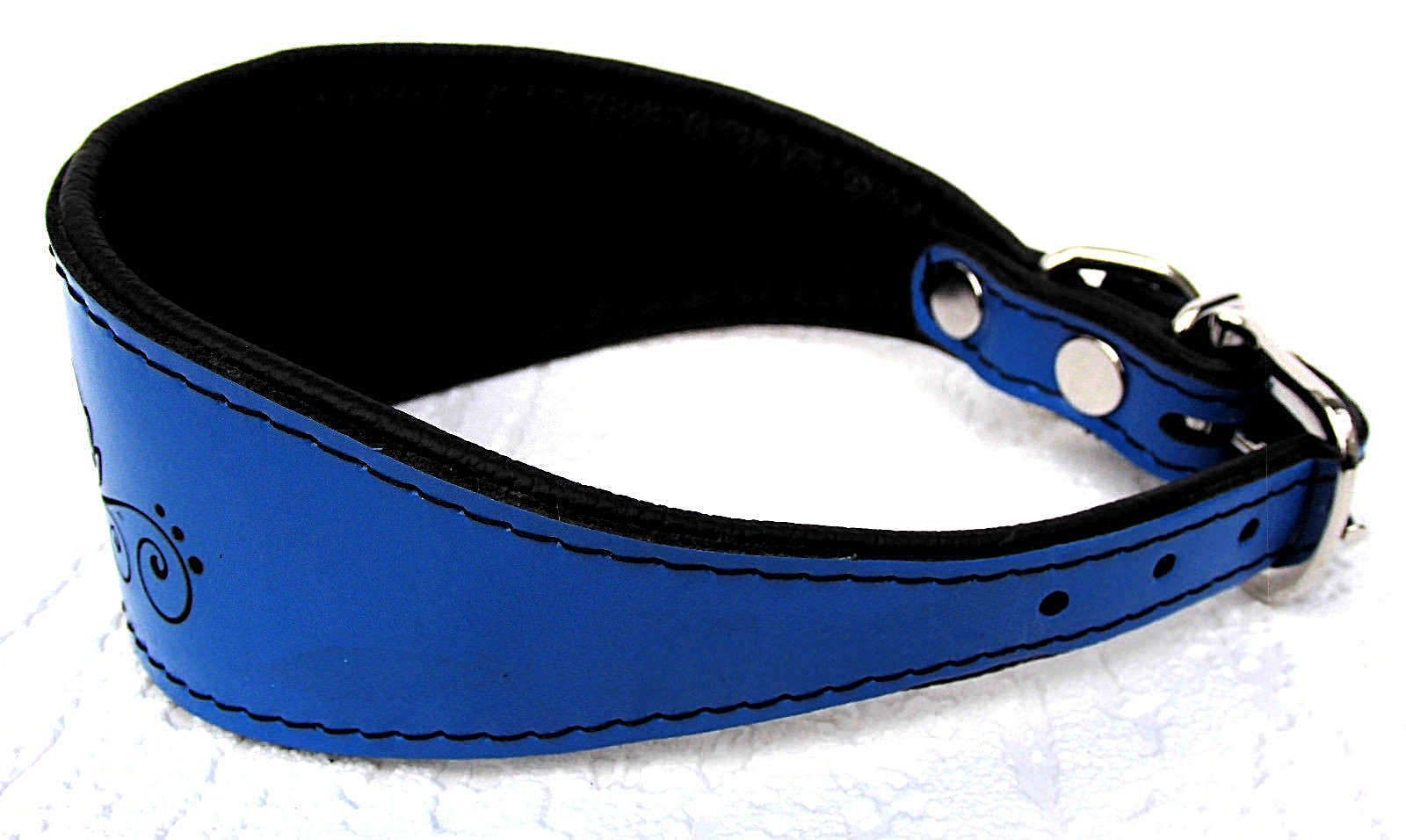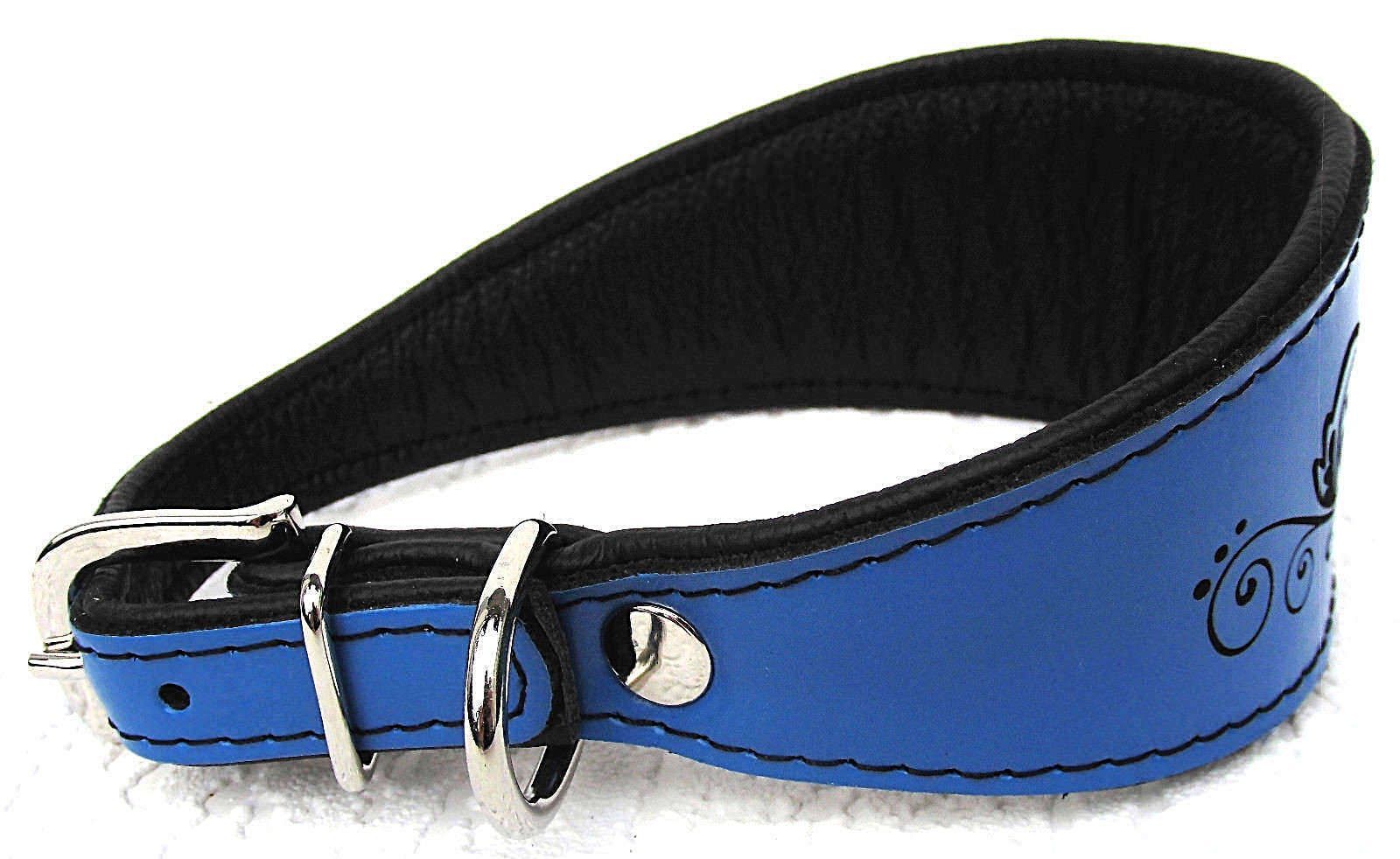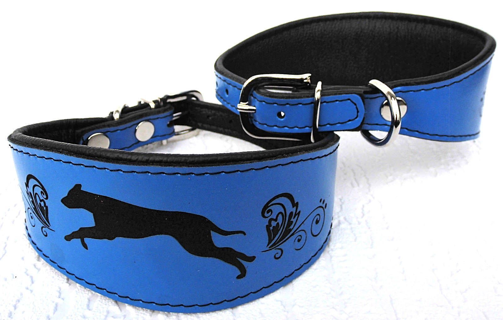 LEDERHALSBAND für Windhund - Galgo *** BLAU *** *** mit lasereingearbeiteten Tiermotiven *** Maße: Gesamtlänge : 54 cm Halsumfang : 40 - 50 cm Breit : 19 - 70 mm Messen Sie hierzu bitte den Hals ihres Hundes. Material - 100% hochwertiges Leder, sehr robust - Vernäht und gepolstert mit weichem Leder