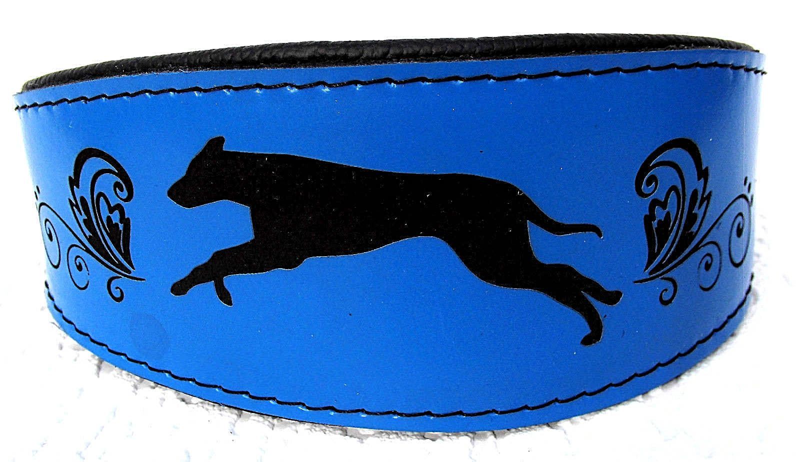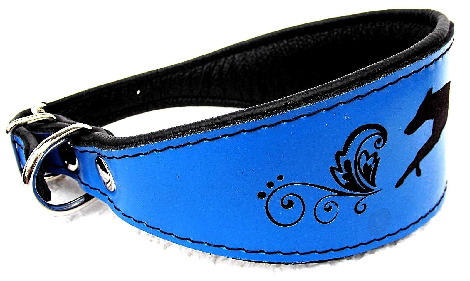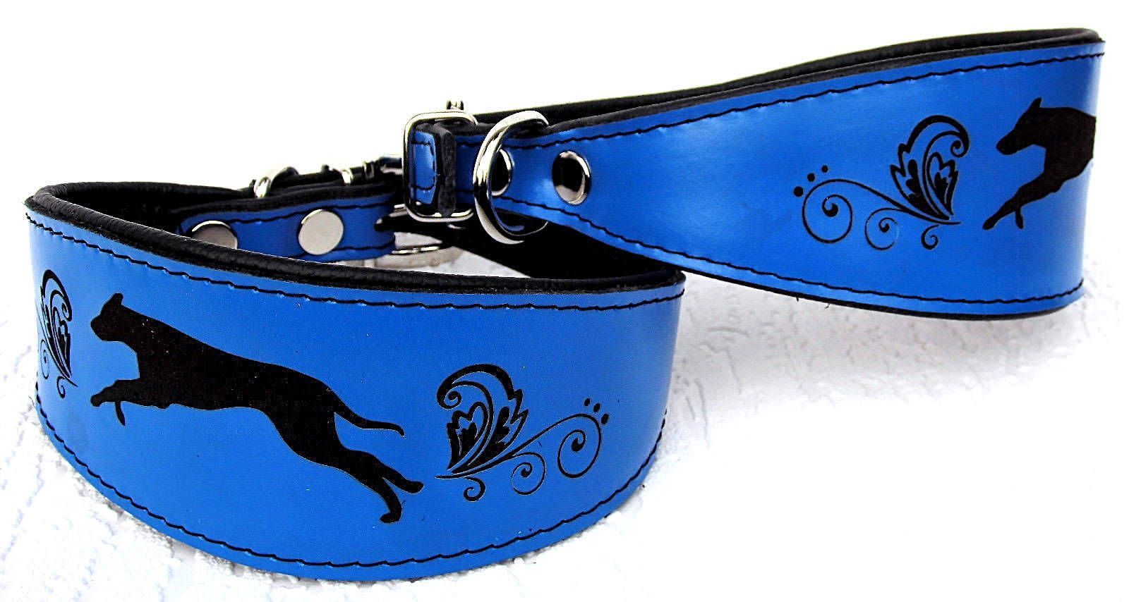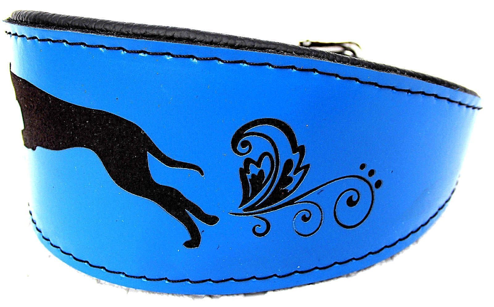 LEDERHALSBAND für Windhund - Galgo *** BLAU *** *** mit lasereingearbeiteten Tiermotiven *** Maße: Gesamtlänge : 54 cm Halsumfang : 40 - 50 cm Breit : 19 - 70 mm Messen Sie hierzu bitte den Hals ihres Hundes. Material - 100% hochwertiges Leder, sehr robust - Vernäht und gepolstert mit weichem Leder