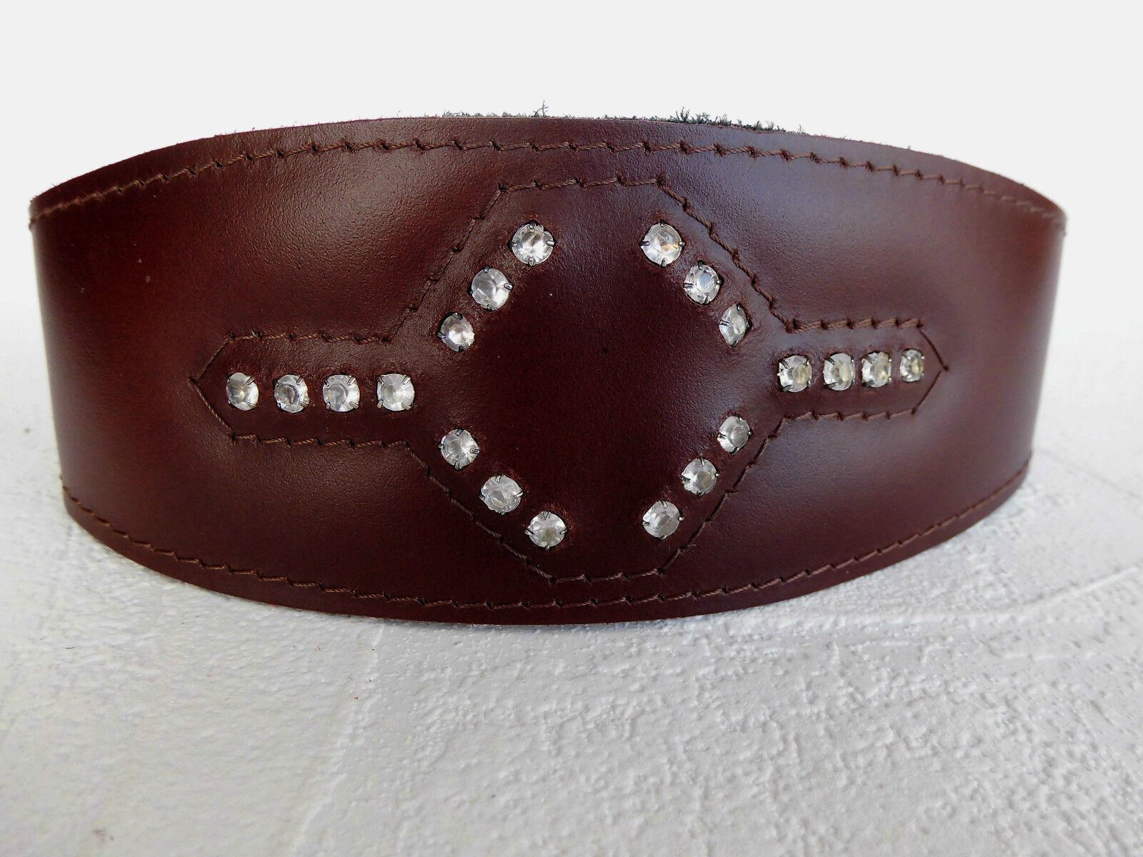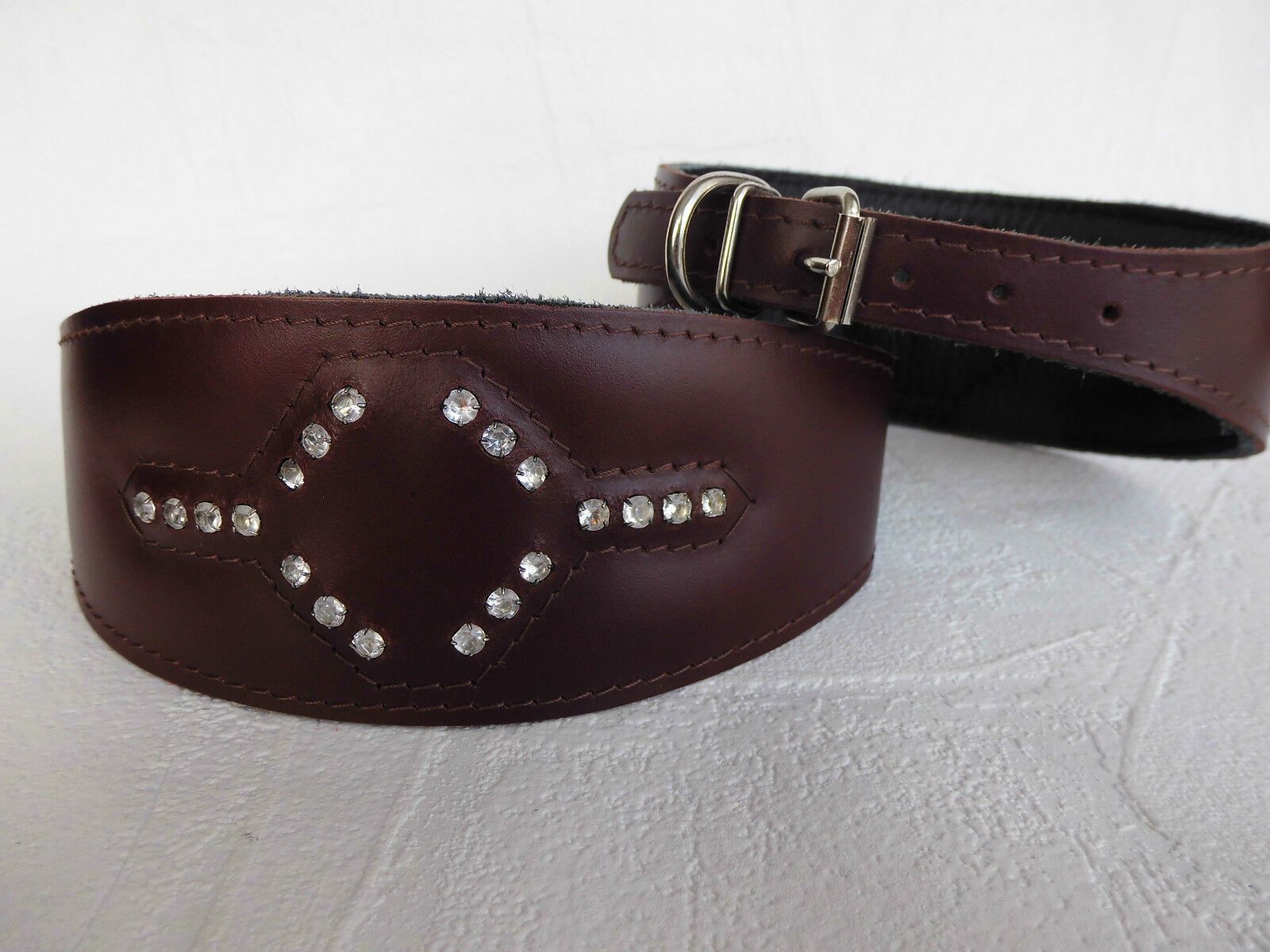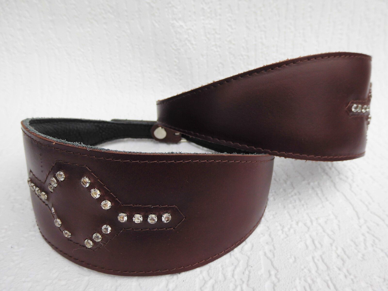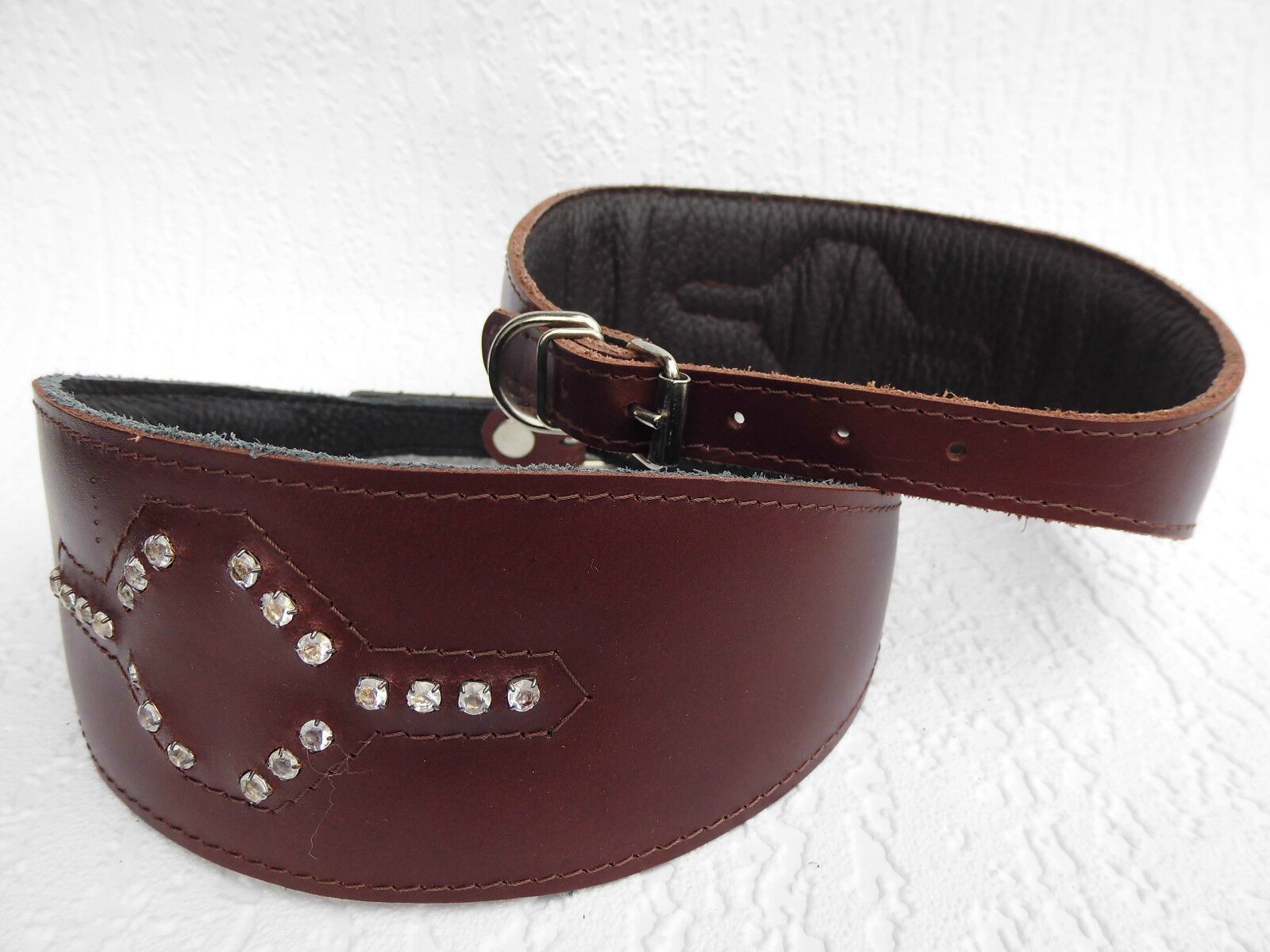 LEDERHALSBAND Strass-Steinen für Windhund Maße: Gesamtlänge : 41 cm Halsumfang : 33,5 - 38,5cm Breit : 15 - 60 mm Messen Sie hierzu bitte den Hals ihres Hundes. Material - 100% hochwertiges Leder, sehr robust - Verziert mit runden Strass-Steinen - Vernäht und gepolstert mit weichem Leder Schauen Sie