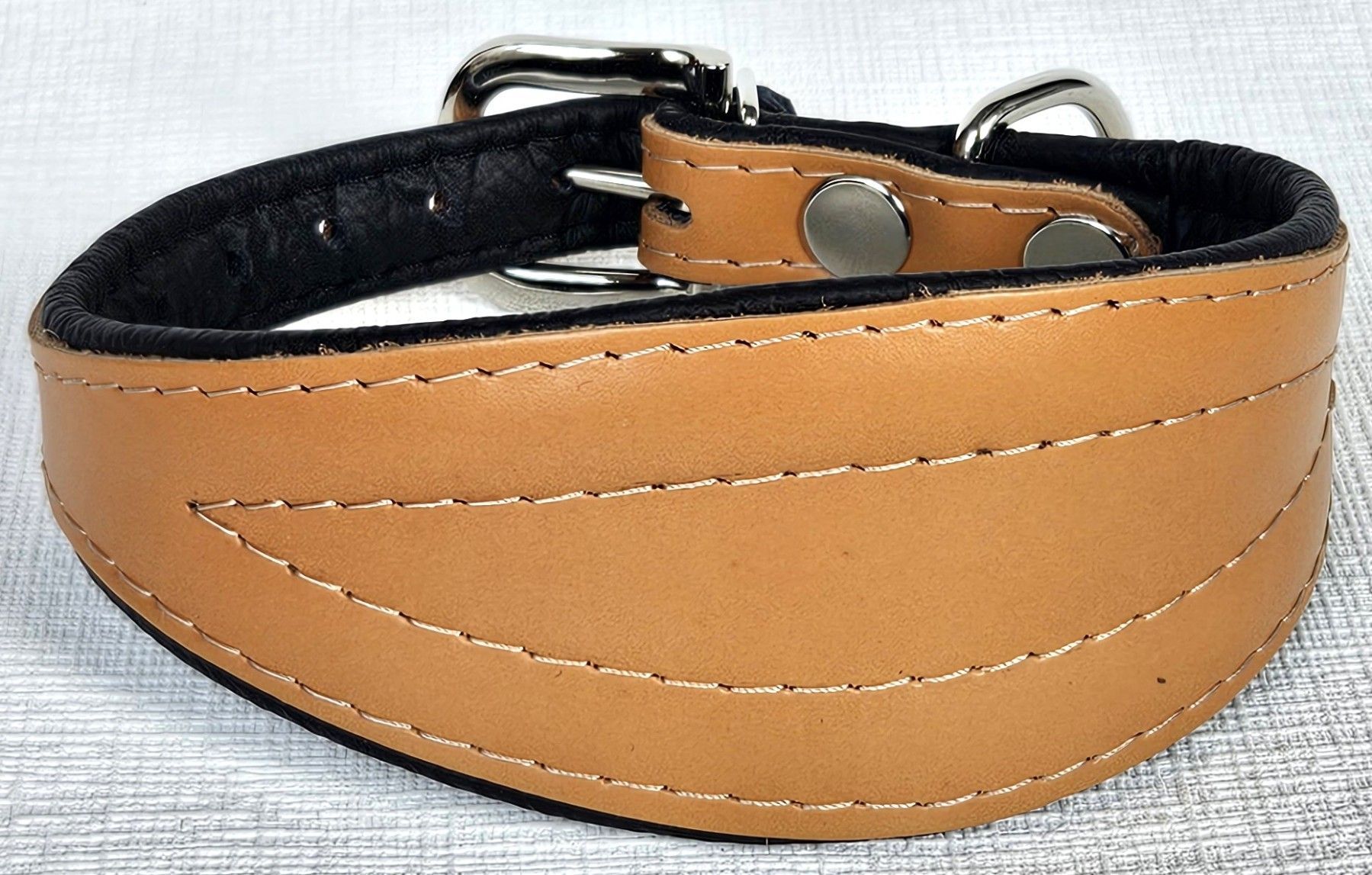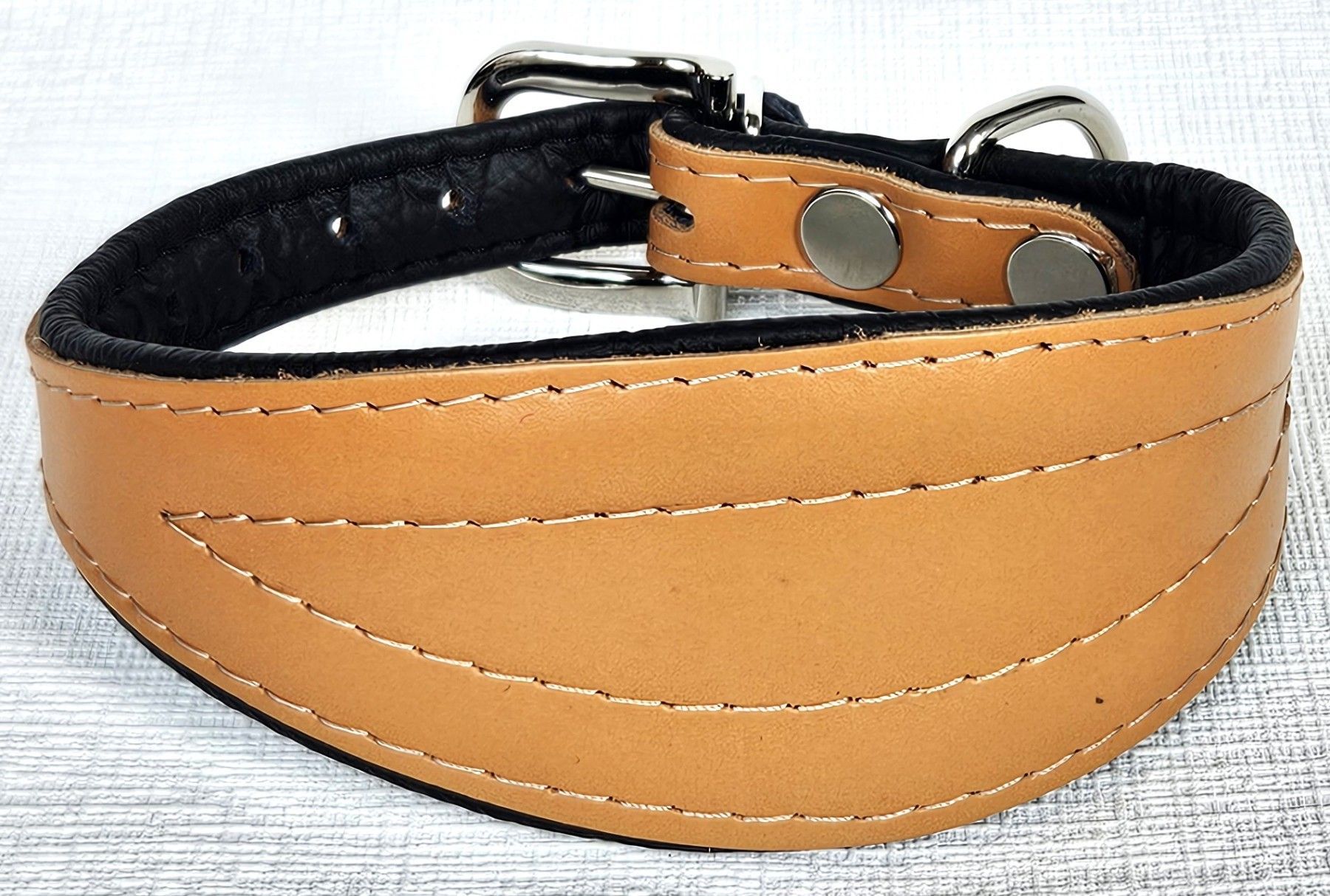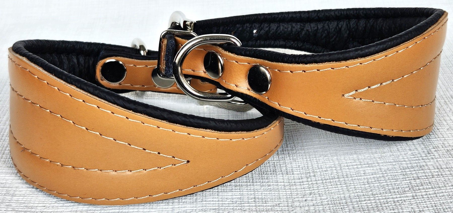 LEDERHALSBAND für Windhund *** COGNAC - Schwarz *** Maße: Gesamtlänge : 55 cm Halsumfang : 40 - 50 cm Breit : 15 - 70 mm Messen Sie hierzu bitte den Hals ihres Hundes . Material - 100% hochwertiges Leder, sehr robust - Vernäht und gepolstert mit weichem Leder Schauen Sie bitte auch noch weiteren int