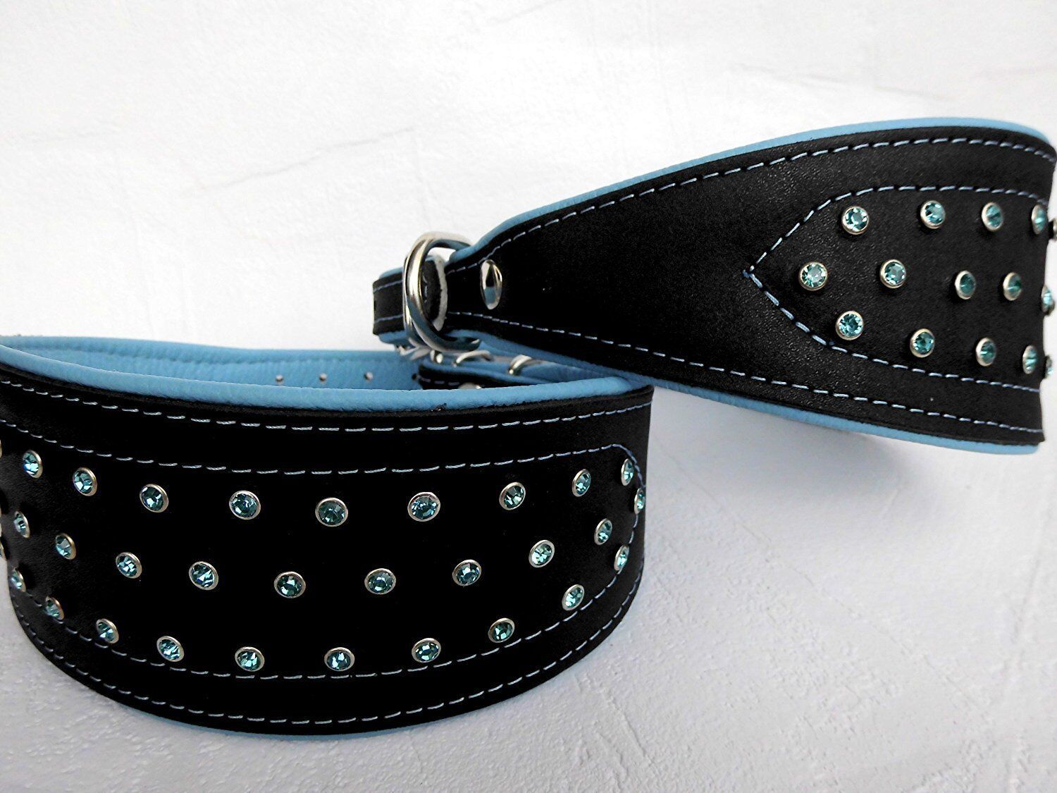 Windhund Halsband, Halsumfang 44-51cm/73mm, Leder + Kristallen Blau (8-04-8-34)