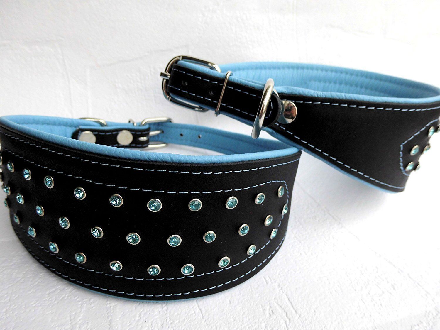 WINDHUND Lederhalsba nd mit Kristallen - ein echtest Schmuck für Ihres Hund - Schwarz - Blau Maße: Gesamtlänge : 55 cm Halsumfang : 44 - 51 cm Breit : 14 mm - 73 mm Messen Sie hierzu bitte den Hals ihres Hundes. Material : - 100 % hochwertiges Leder, sehr robust - verziert mit grossen (0,5 cm) BLAUE