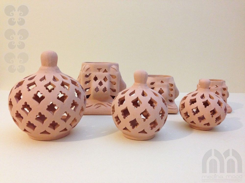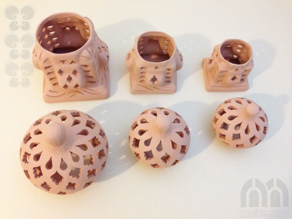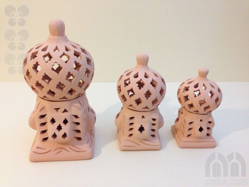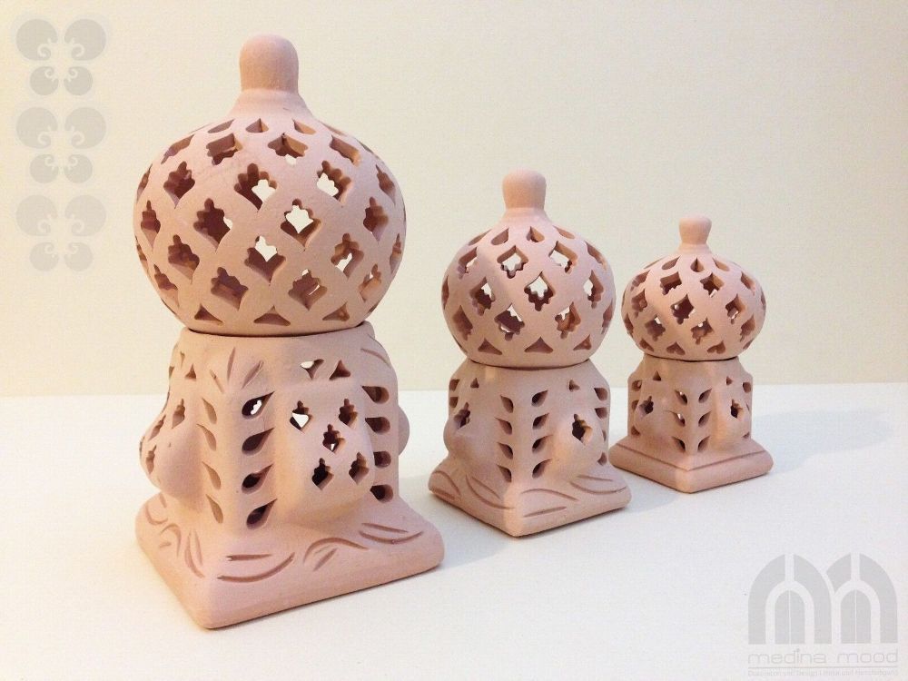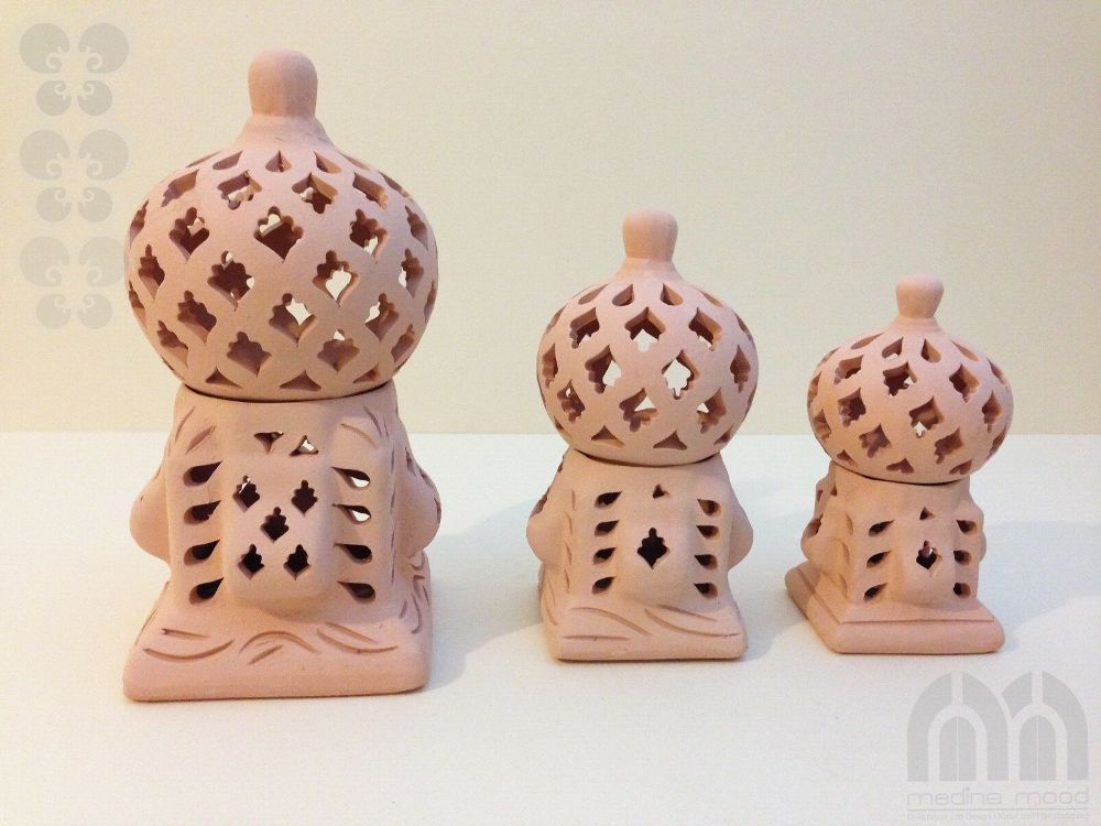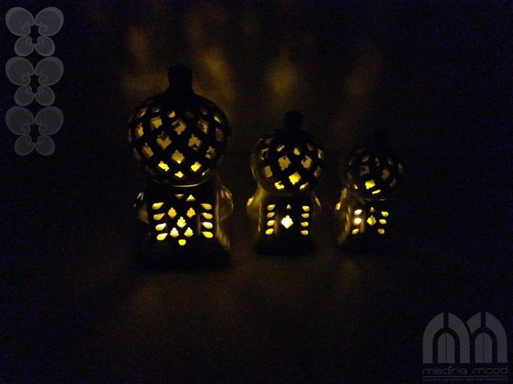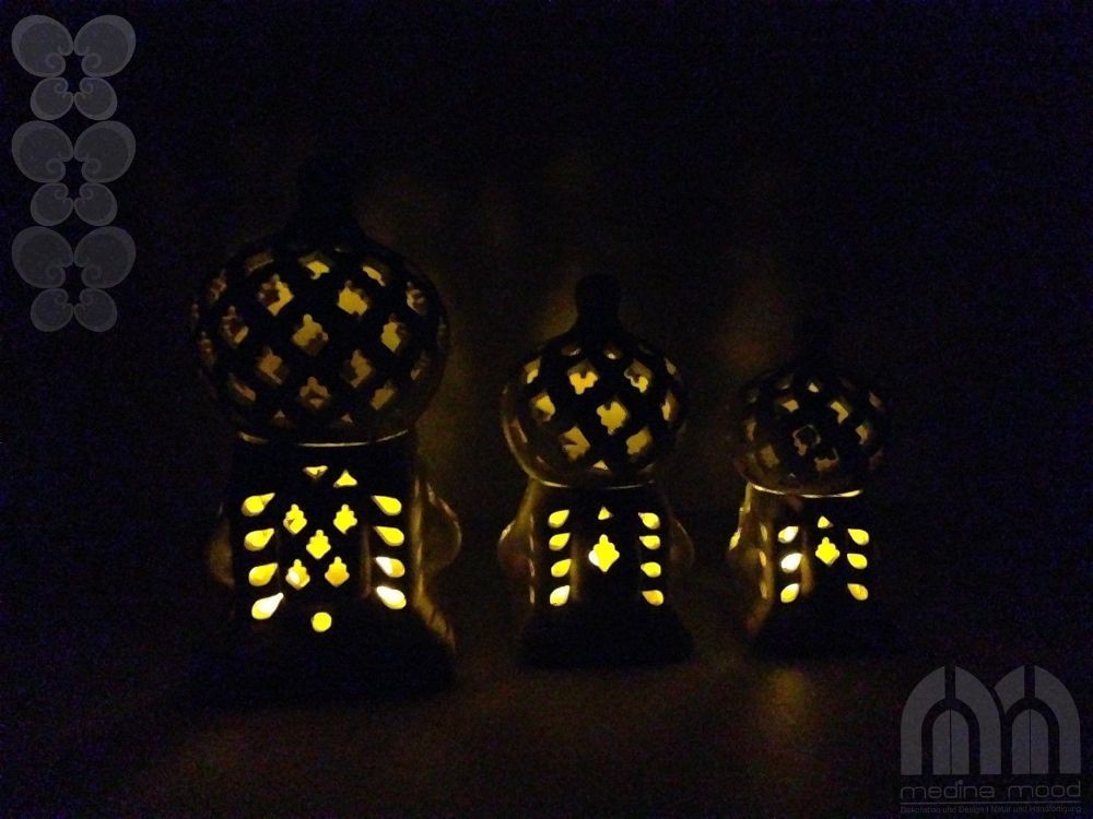 Windlicht Käfig 3er Set Das Windlicht-Set Käfig Sidi Bousaid 3er Set” ist aus Terrakotta und in Tunesien in Handarbeit angefertigt. Es besteht aus jeweils zwei Elementen: aus dem quadratischen Sockel und der Kuppel. Die künstlerisch begabten Handwerker haben jedes Windlicht einzeln per Handarbeit he