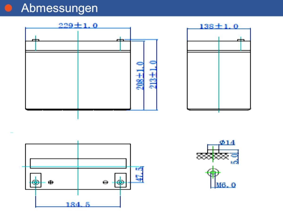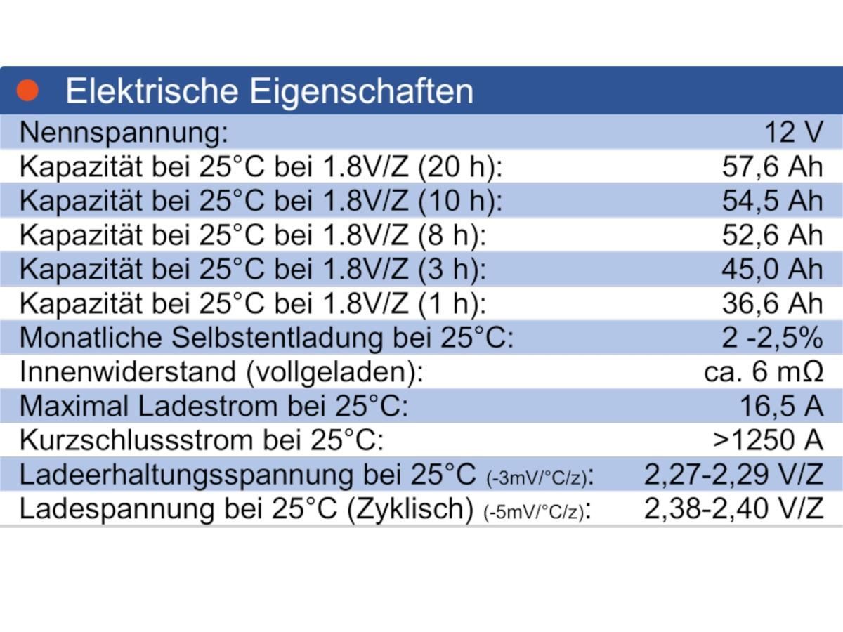 - Nennkapazität 55 Ah - Nennspannung 12 Volt - Separator: AGM - Maße (LxBxH in mm): 229x138x208 (213 über Pol) - Anschluss: Schraubenanschluss M6 (6 mm) - Gewicht 17,2 kg