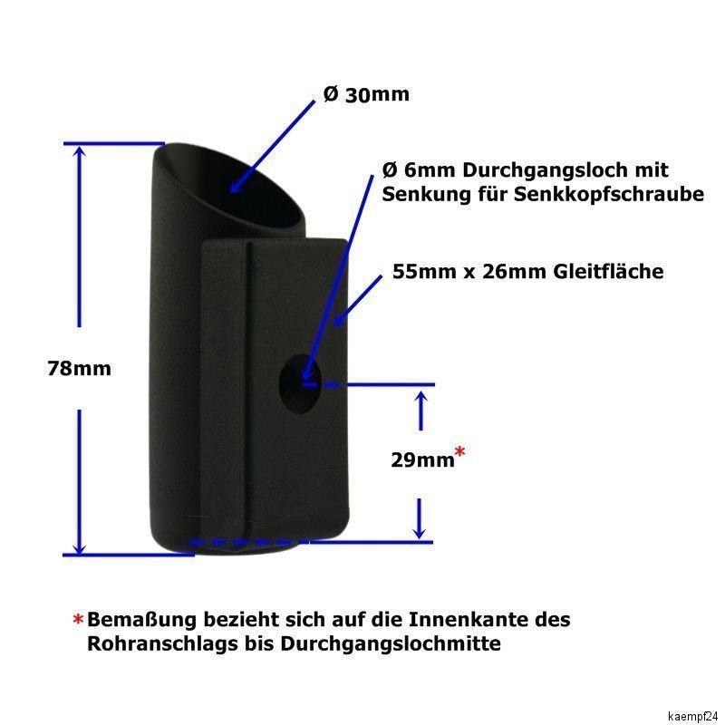 1 x Winkelgleiter Ø 30 mm schwarz Ausführung: Sehr hochwertige, aus hochbelastbarem Polyamid 6 Kunststoff gefertigte Winkelgleitkappe mit flacher Bodenfläche. Geeignet für Metallrohre Ø 30 mm Rundrohr ( Rohraußenmaß ! ) Die Gleitfläche ist mit einer versenkten Bohrung versehen, welche