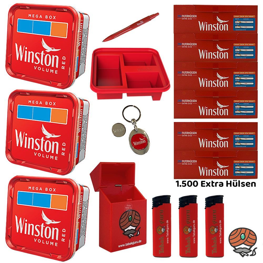 Winston Red/Rot Tabak Mega Box 3x 120g, Extra Hülsen, Schlüsselanhänger, Kulli