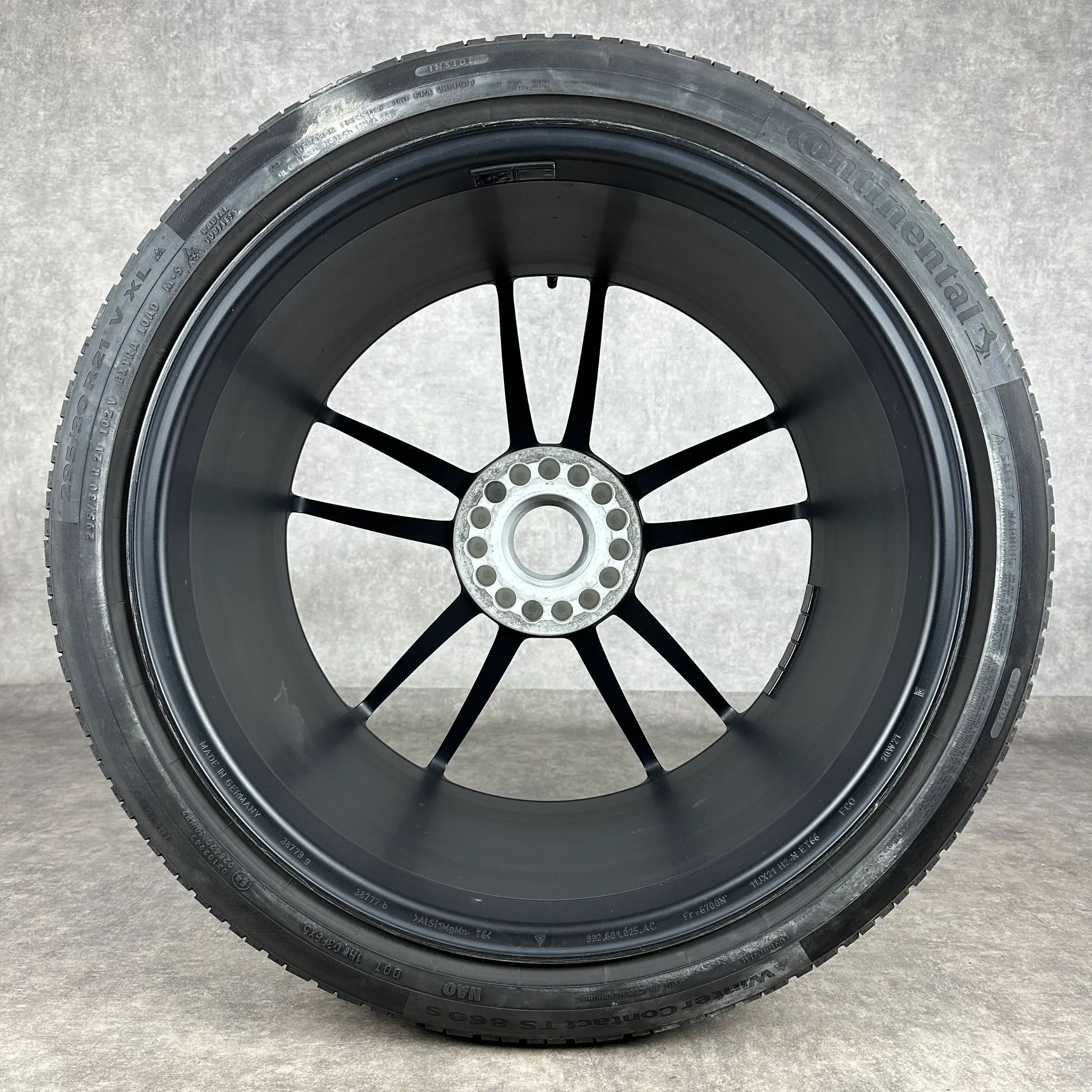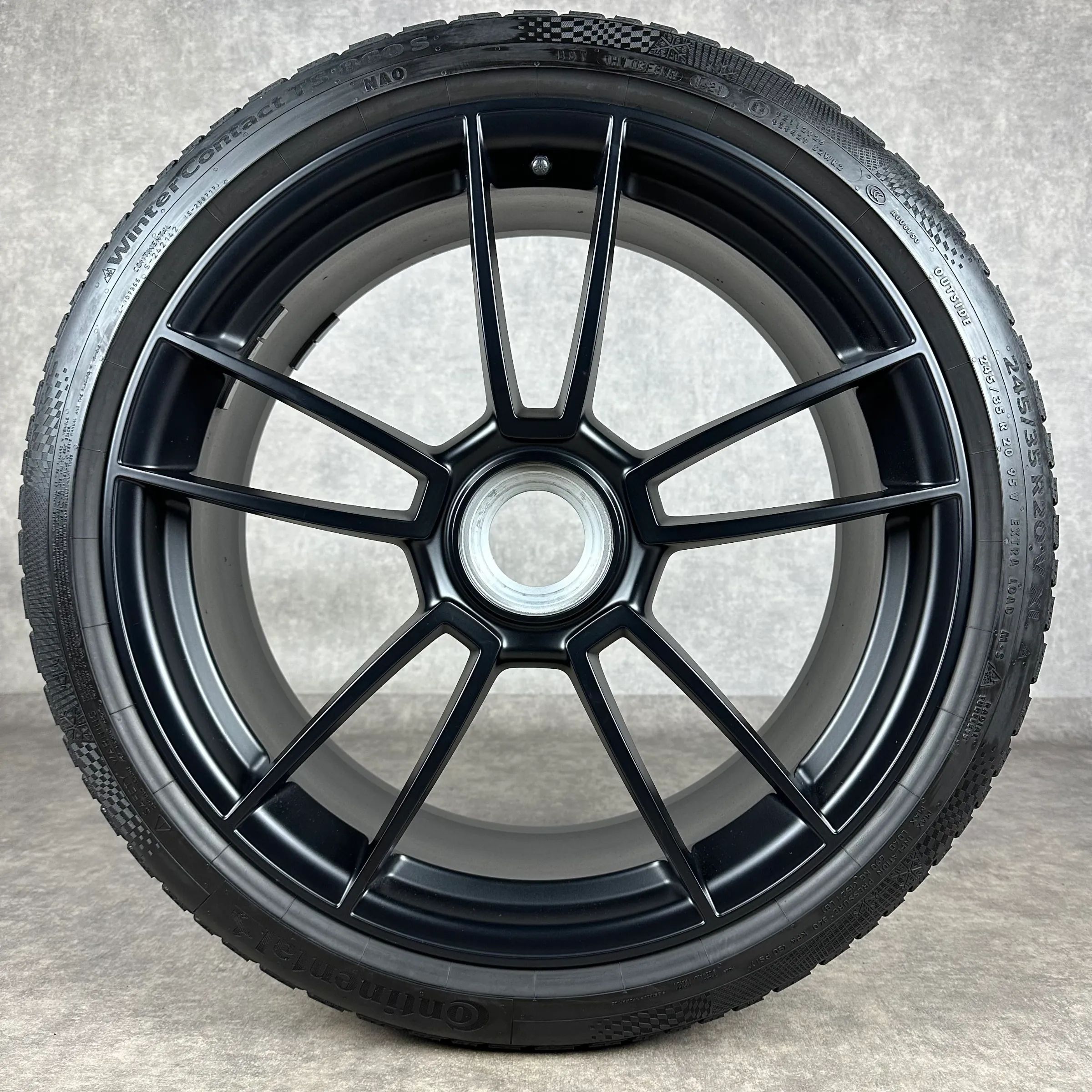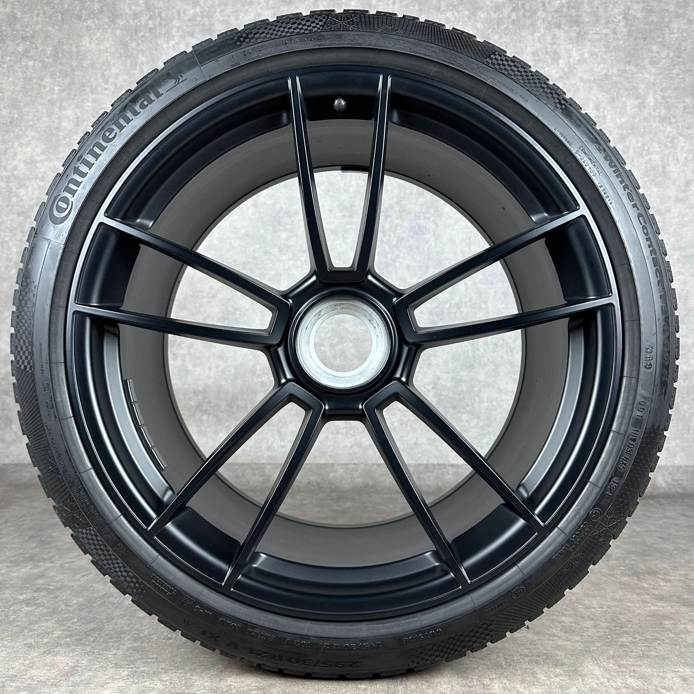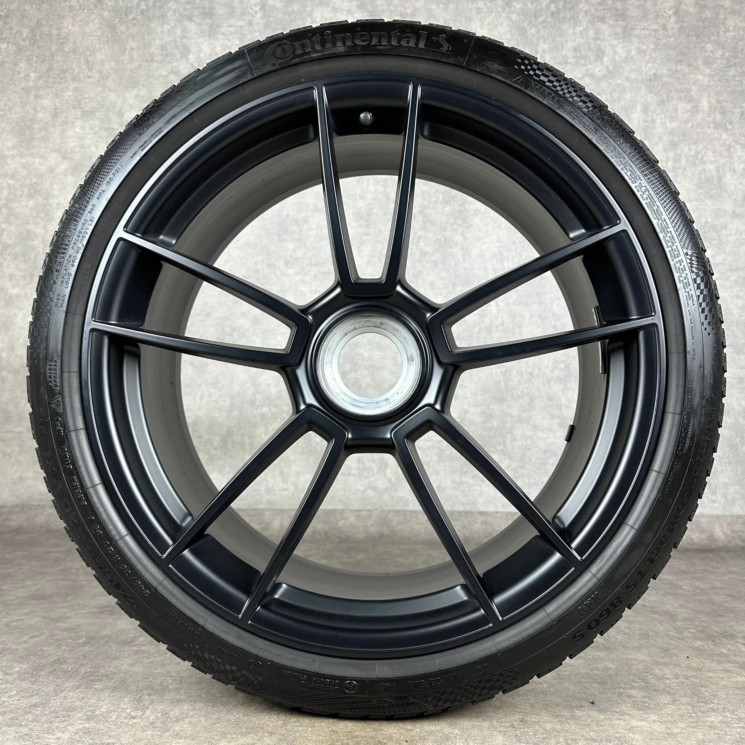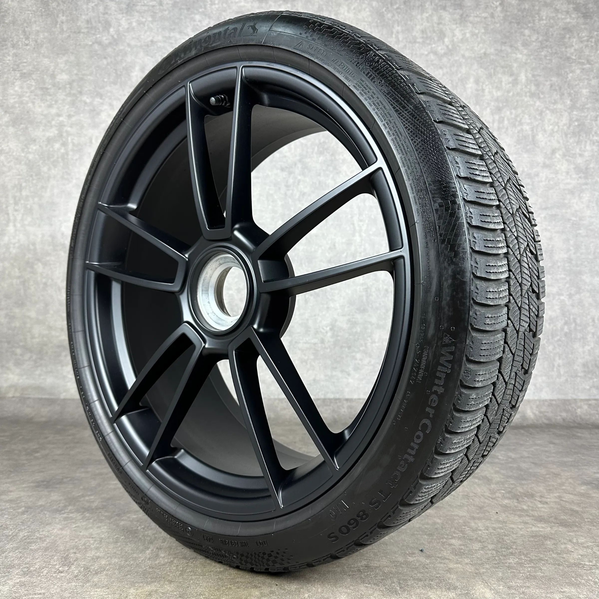 4x Original PORSCHE 911 (992) 20 21 911 Turbo S Felgen Winterkompletträder schwarz seidenglanz Original Lack VA Dimension: 8,5Jx20 ET50 Teilenummer: 992601025AC 245 35 R20 95V Continental WinterContact TS 860S NA0, gebraucht, Profil 7,3mm HA Dimension: 11Jx21 ET66 Teilenummer: 992601025AT 295 30 R21