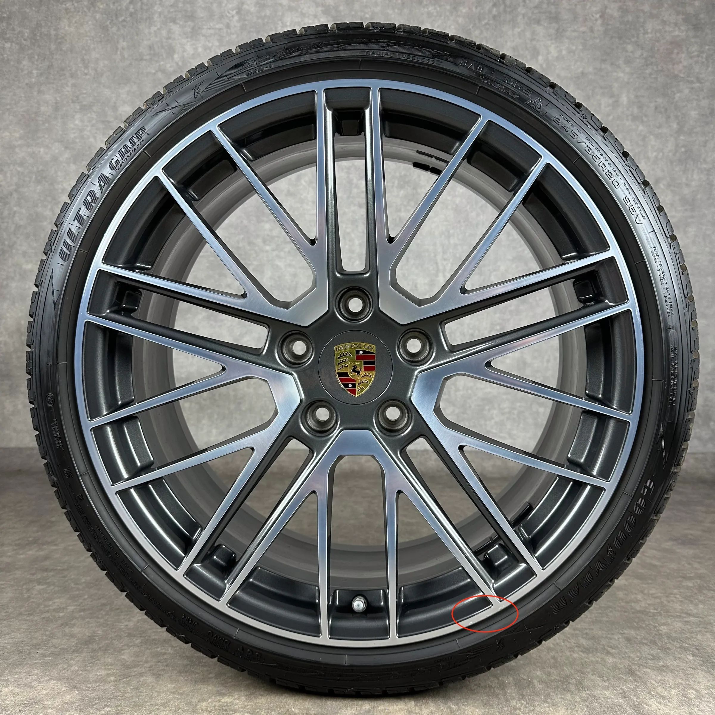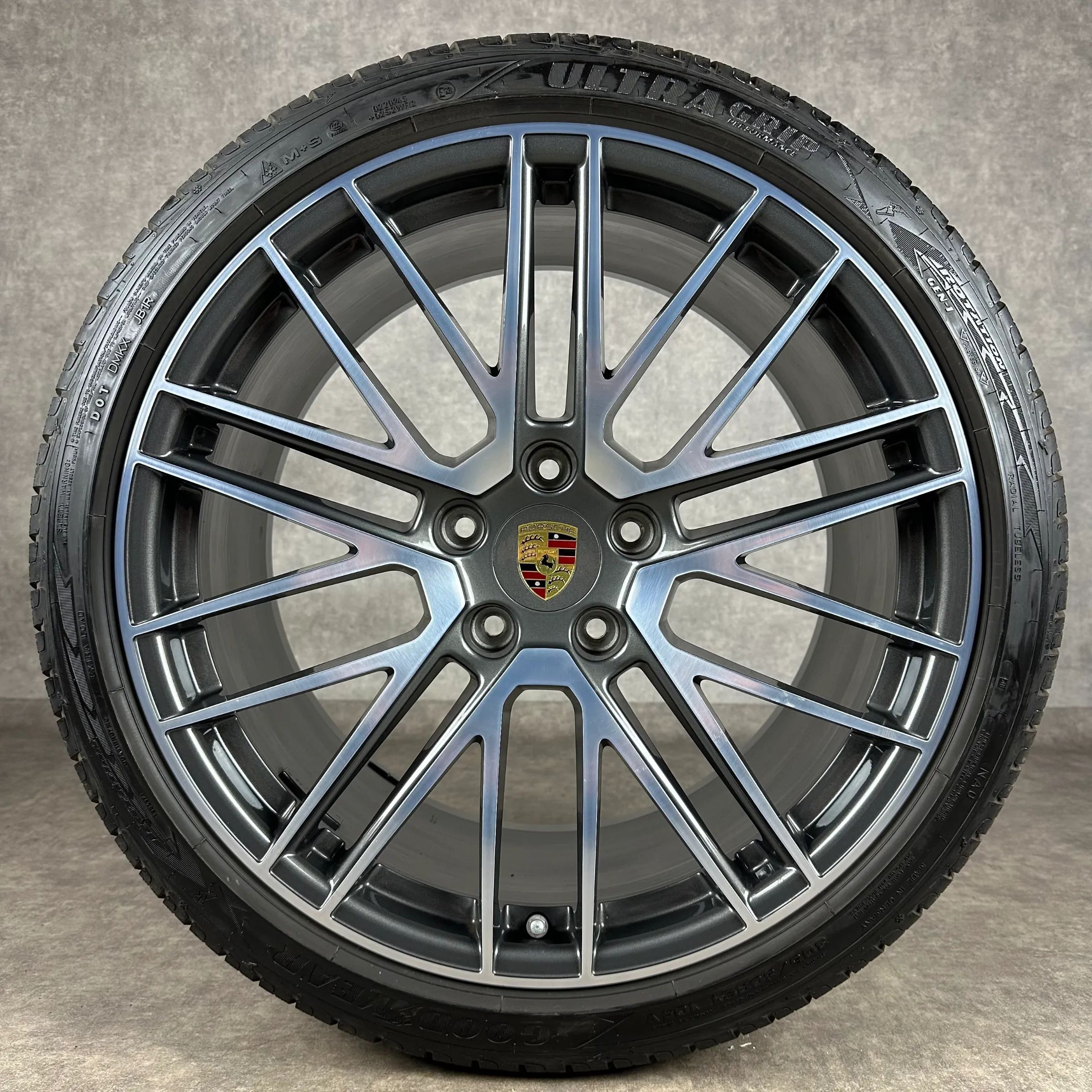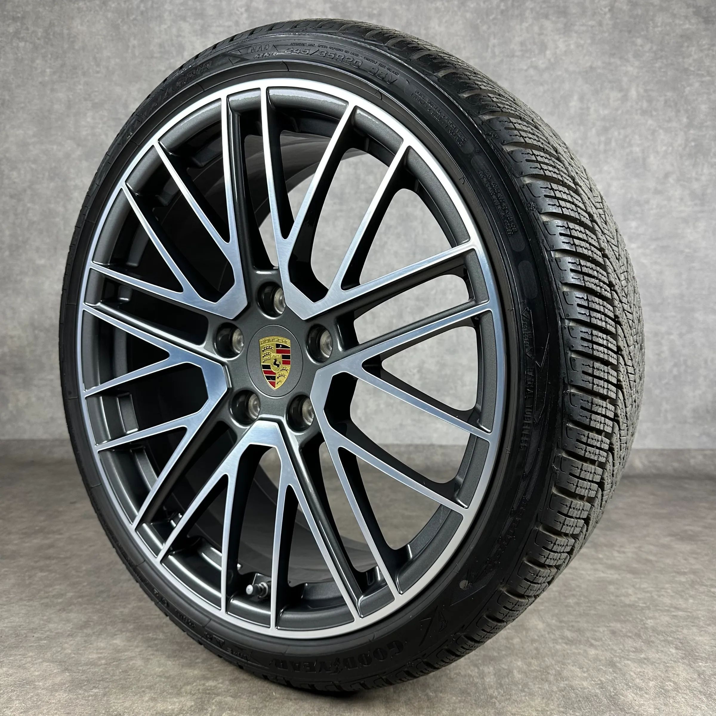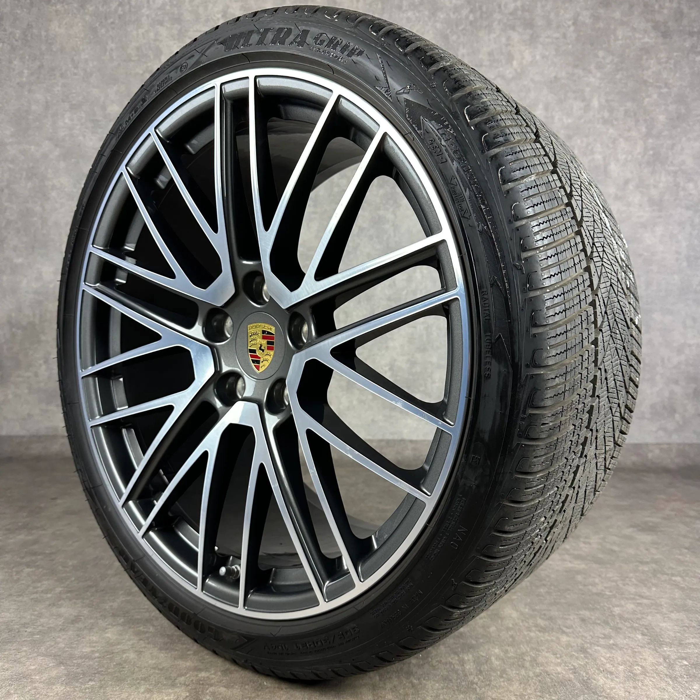 4x Original PORSCHE 911 (992) 20 21 911 Turbo V Felgen Winterkompletträder titandunkel Original Lack VA Dimension: 8,5Jx20 ET40 Teilenummer: 992601025P 245 35 R20 95V Goodyear Ultra Grip Perfomance NA0, gebraucht, Profil 8,3mm HA Dimension: 11Jx21 ET66 Teilenummer: 992601025Q 305 30 R21 104V Goodyea