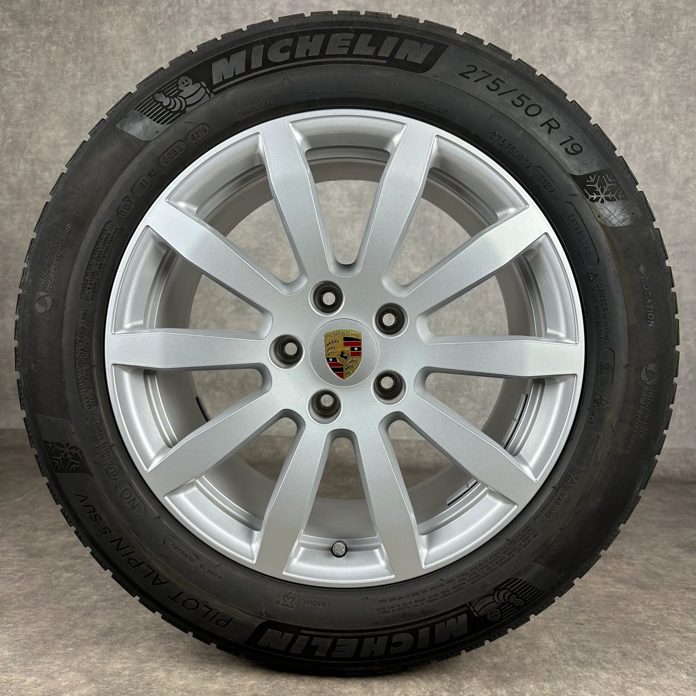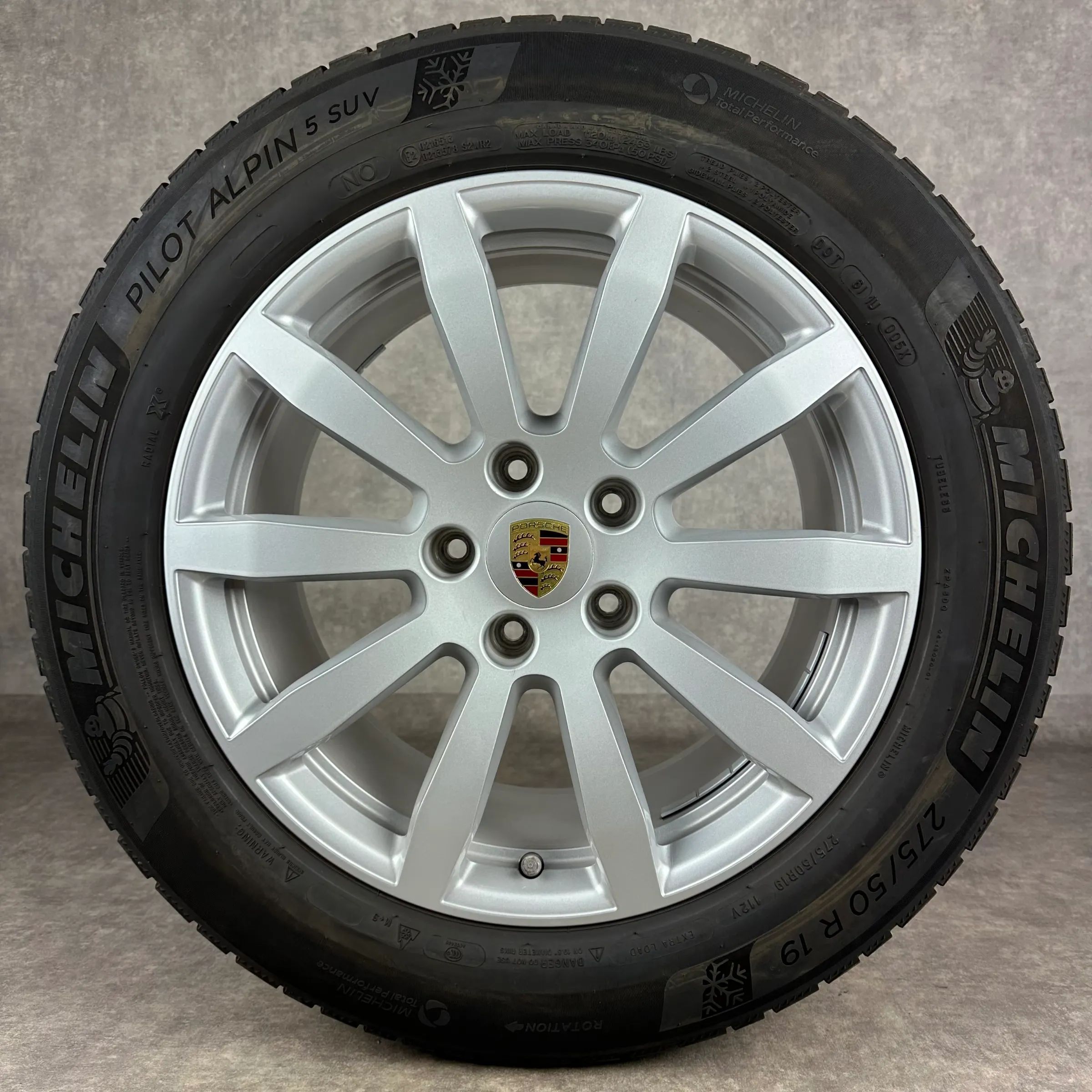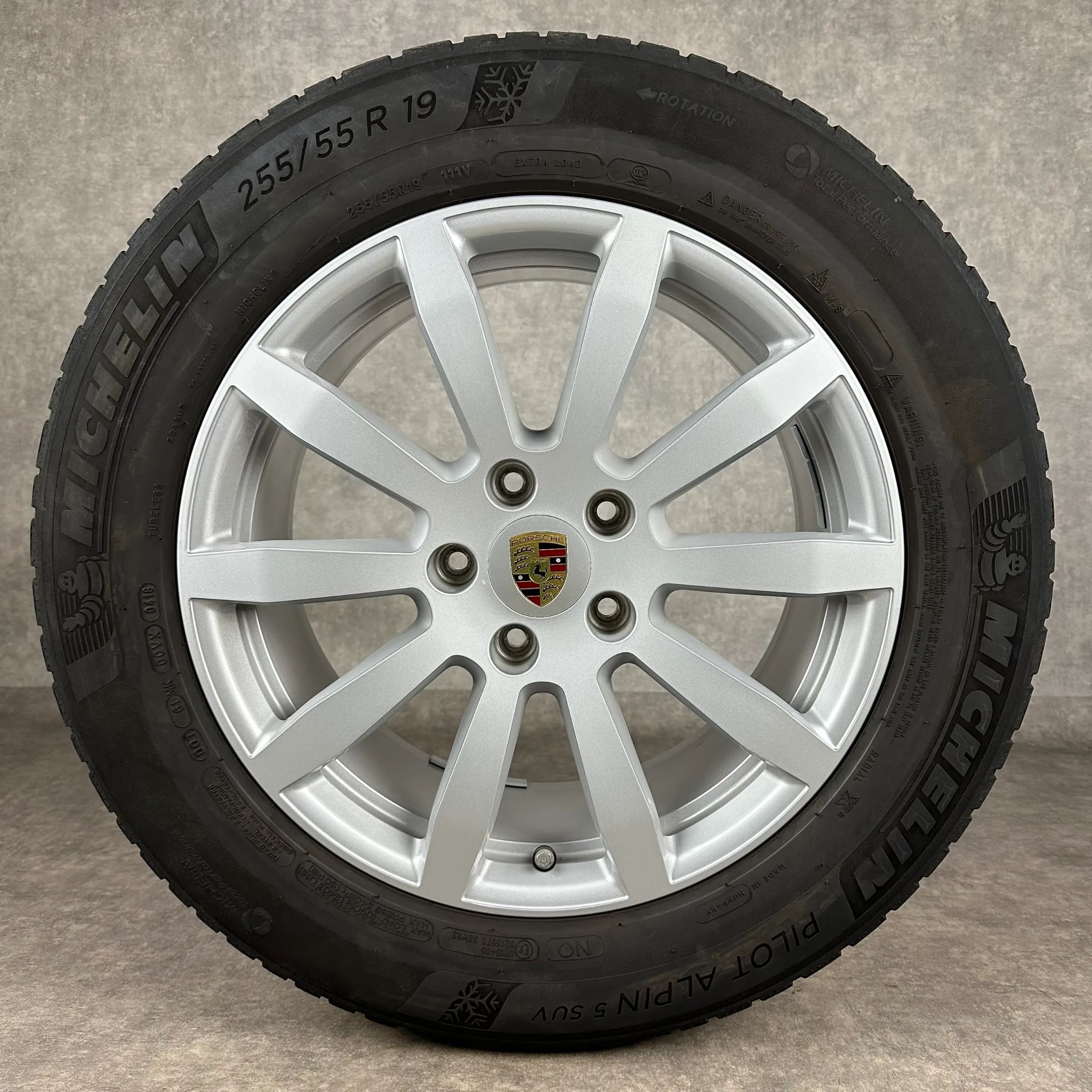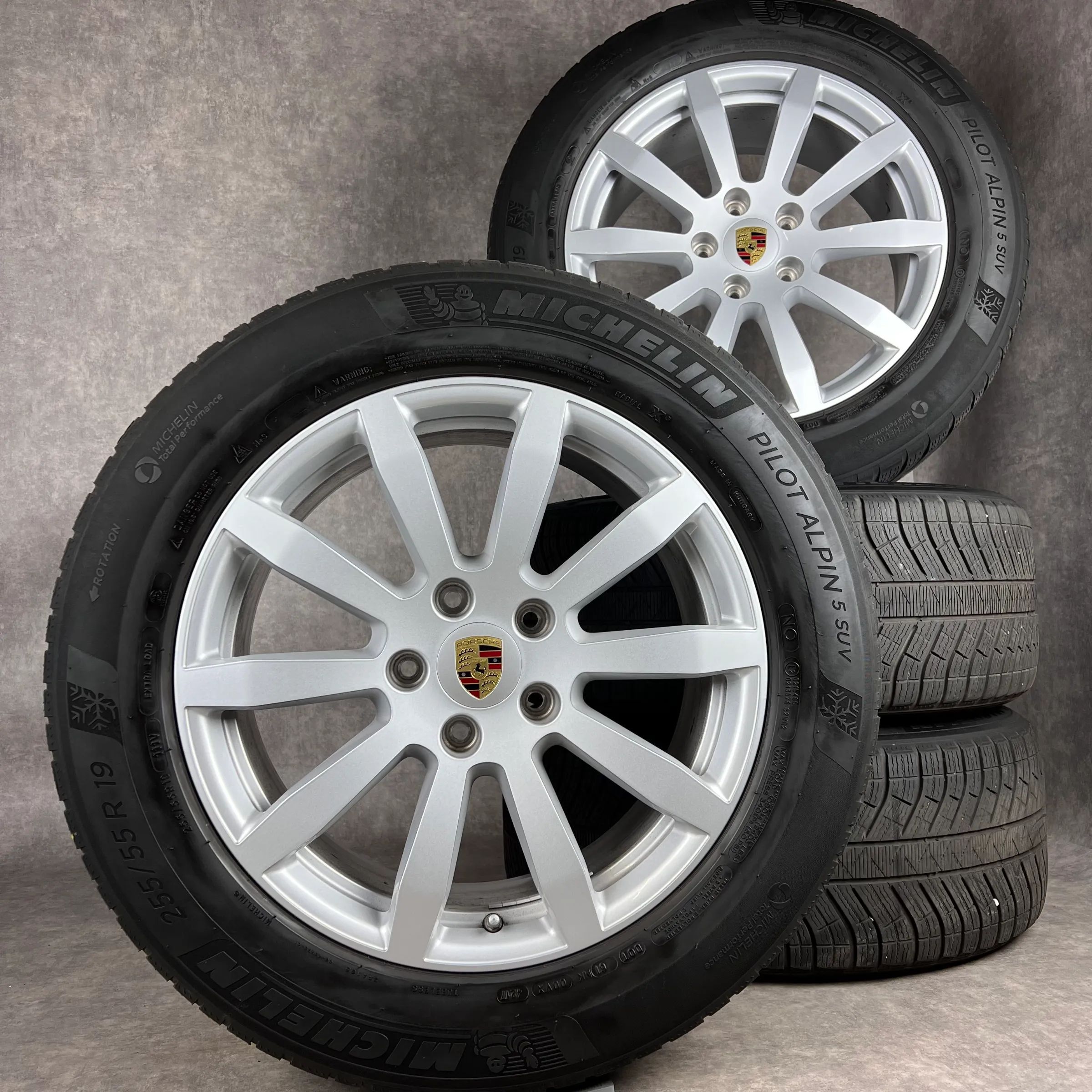 4x Original PORSCHE Cayenne (E3) 19 Cayenne S Felgen Winterkompletträder silber Original Lack VA Dimension: 8,5Jx19 ET47 Teilenummer: 9Y0601025AT 255 55 R19 111V Michelin Pilot Alpin 5 SUV N0, gebraucht, Profil 5,5mm HA Dimension: 9,5Jx19 ET54 Teilenummer: 9Y0601025BA 275 50 R19 112V Michelin Pilot