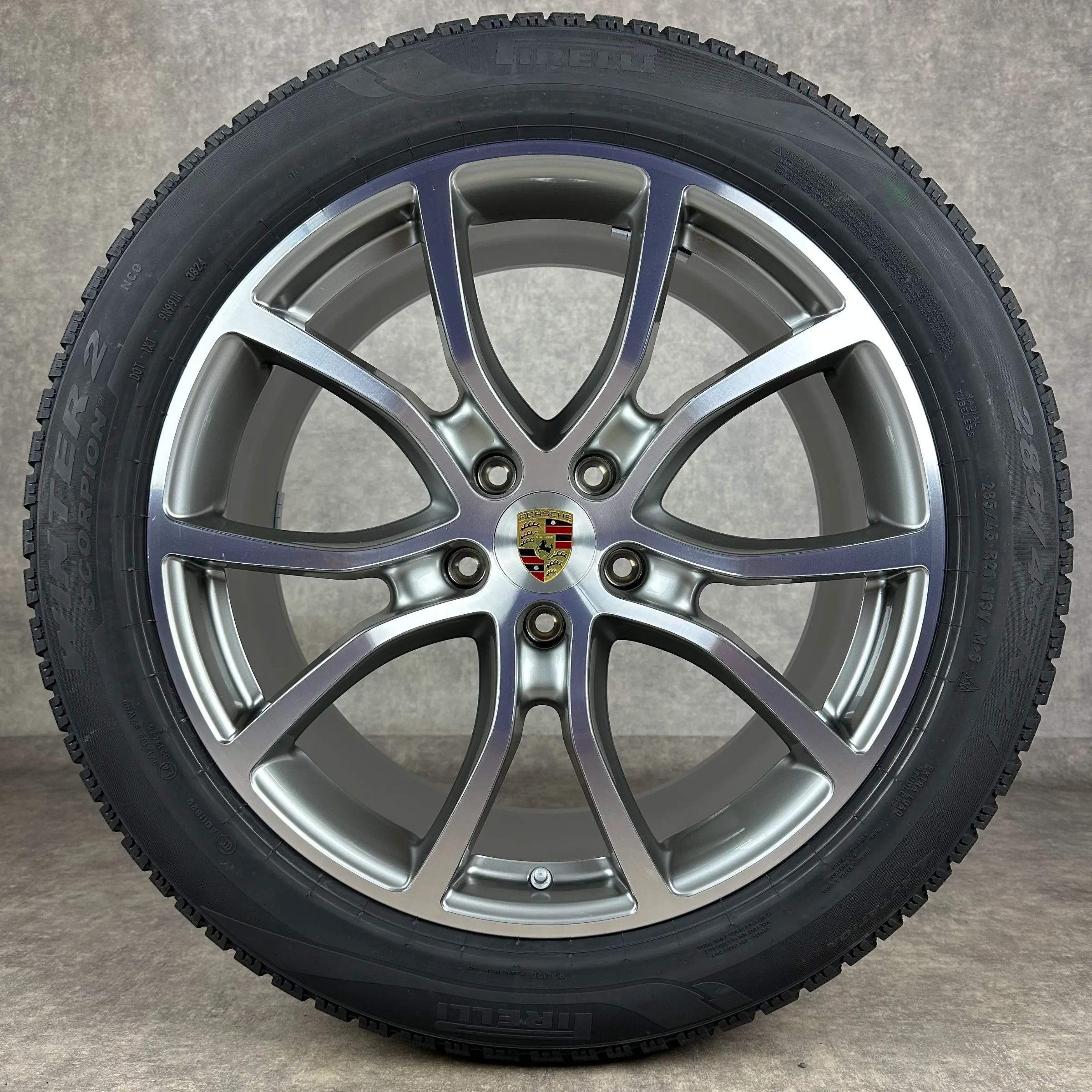 4x Original PORSCHE Cayenne (E3 II) 21 Exclusive Design Felgen Winterkompletträder platinsilber inklusive glanzdrehbereichen Original Lack VA Dimension: 9,5Jx21 ET46 Teilenummer: 9Y0601025DB 285 45 R21 113V Pirelli Scorpion Winter 2 NC0, gebraucht, Profil 7,2mm HA Dimension: 11Jx21 ET58 Teilenummer: