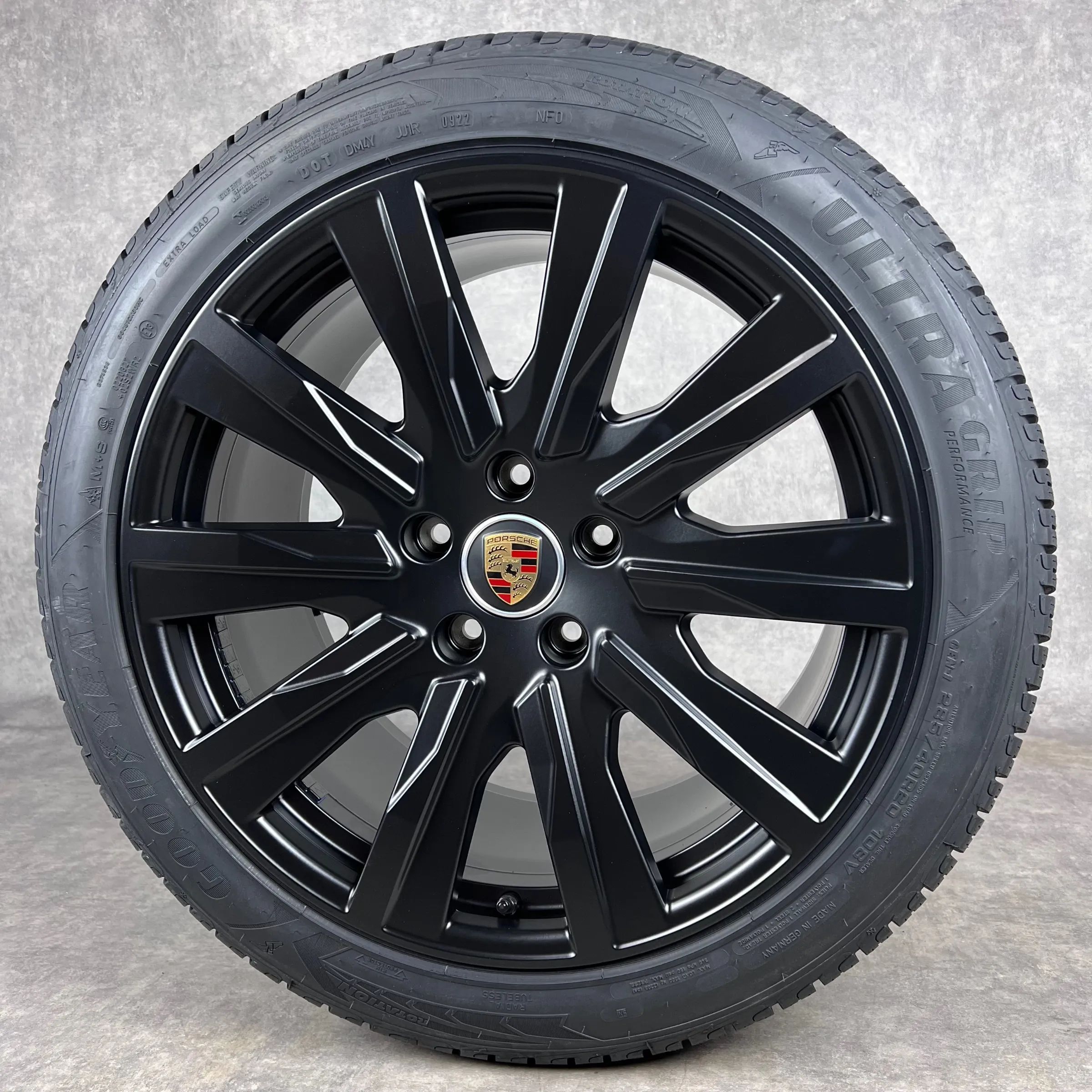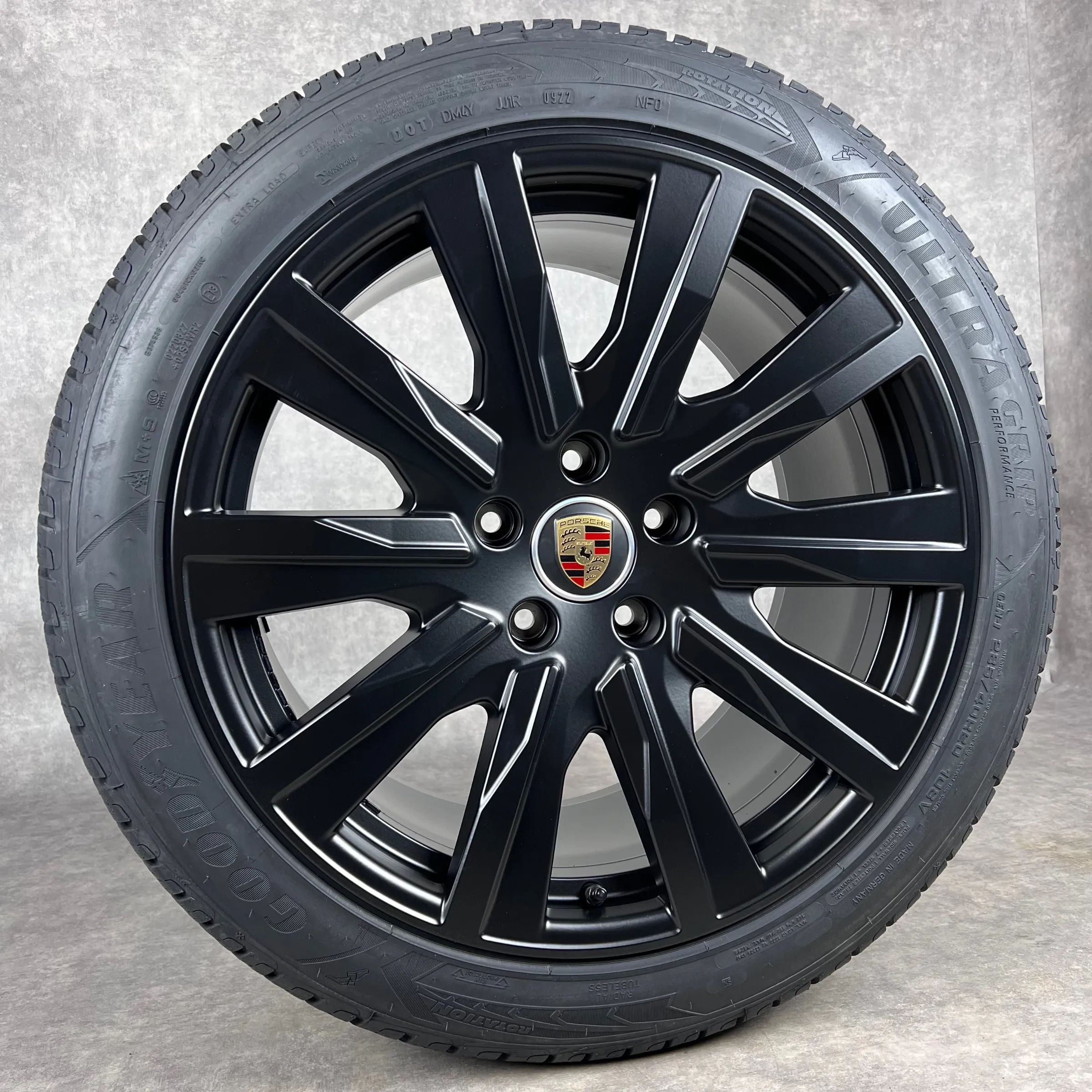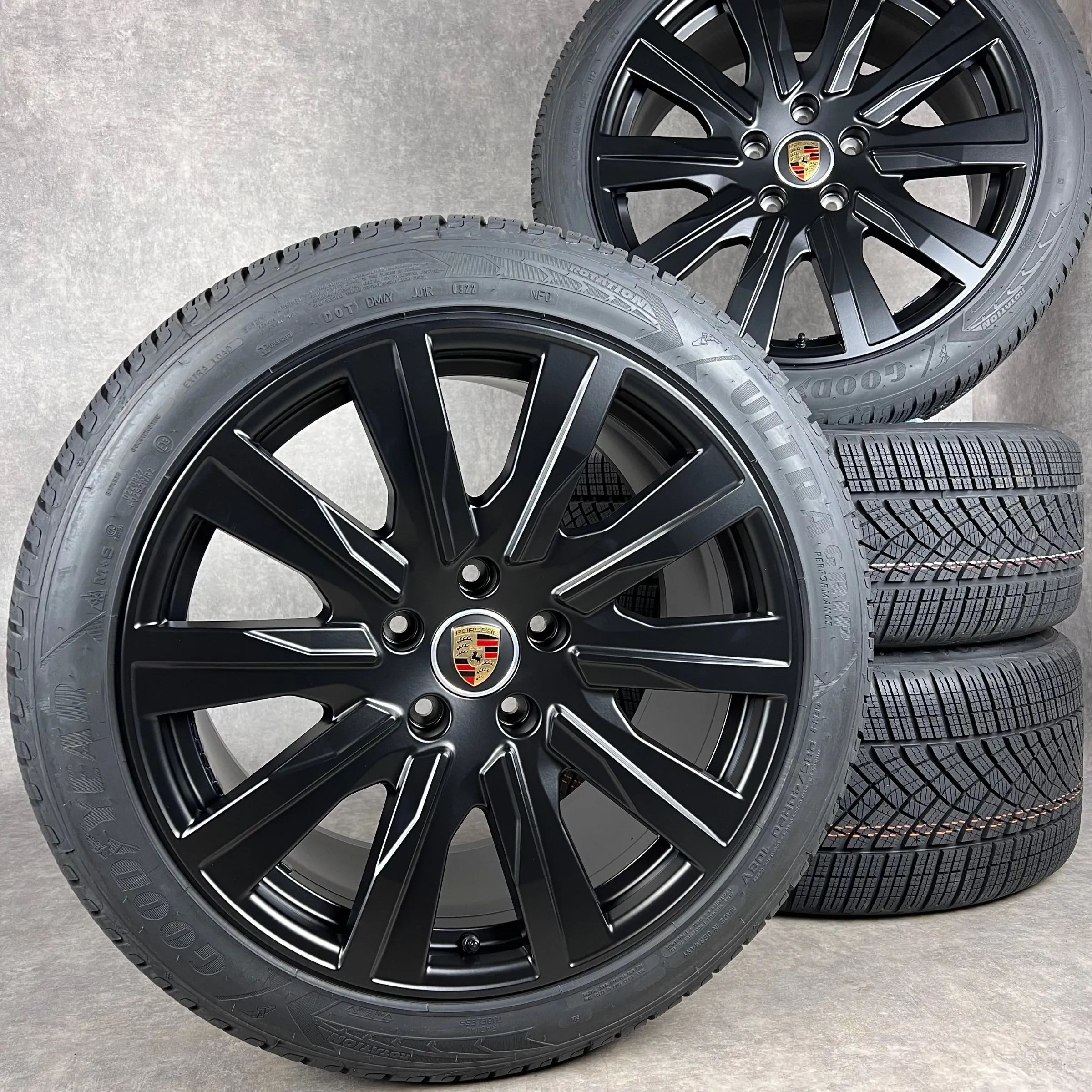 4x Original PORSCHE Taycan, Taycan Sport Turismo, Taycan (J1), Taycan Cross Turismo 20 Tequipment Design Felgen Winterkompletträder schwarz seidenglanz VA Dimension: 9Jx20 ET54 Teilenummer: 9J1601025L 245 45 R20 103V Goodyear Ultra Grip Perfomance NF0, neu HA Dimension: 11Jx20 ET60 Teilenummer: 9J16