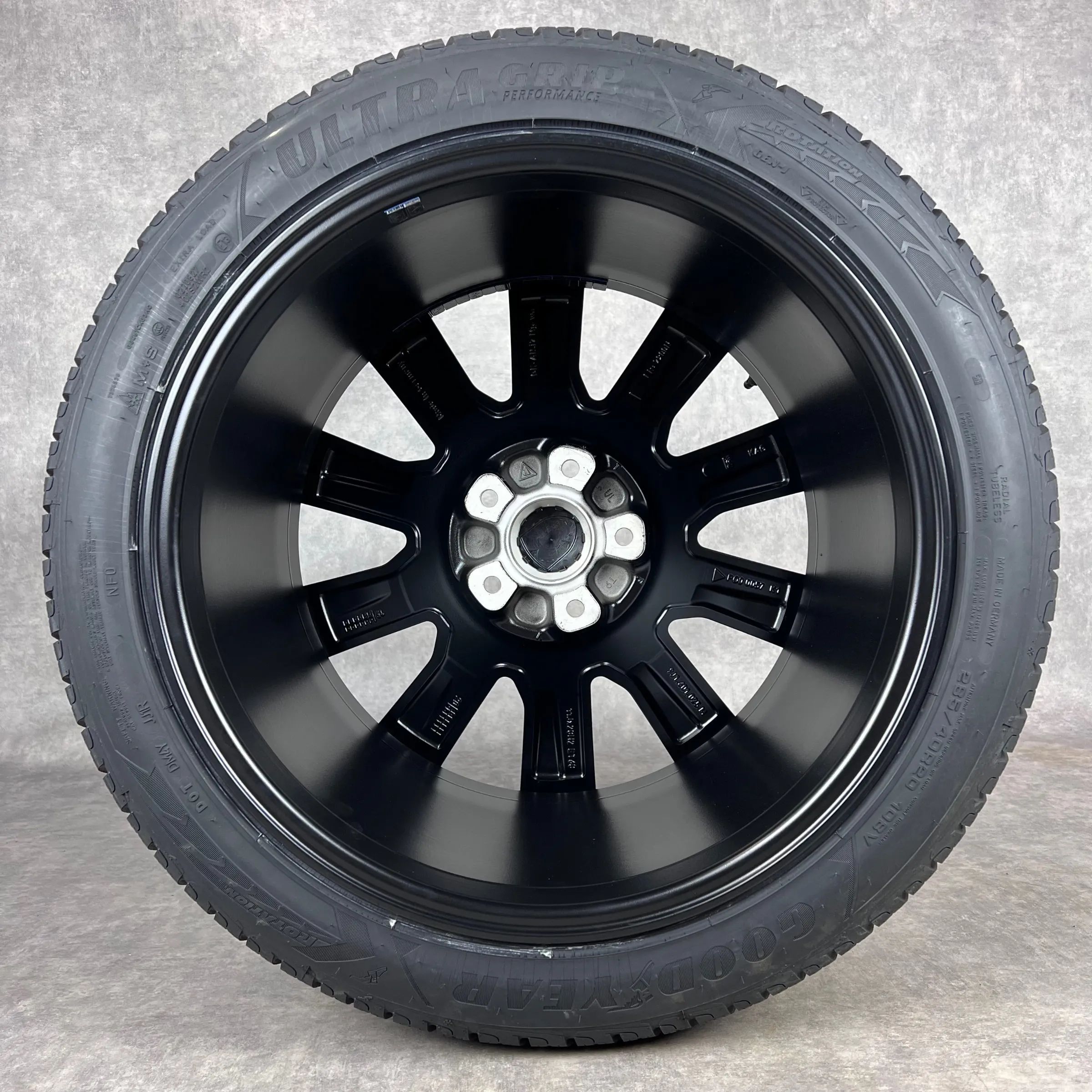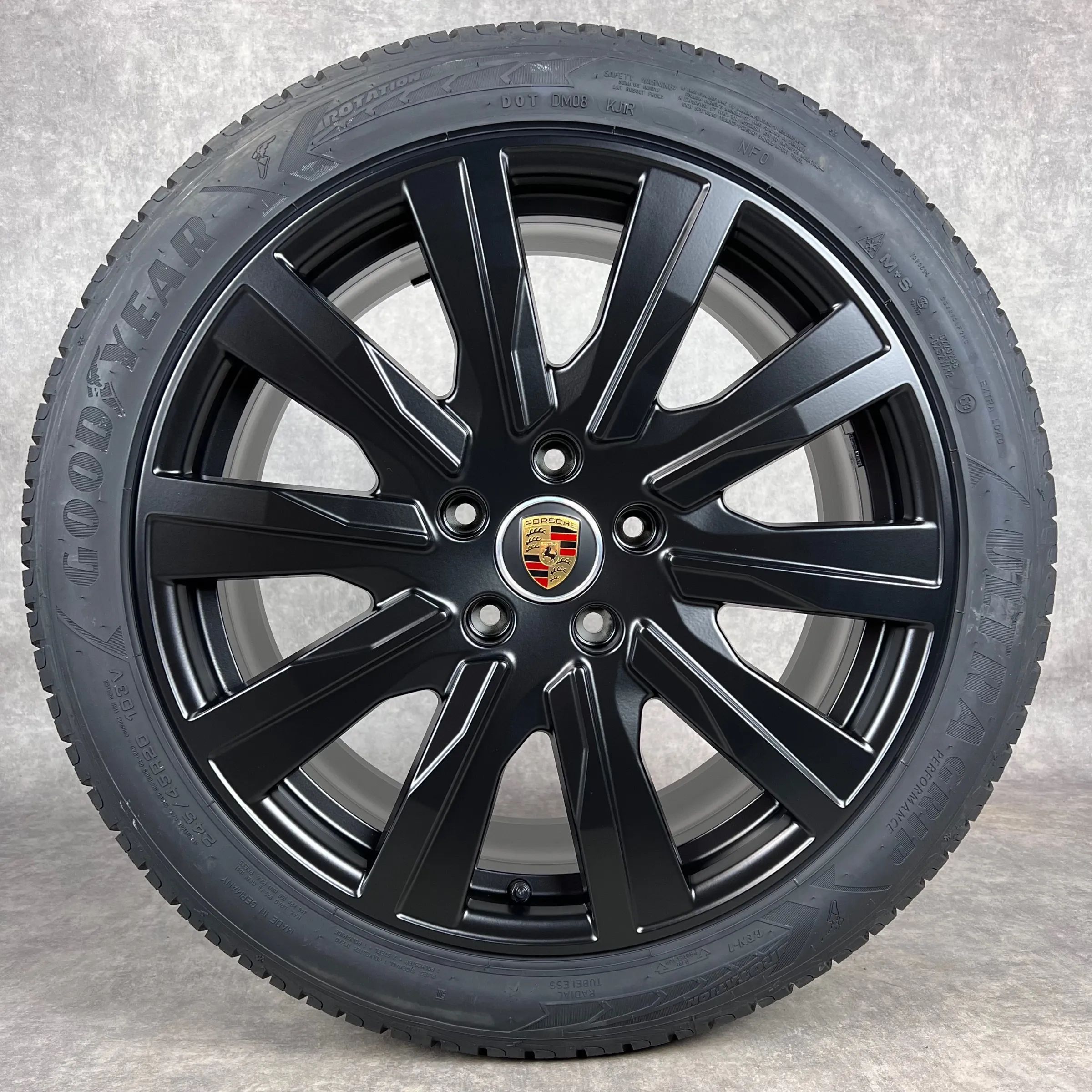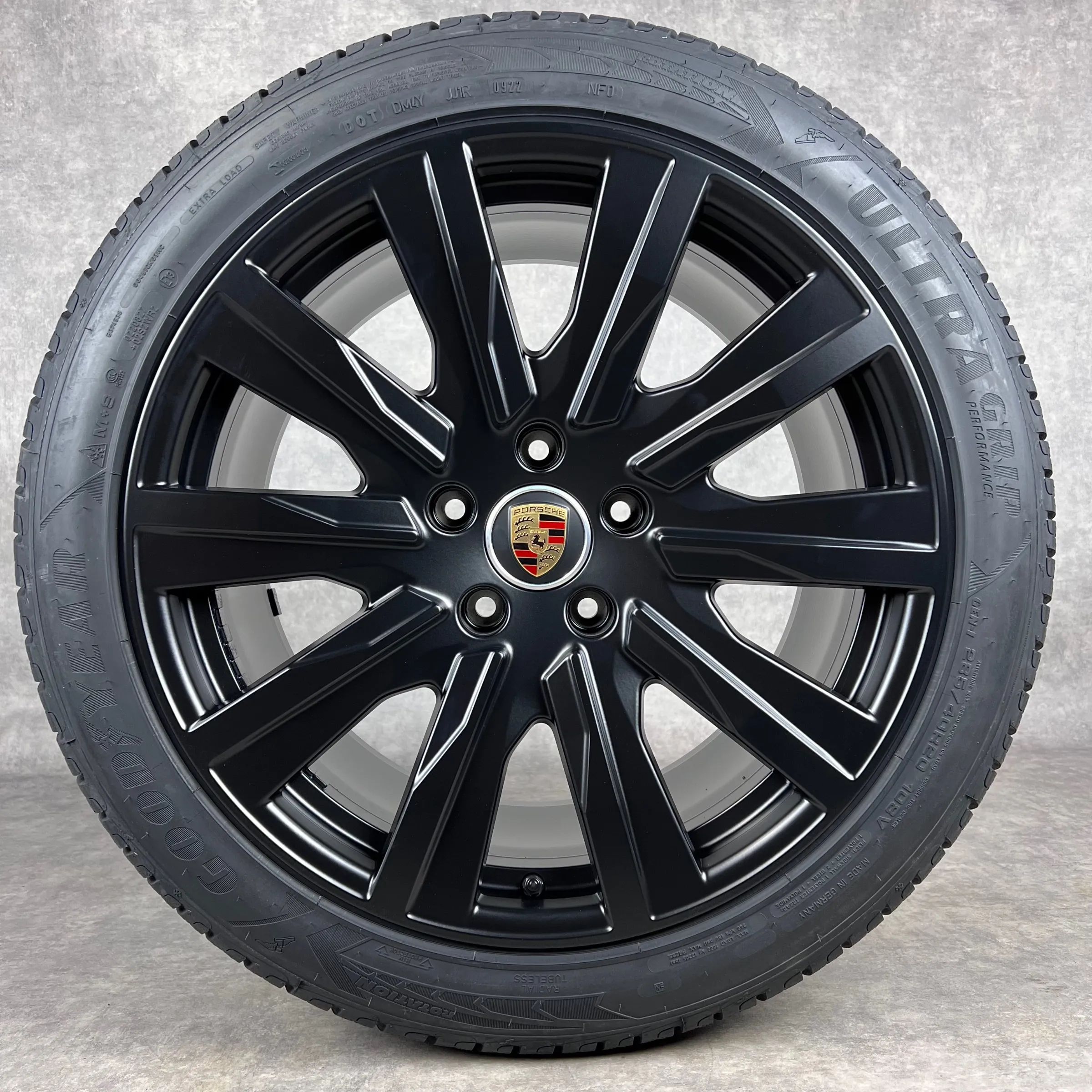 4x Original PORSCHE Taycan, Taycan Sport Turismo, Taycan (J1), Taycan Cross Turismo 20 Tequipment Design Felgen Winterkompletträder schwarz seidenglanz VA Dimension: 9Jx20 ET54 Teilenummer: 9J1601025L 245 45 R20 103V Goodyear Ultra Grip Perfomance NF0, neu HA Dimension: 11Jx20 ET60 Teilenummer: 9J16