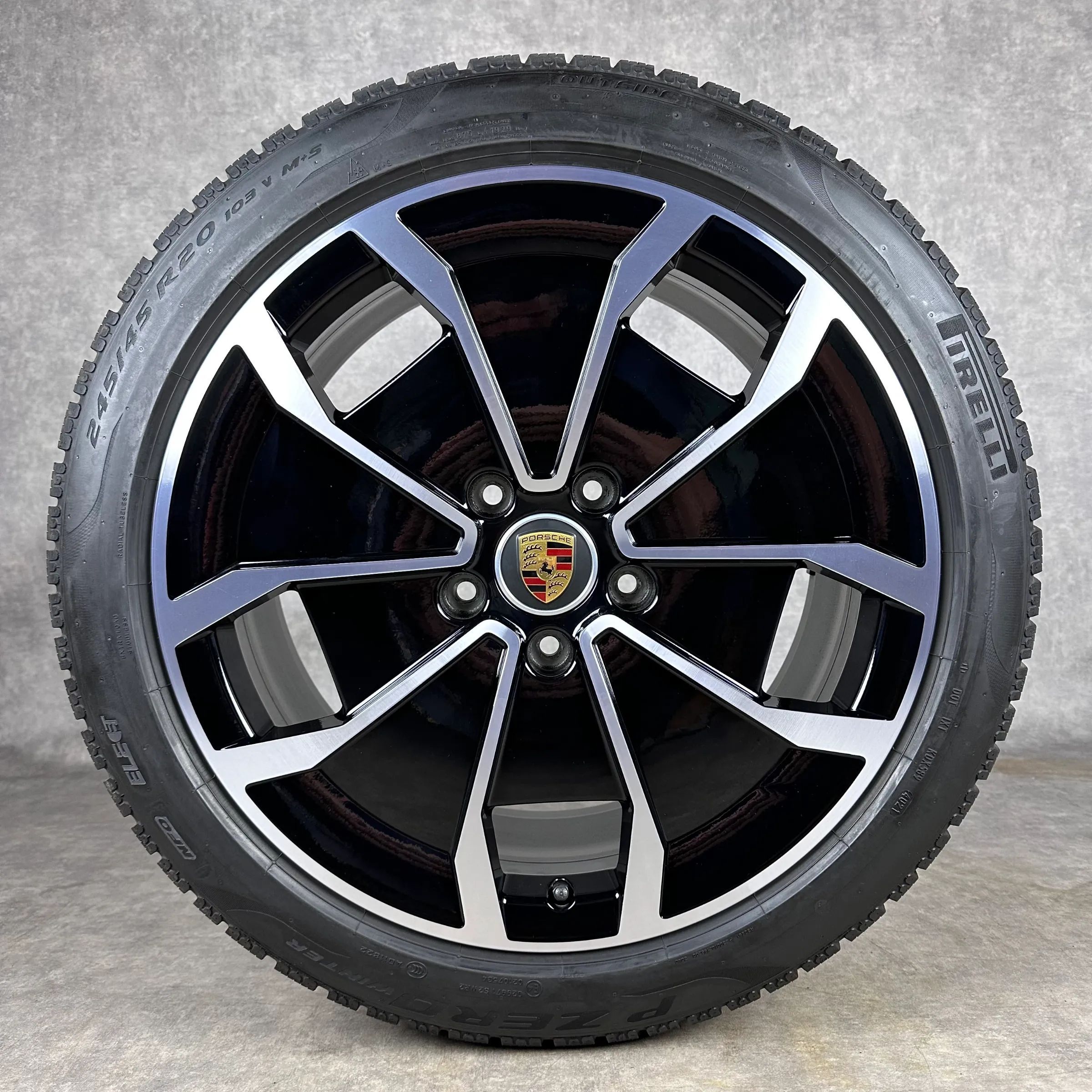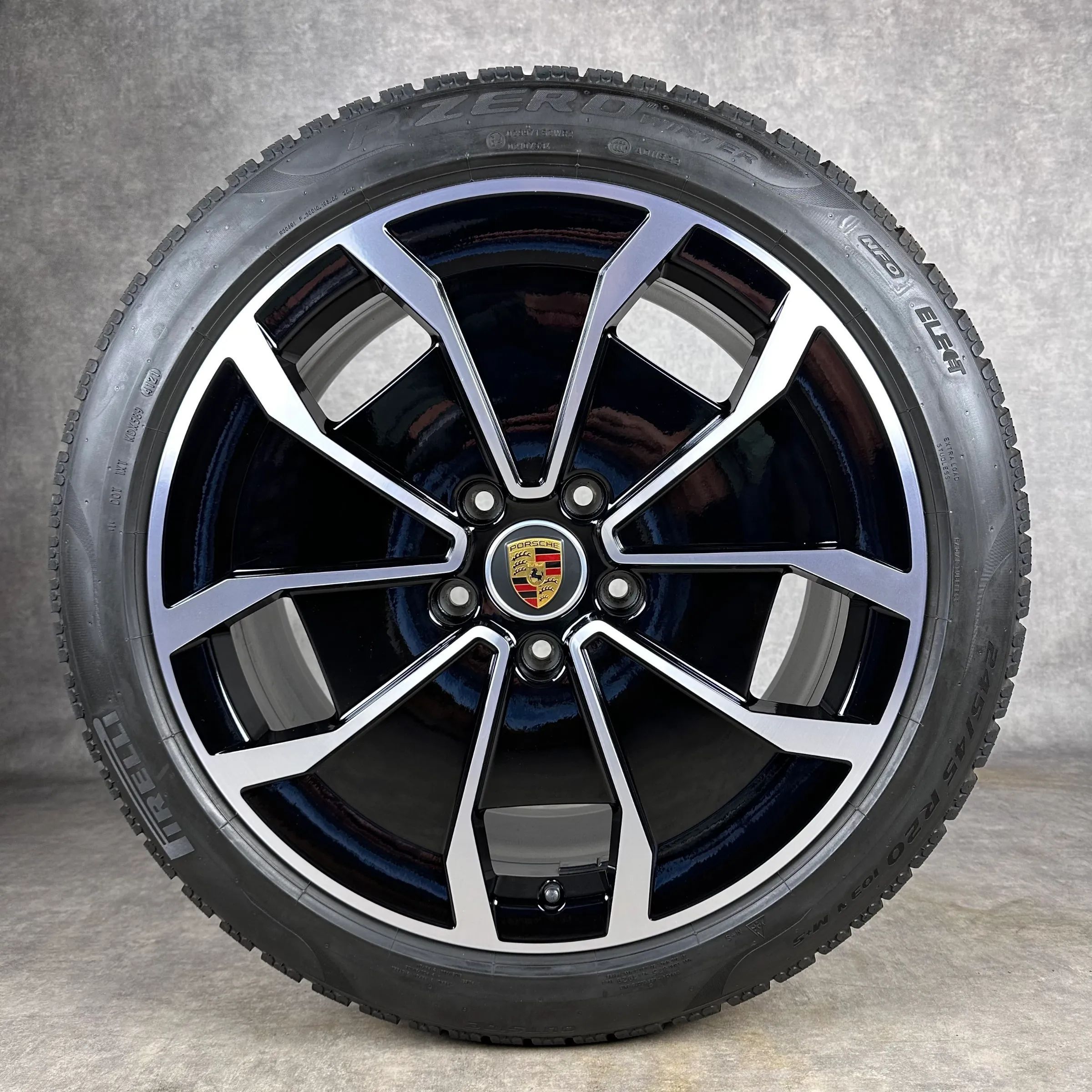 4x Original PORSCHE Taycan (J1), Taycan (J1 II) 20 Turbo Aero Felgen Winterkompletträder schwarz hochglanz, mit glanzdrehbereichen Original Lack VA Dimension: 9Jx20 ET54 Teilenummer: 9J1601025AJ 245 45 R20 103V Pirelli PZERO Winter NF0, gebraucht, Profil 7,3mm HA Dimension: 11Jx20 ET60 Teilenummer: