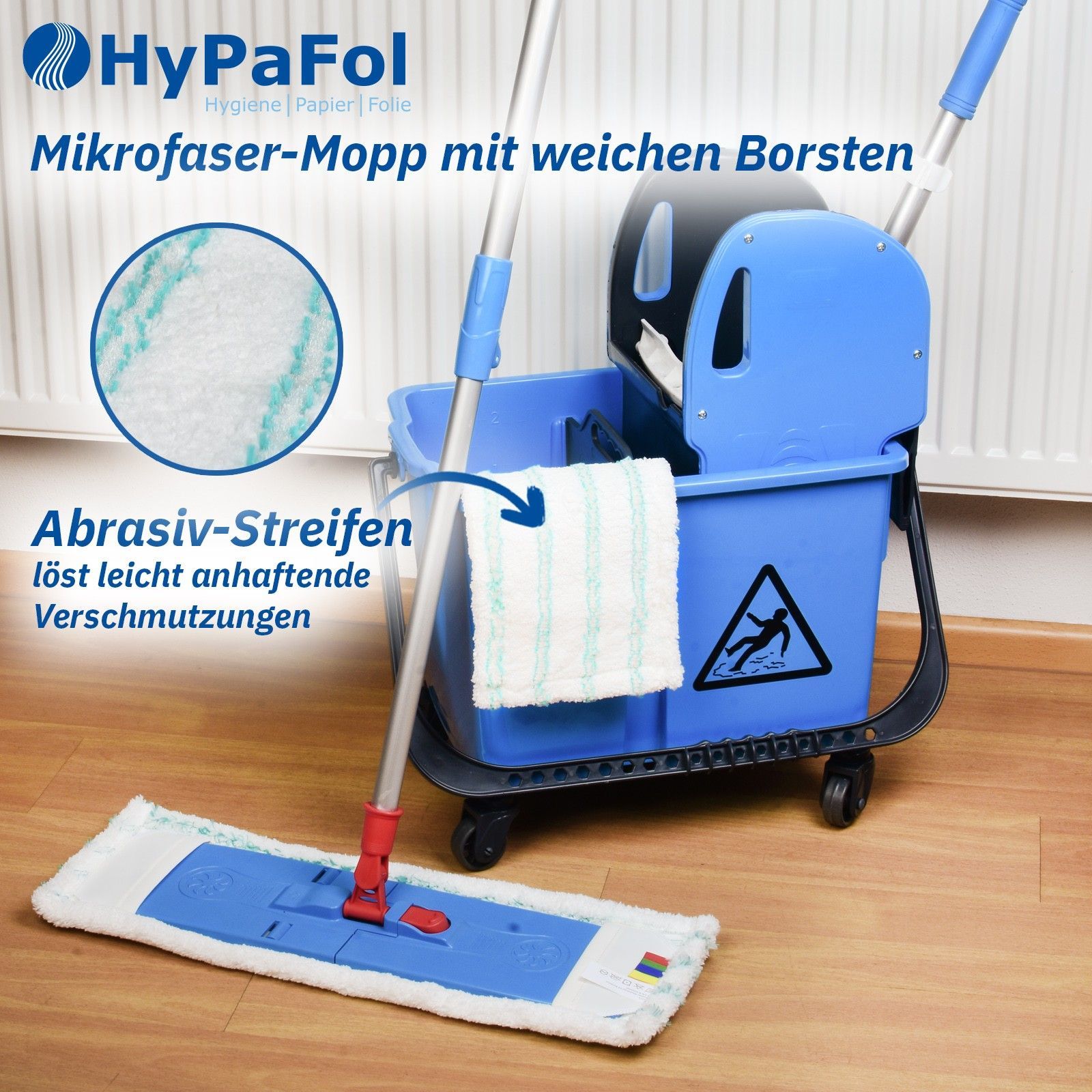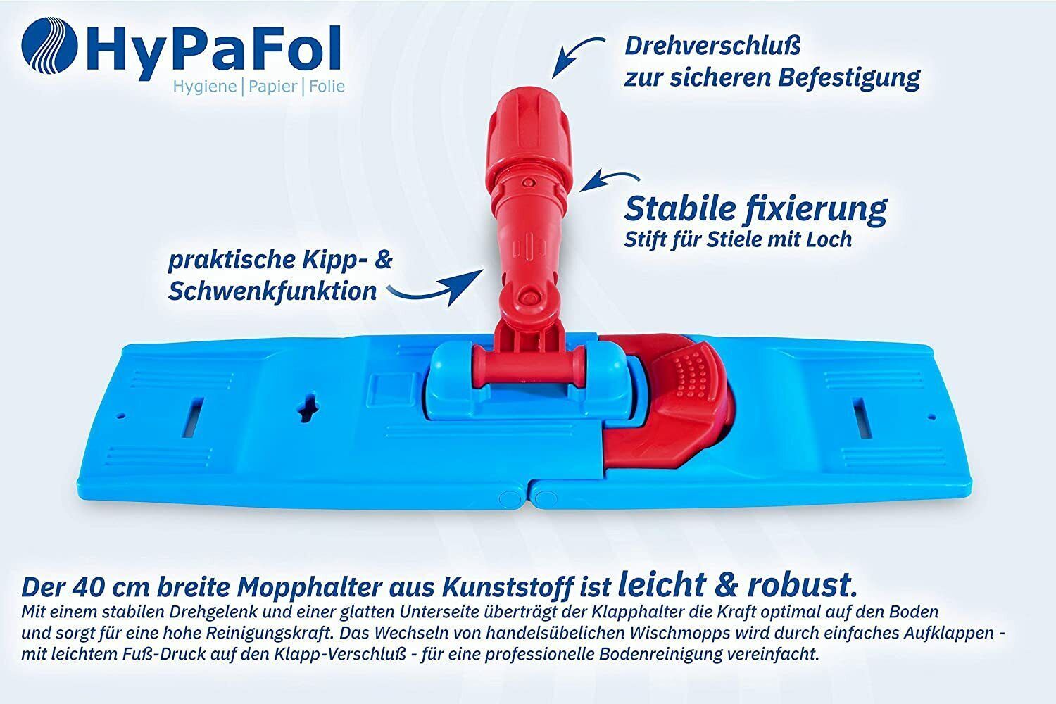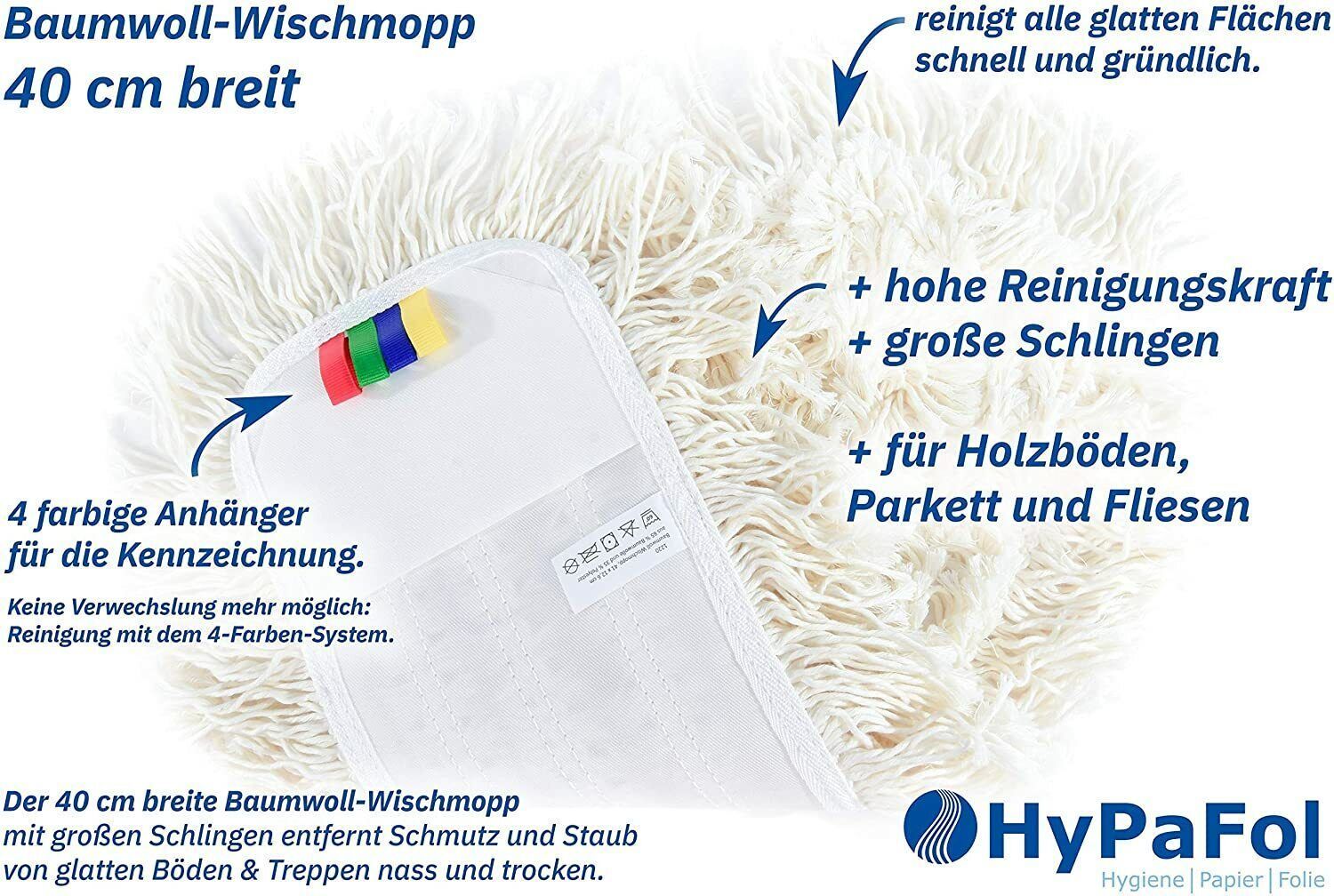 Im Komplettset enthalten: 1x Teleskopstiel (90-180cm) 1x Wisch-Bezug (40cm), Bezug nach Wahl 1x Wischmopphalterung Ob privat oder geschäftlich – achten Sie mit den ergonomischen Bodenwischer von Hypafol auf Ihre Gesundheit. Durch den flexibel verstellbaren Alu-Stiel können Sie die Länge indivi