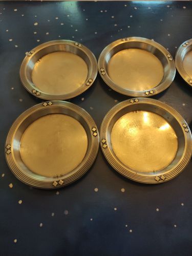 Sie erhalten sechs sehr schöne Glasuntersetzer Untersetzer Schälchen Nussschälchen Würfel Muster um 1907 Entwurf von Albin Müller. Diese Art der Schälchen ist sehr selten zu finden. Die Untersetzer wurden über 100 Jahre benutzt, dafür guter Zustand . Leichte Gebrauchsspuren bitte sehen sie sich vor