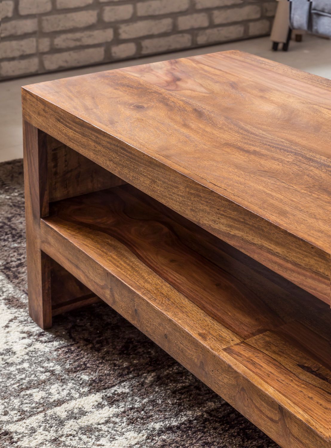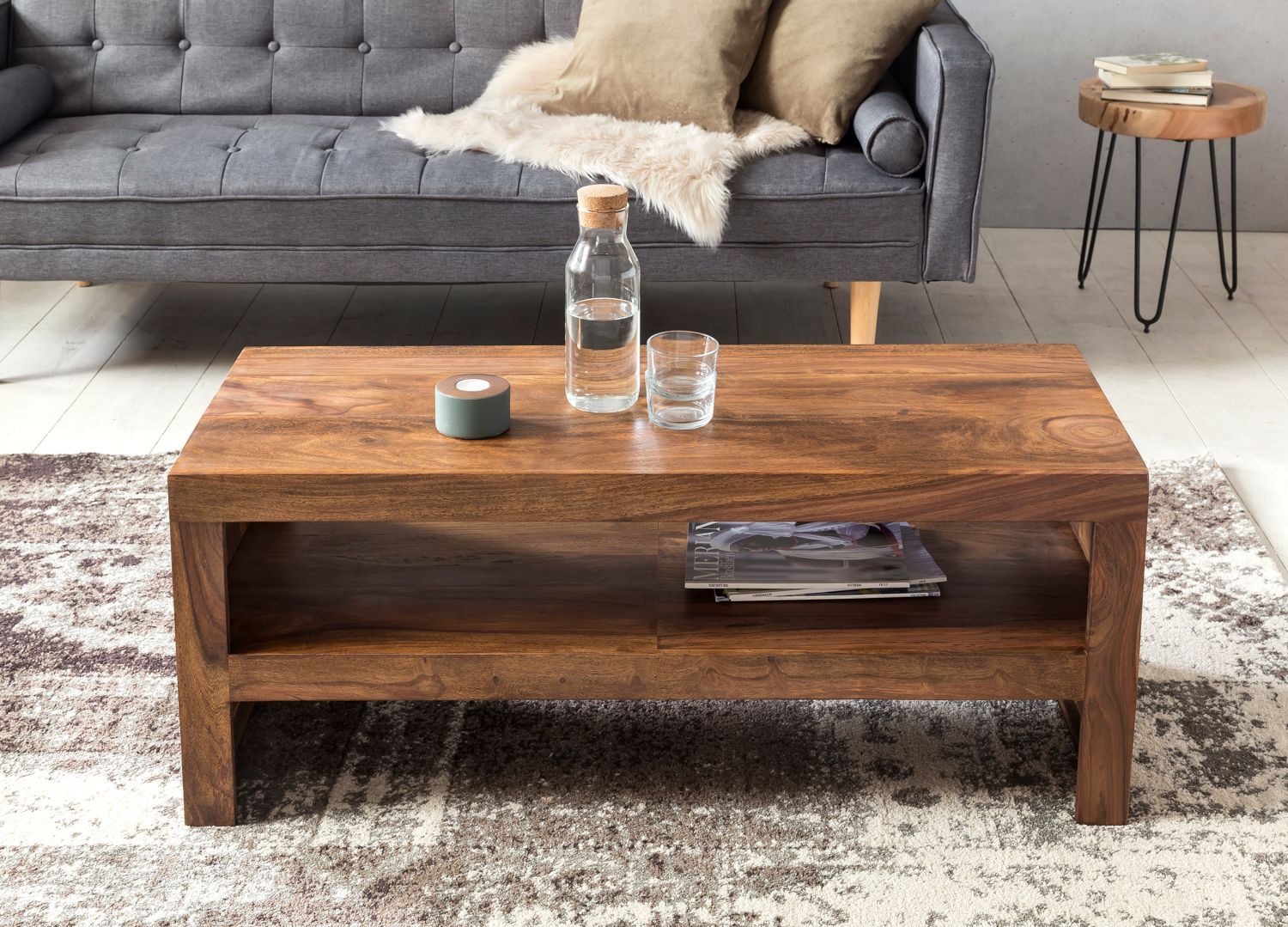 • Wohnling Couchtisch 90x50x40 cm Sofatisch Sheesham Massivholz Tisch mit Stauraum