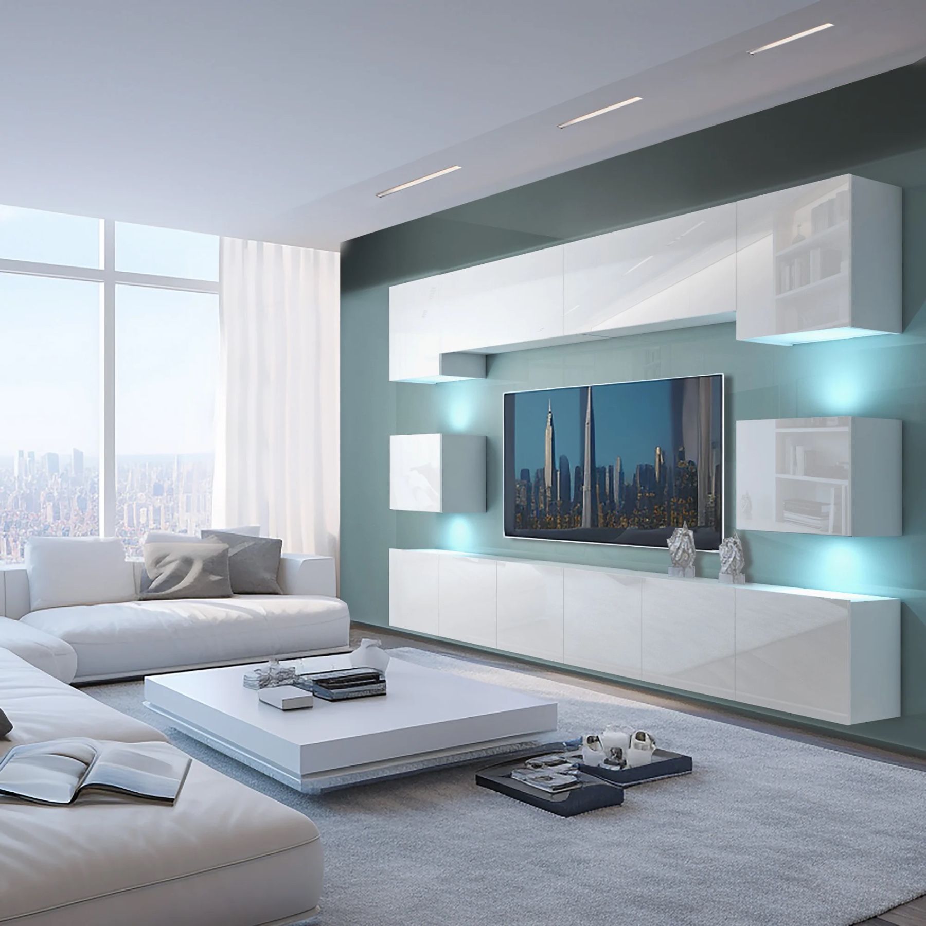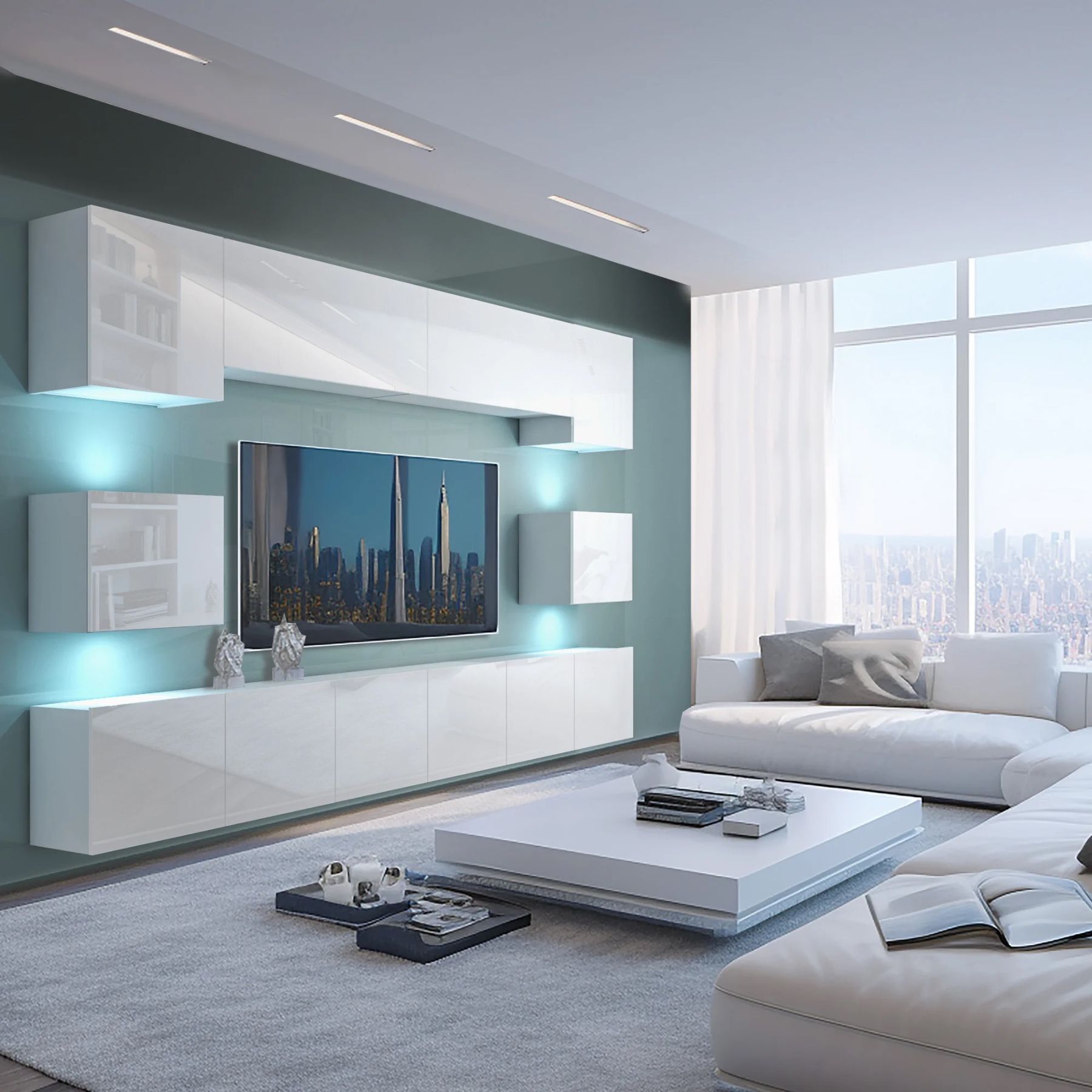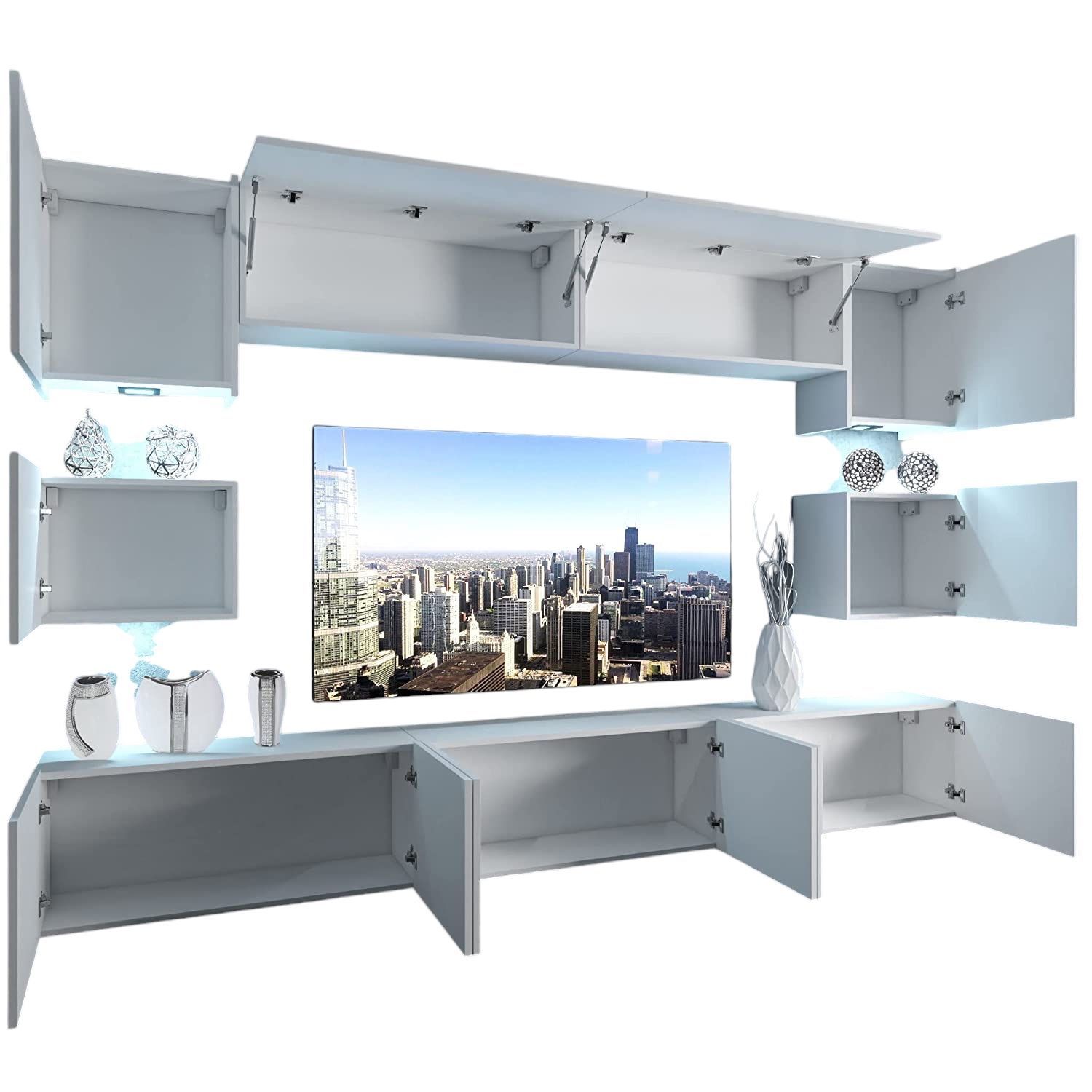 Wohnwand 3W-A mit LED Beleuchtung, Ohne Griffe. Breite 300 cm, Farbe Weiß