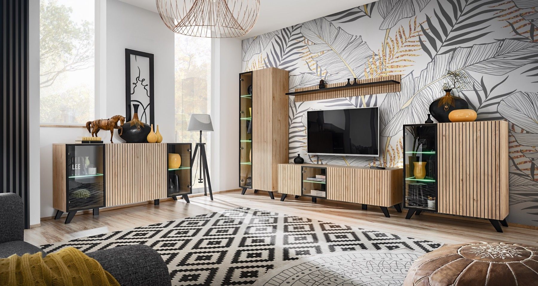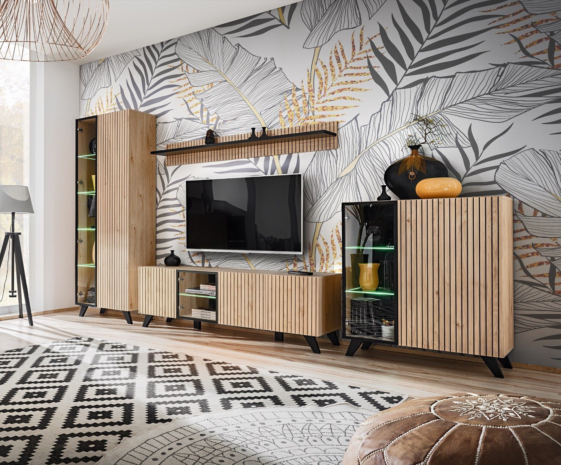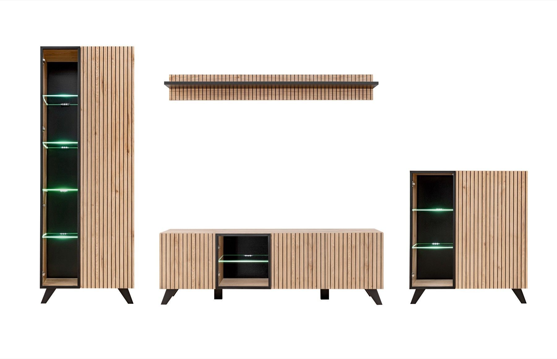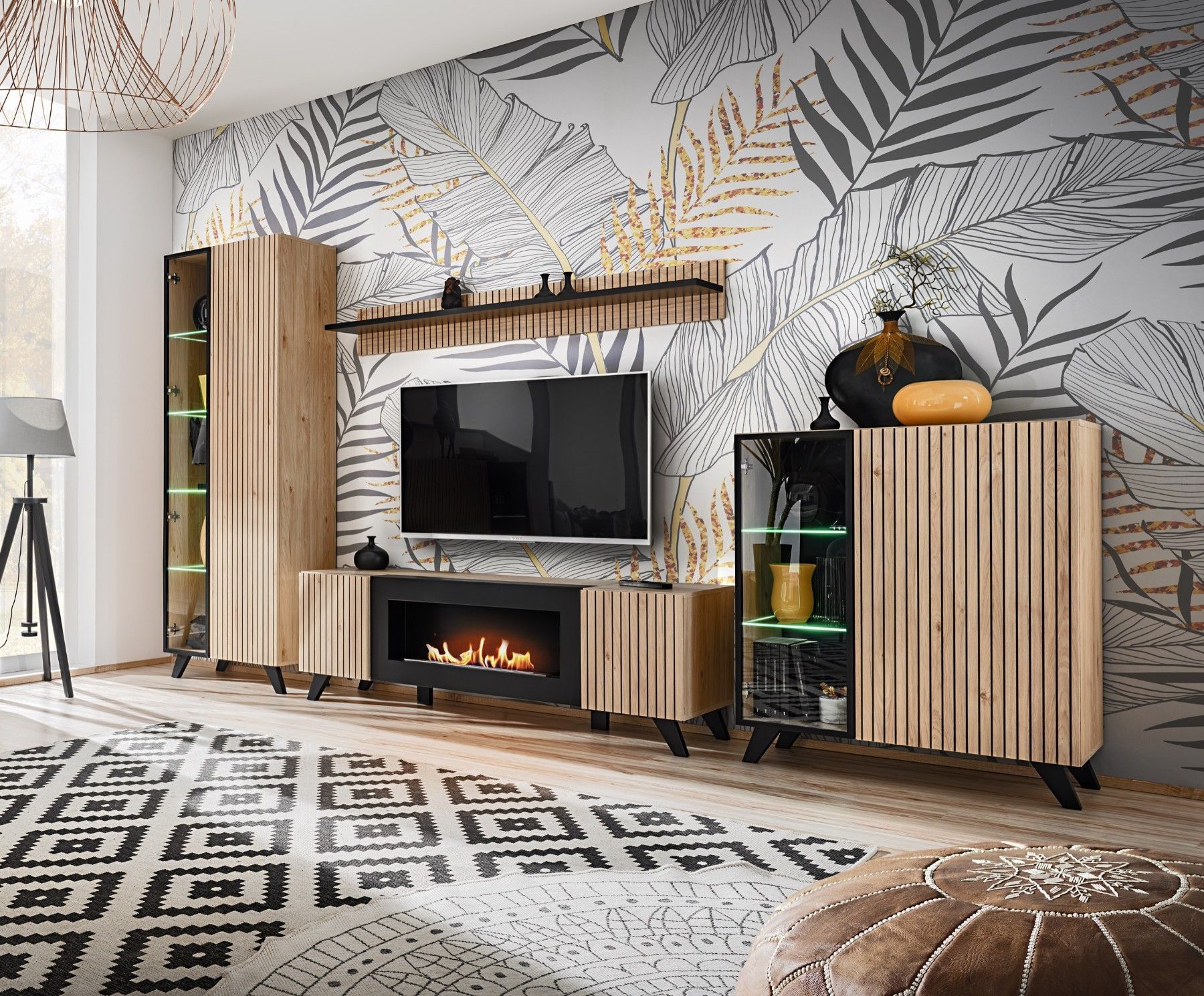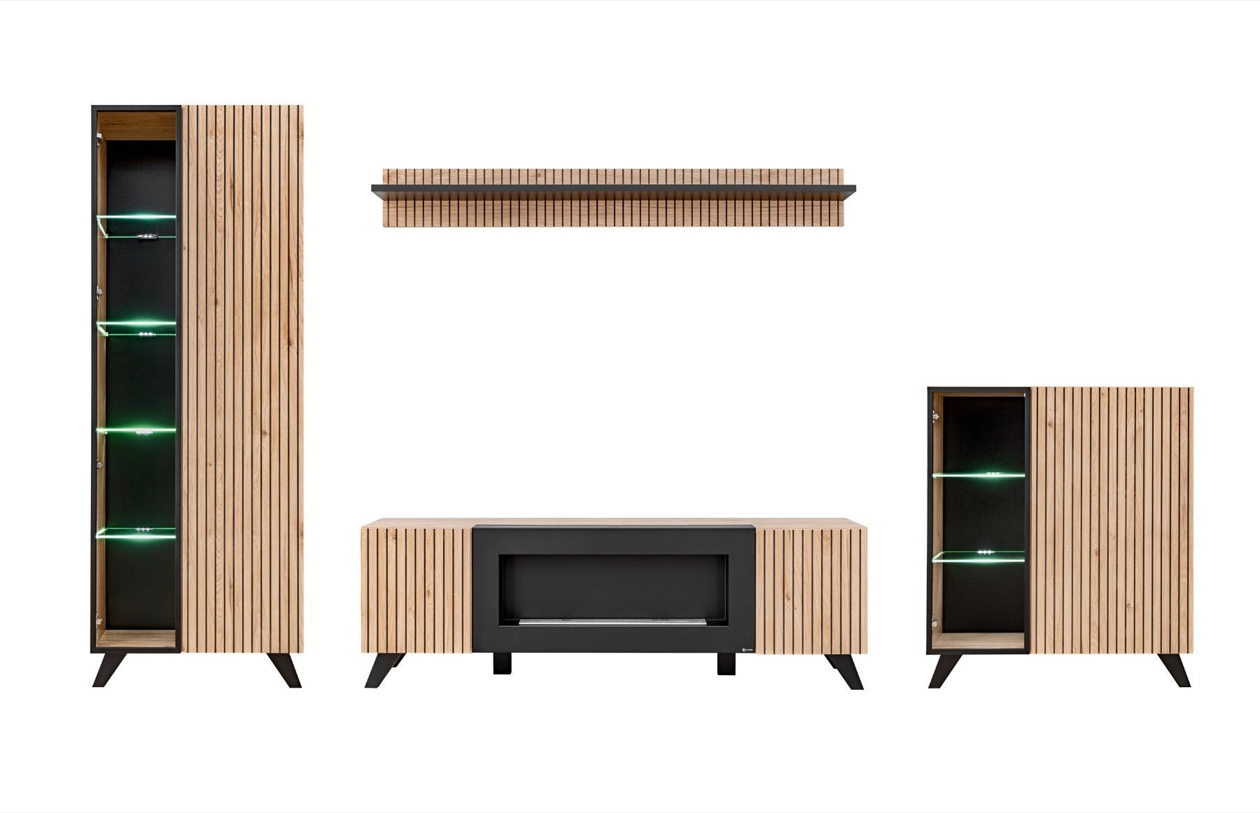 Wohnwand Anbauwand LIAM mit Lamellen und Bio Ethanol Kamin LED und Push - Click