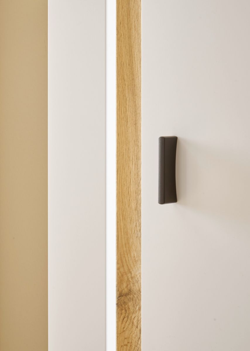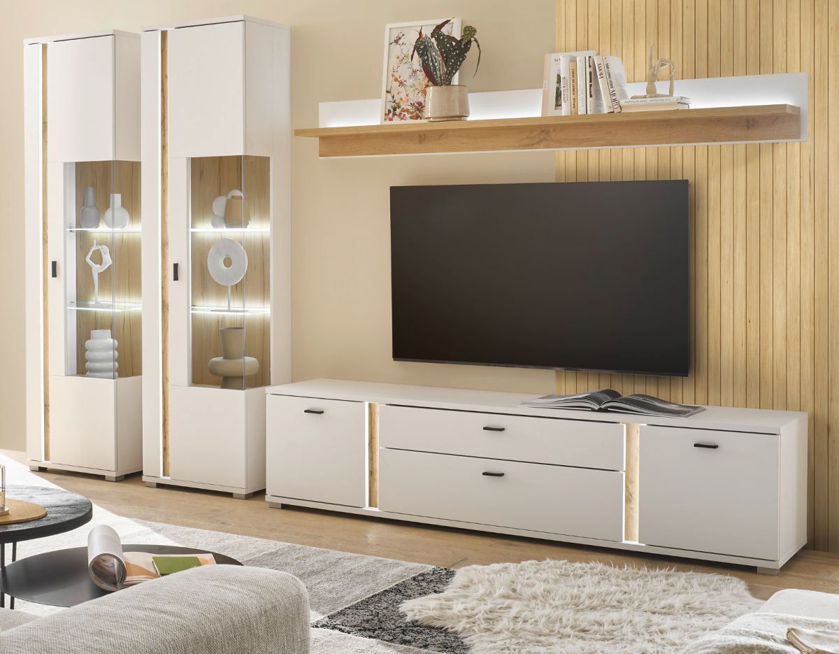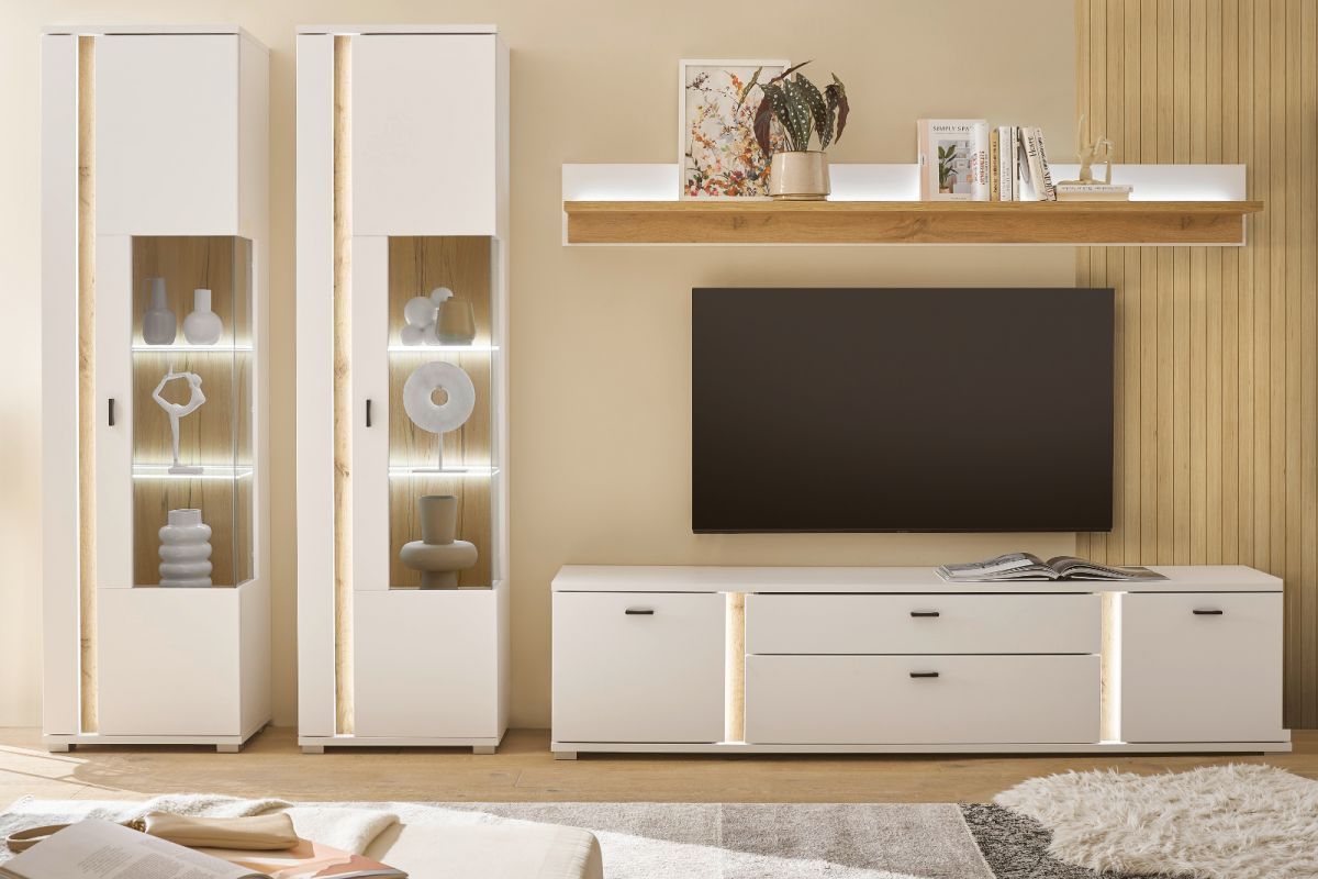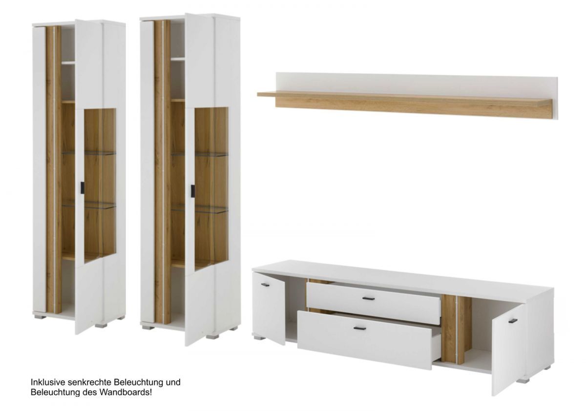 Wohnwand Anbauwand Set 4-tlg inkl Beleuchtung Soft-Close weiß matt Eiche Bellport