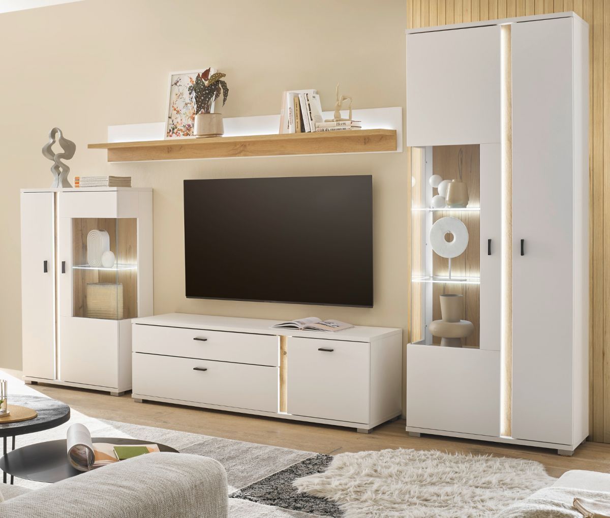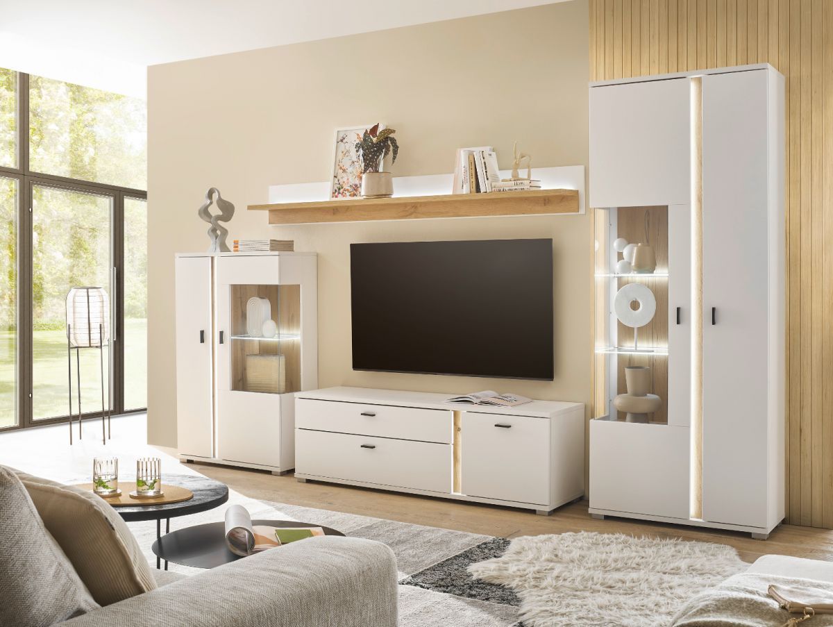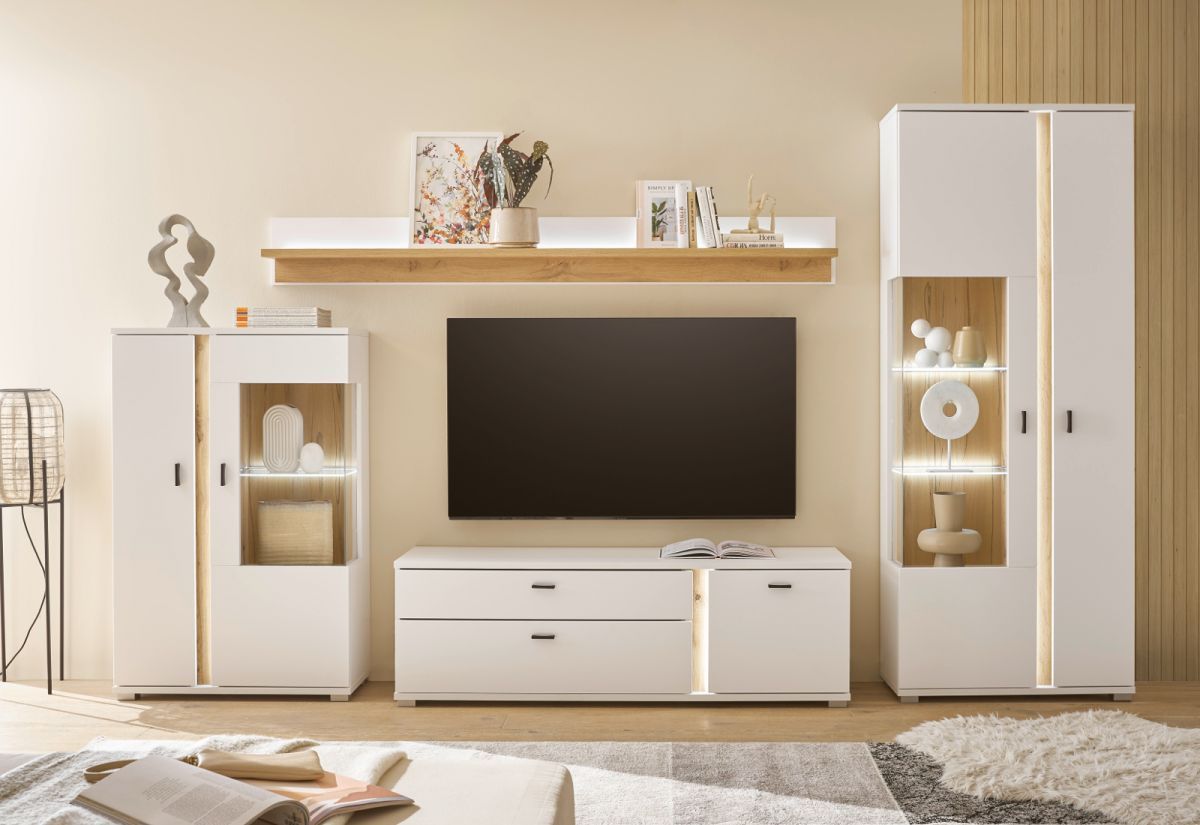 Wohnwand Anbauwand weiß matt Eiche Set 4-tlg inkl Beleuchtung Soft-Close Bellport