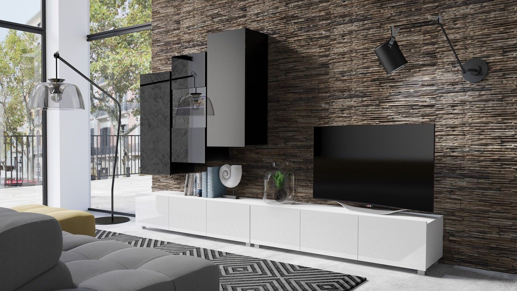 Wohnwand CALABRINI-17 Korpus: Spanplatte laminiert 16 mm, Fronten: Spanplatte laminiert in Hochglanz 15 mm, PVC-Furnier, ohne Griffe 5 cm silberne Füße optional teilweise hochglänzend (Fronten Weiß und Schwarz) 5-teilig ABS-Kanten Rückwände aus HDF-Platte LED-Beleuchtung Spezifikation Maße Hängeschr