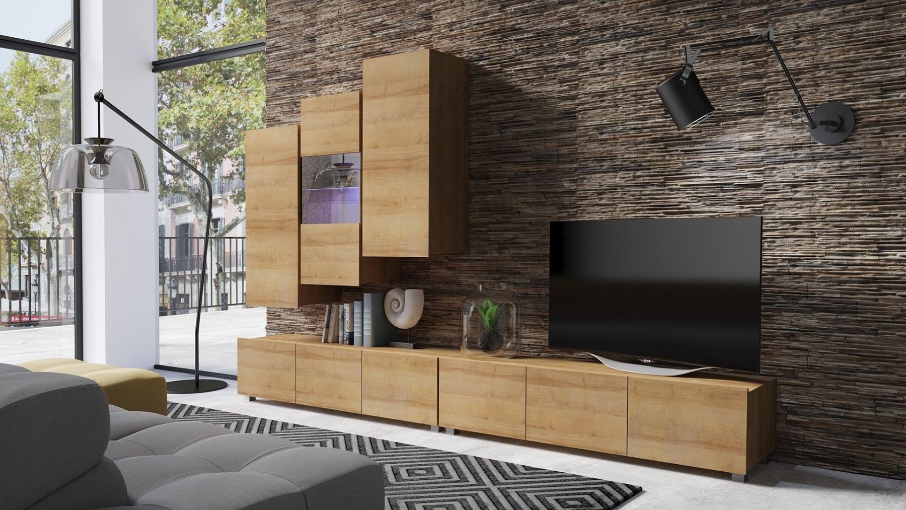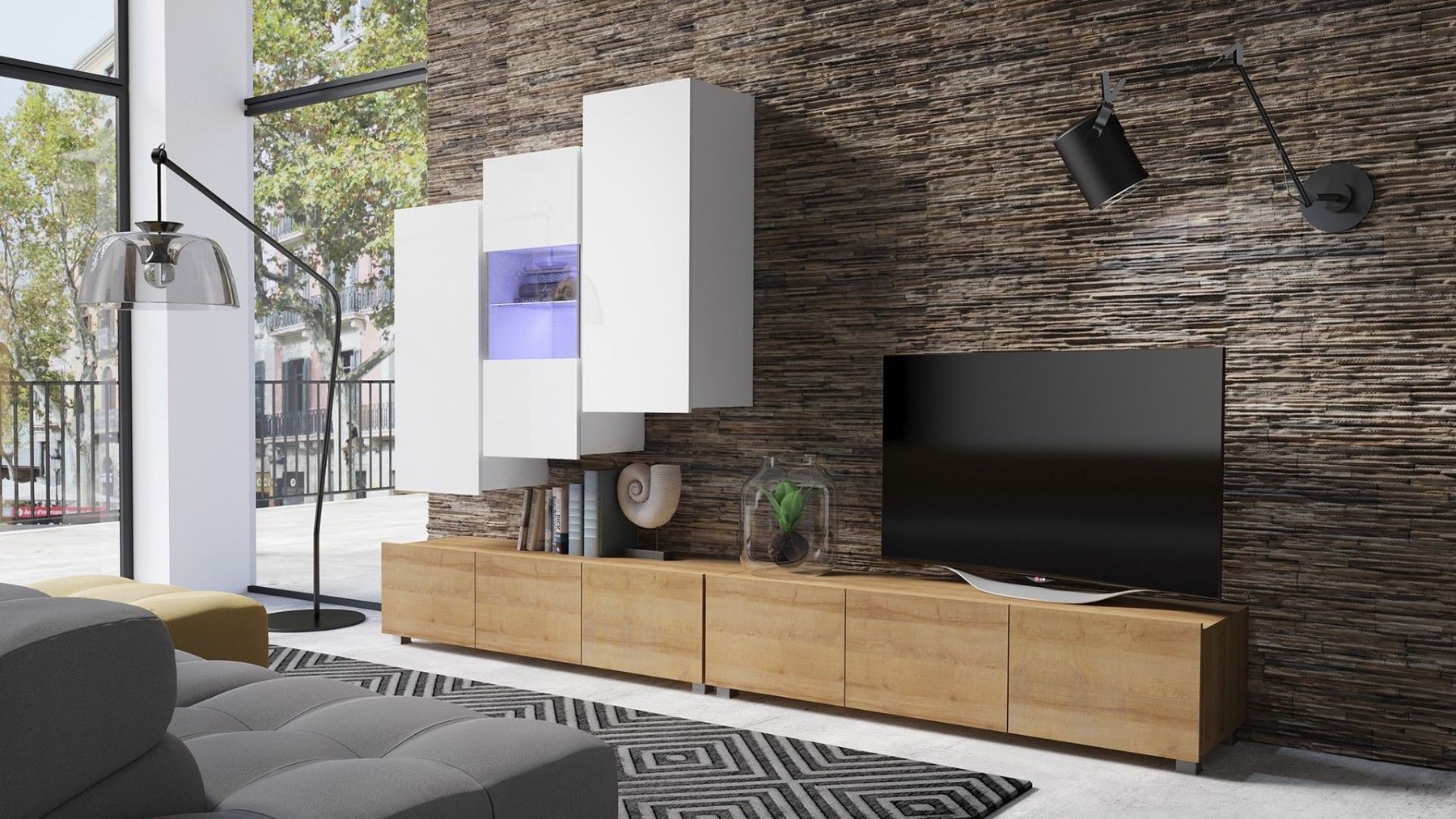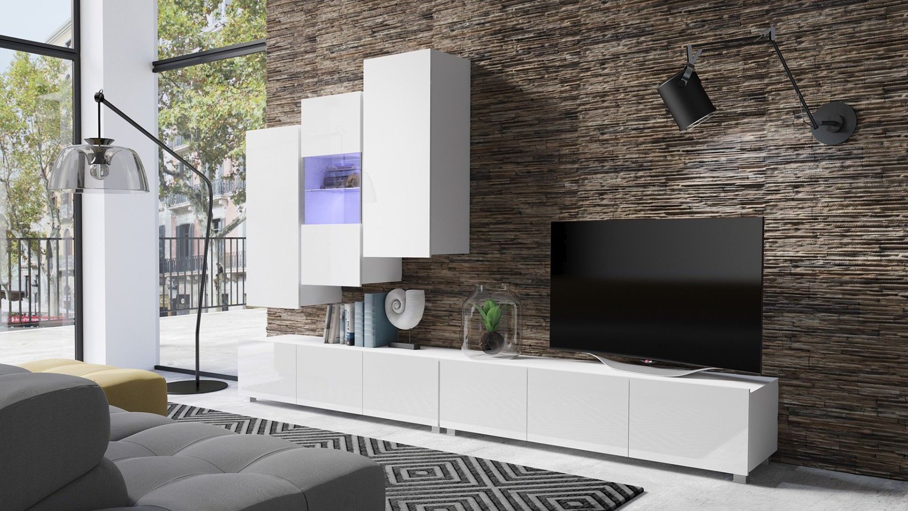 Wohnwand Calabrini-17 Wohnzimmer-Set Hängewohnwand Anbauwand Hochglanz LED