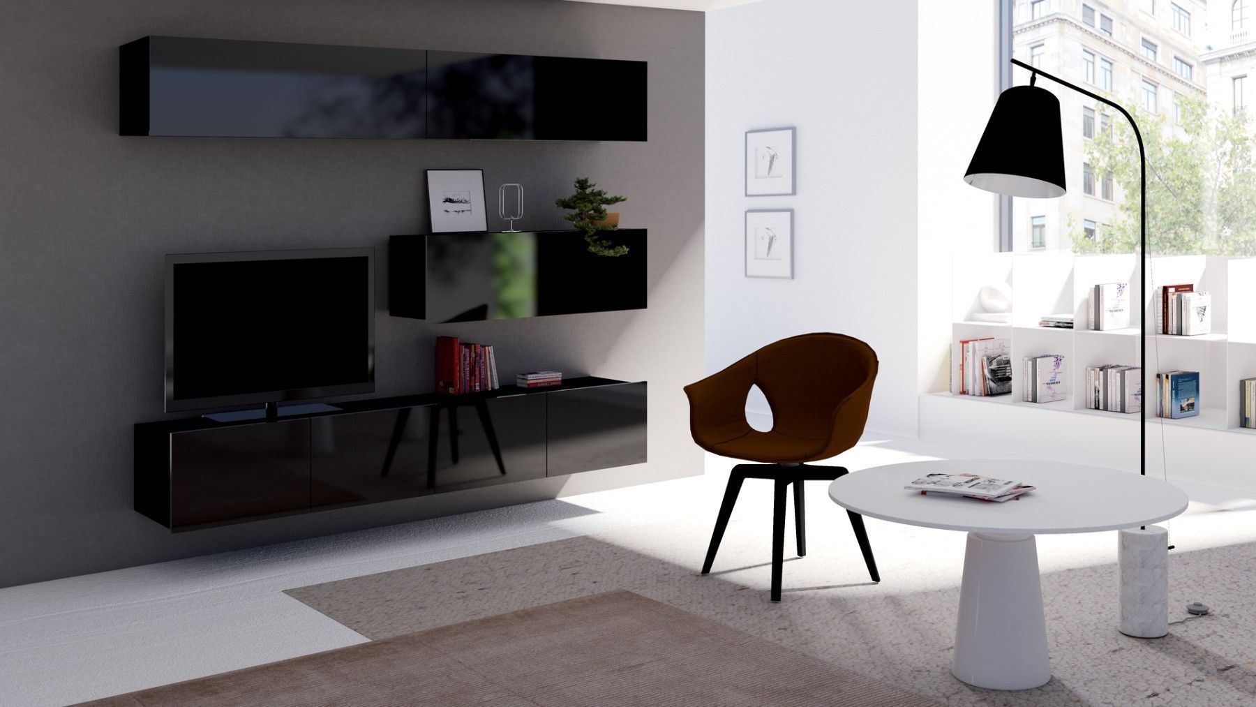 Wohnwand CALABRINI-08 Korpus: Spanplatte laminiert 16 mm, Fronten: Spanplatte laminiert in Hochglanz 15 mm, PVC-Furnier, ohne Griffe 5 cm silberne Füße optional teilweise hochglänzend (Fronten Weiß und Schwarz) 5-teilig Spezifikation Maße Hängeschrank C-10 - Breite: 105 cm, Höhe: 35 cm, Tiefe: 32 cm