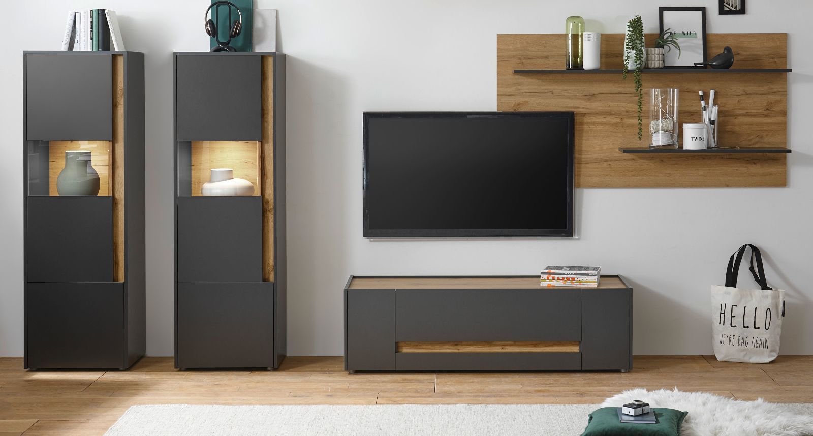 Wohnwand "Center" 4-teilig in grau matt und Eiche Wotan 340 x 170 cm