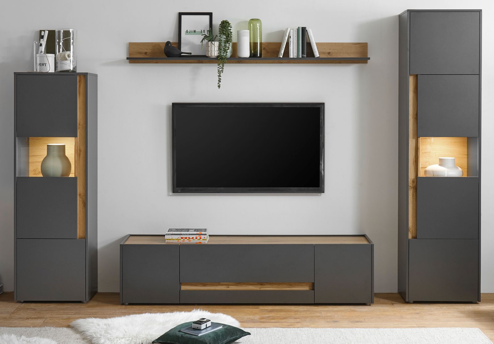 Wohnwand "Center" 4-teilig in grau matt und Wotan Eiche Wohnkombination 310 x 197 cm