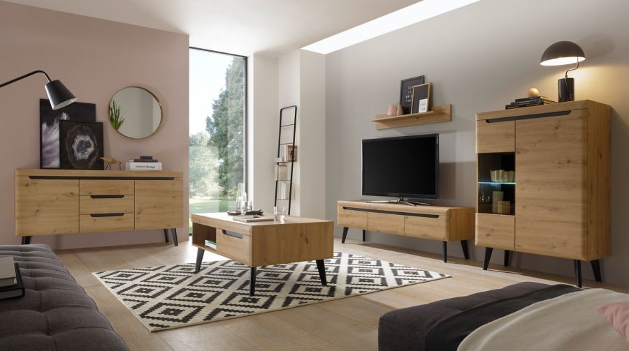 Wohnwand Eiche Artisan schwarz Wohnzimmer Set mit Highboard und TV-Lowboard Ronson