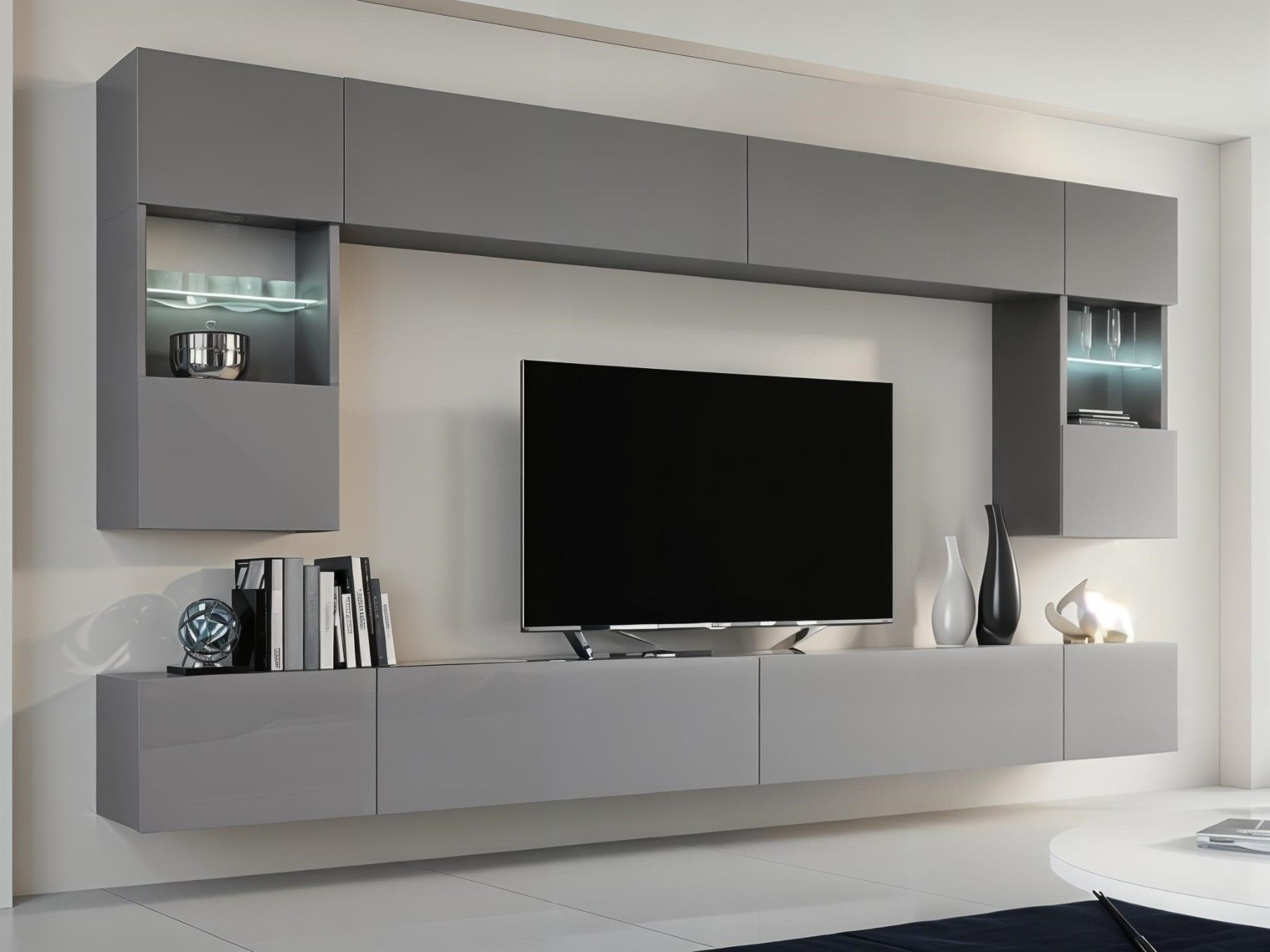 Wohnwand Flow Grau Matt – Moderne Hängeschrank-Kombination 300 cm – FSC-zertifiziert Farbe: Fronten in Grau Matt Korpus in Grau Matt Material: Fronten und Korpus aus Laminatplatte in matter Ausführung Wir verwenden ausschließlich FSC-zertifizierte Möbelplatten – für eine nachhaltig