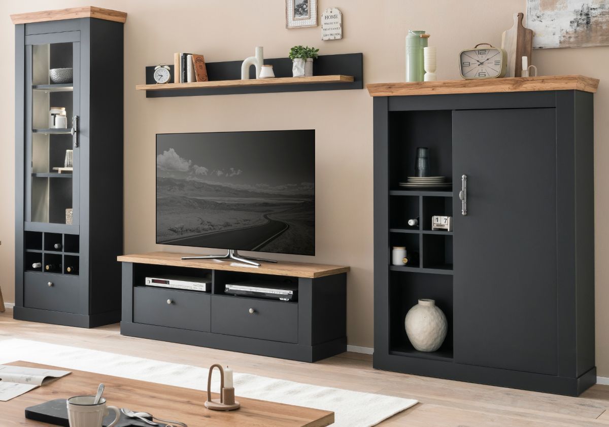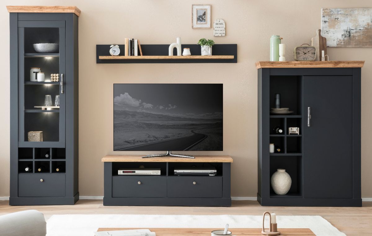 Wohnwand grau Eiche Landhaus Schrankwand mit Soft-Close Ribera Anbauwand 334 cm