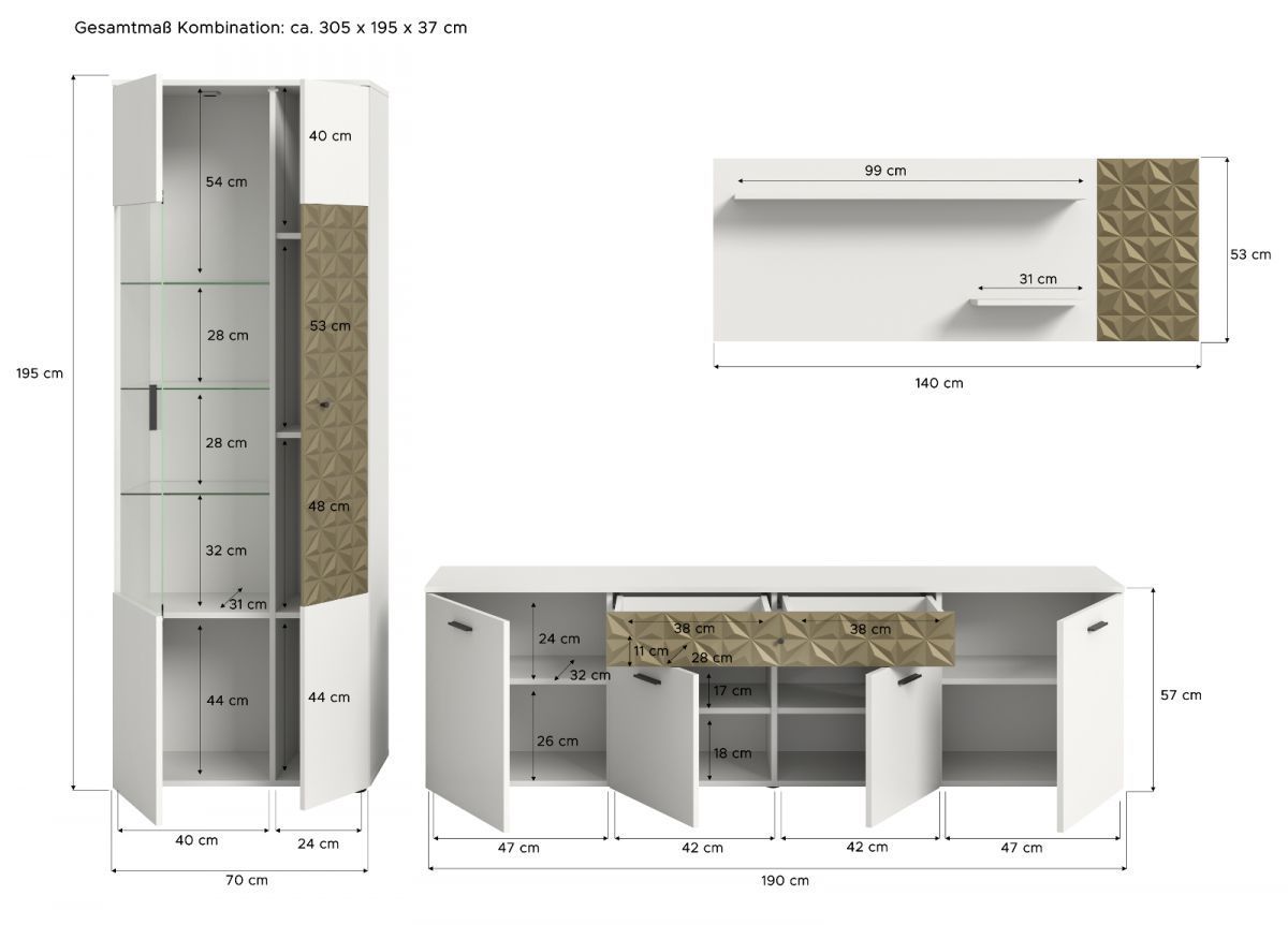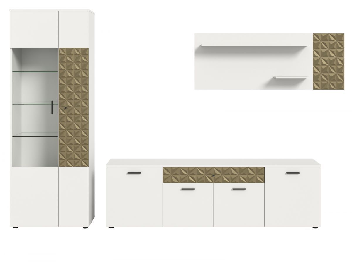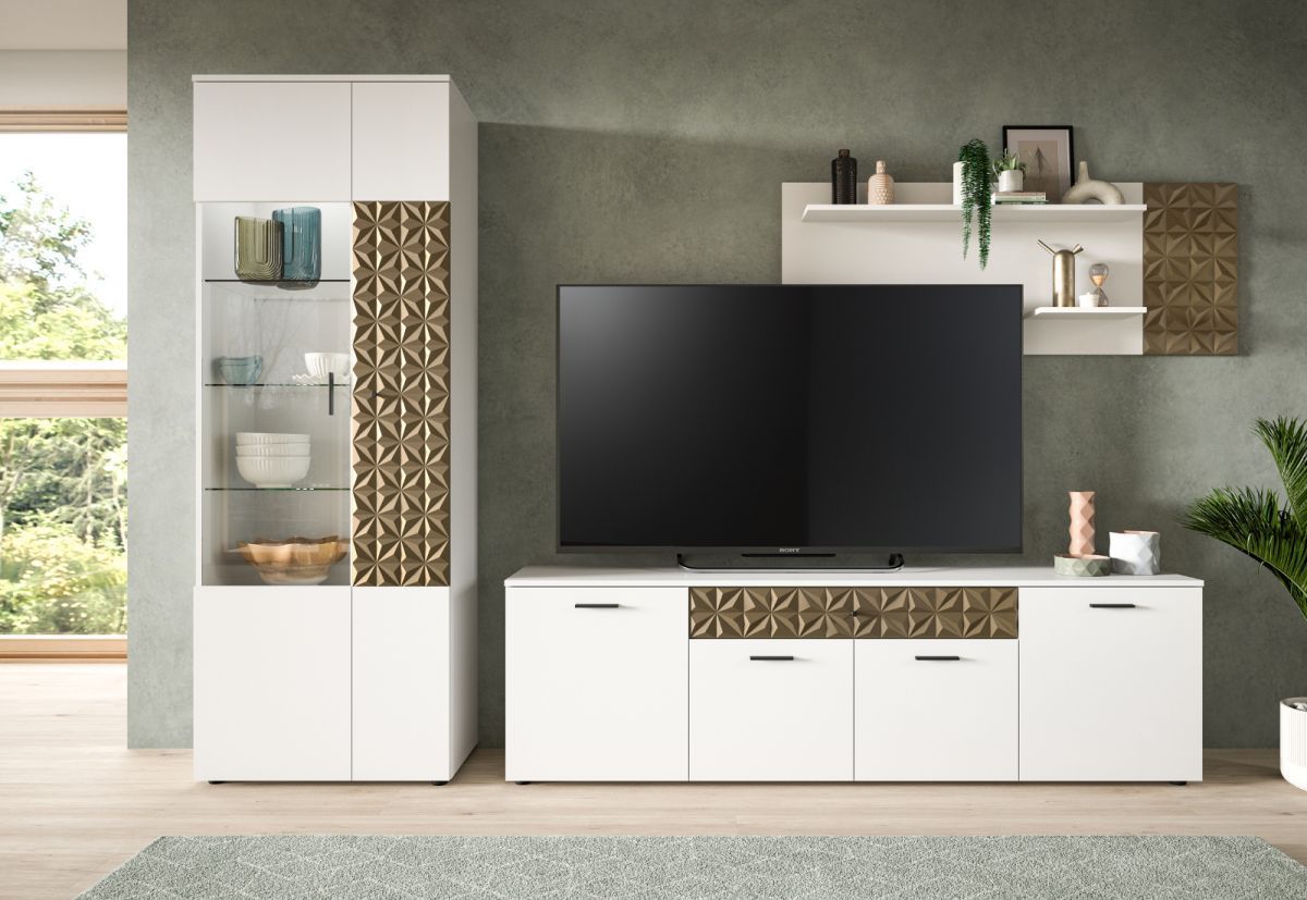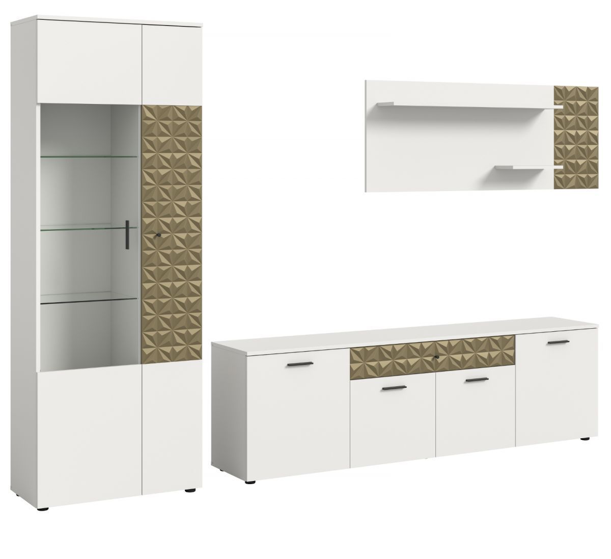 Wohnwand in weiß Gold mit 3D Struktur Wohnzimmer Schrank Set 3-tlg Schrankwand Relief
